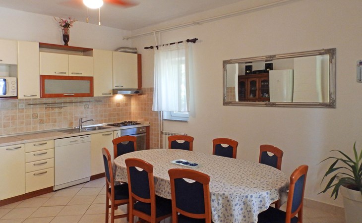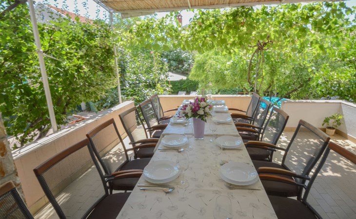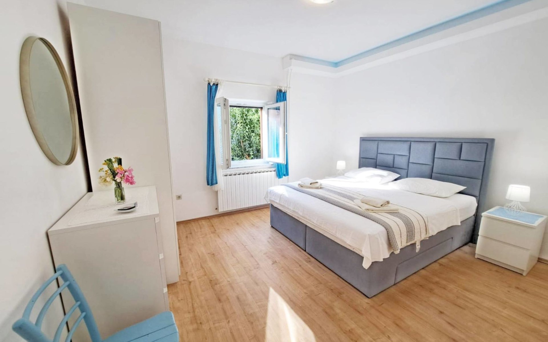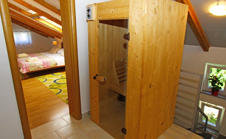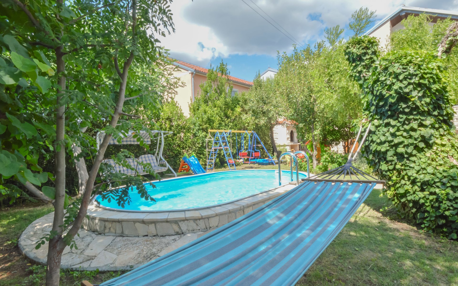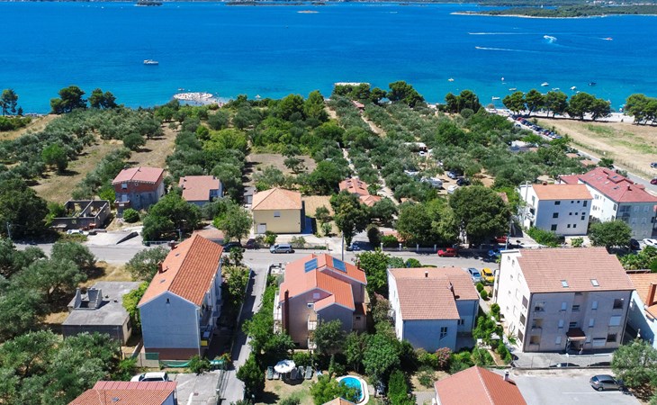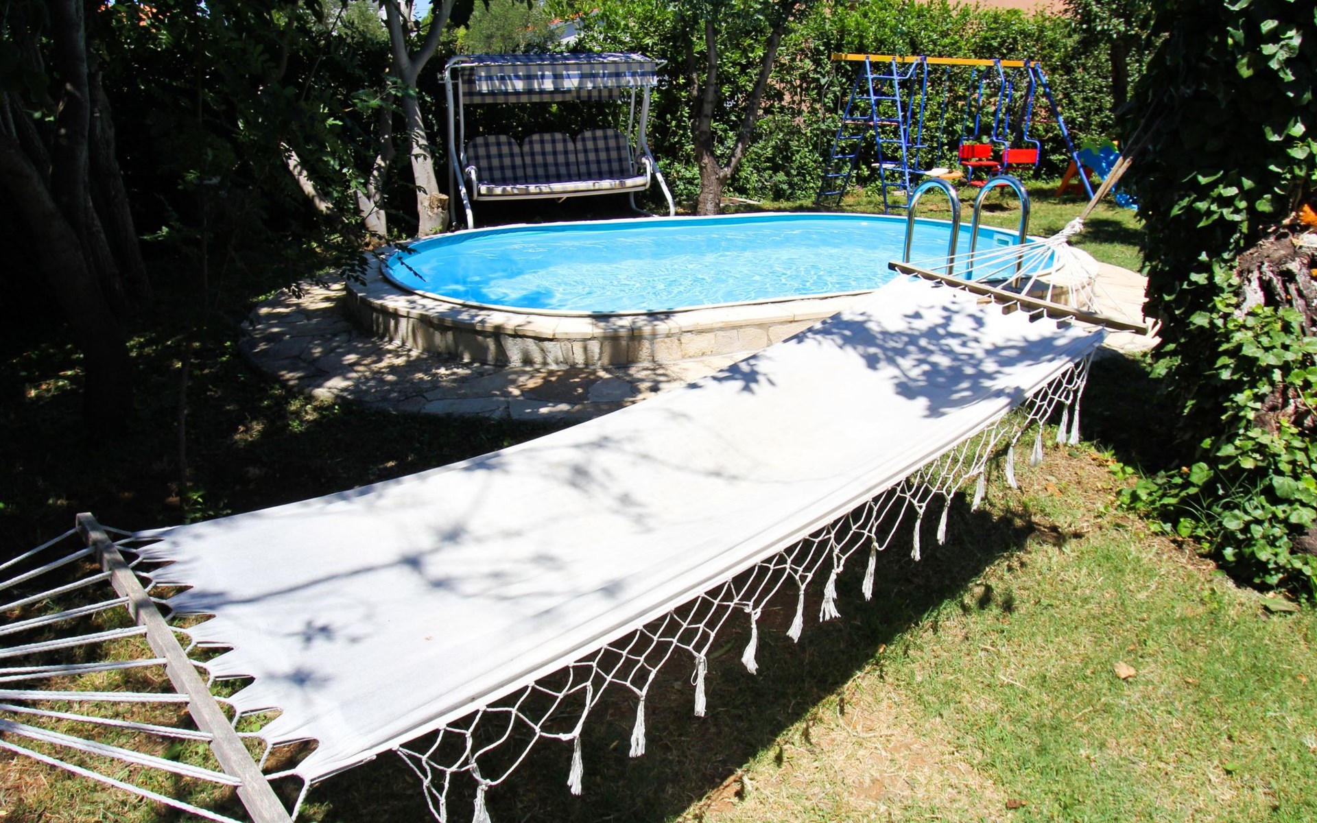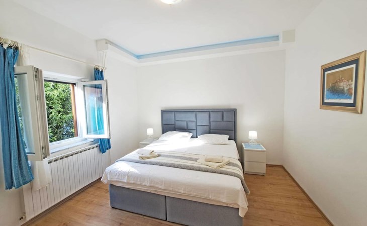 Gemütliches Einfamilienhaus "Mihovilka", auf 2 Stockwerken, renoviert im Jahre 2016. 500 m vom Zentrum, sonnige, erhöhte Lage, 250 m vom Meer, 250 m vom Strand, im Grünen. Zur Alleinbenutzung: Grundstück 1'100 m2 (eingezäunt), Garten mit Pflanzen und Bäumen, Wiese, Obstgarten, Schwimmbad (3 x 5 m, 120 cm tief, saisonale Verfügbarkeit: 01.Mai. - 15.Okt.). Aussendusche, Grillhaus, Kinderspielplatz (Rutschbahn, Schaukel, Sandkasten). Im Hause: Internetzugang, Sauna, Tischtennis, Billard. Zur Verfügung: Fahrräder (2). Parkplatz beim Haus auf dem Grundstück. Einkaufsgeschäft, Restaurant 150 m, Bushaltestelle 1.3 km, Sandstrand, Kieselstrand, Steinstrand 250 m, Tauchzentrum 5 km. Surfschule 1 km, Segelschule 1 km, Tennis 300 m, Reitstall 25 km. Nahe gelegene Sehenswürdigkeiten: amusement park 5.5 km. Ab Hof Verkauf von bäuerlichen Produkten. Ovalförmiges Schwimmbad. Ein Boot kann gemietet werden. Exkursionen mit dem Boot des Eigentümers sind möglich, extra bezahlbar. Der Eigentümer unternimmt einen kleinen Ausflug zur herzförmigen Insel "Galesnjak", auch bekannt als die Insel der Verliebten.