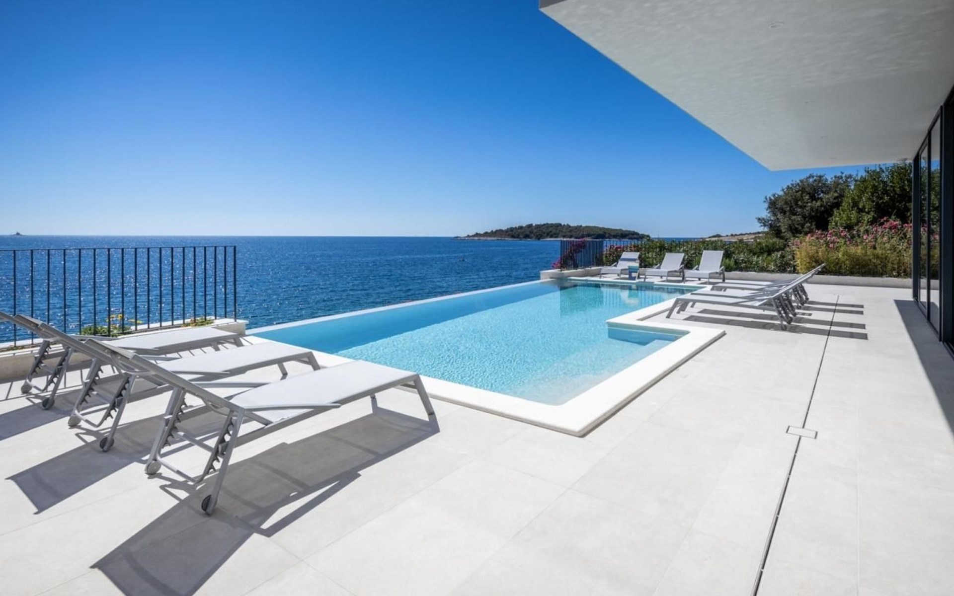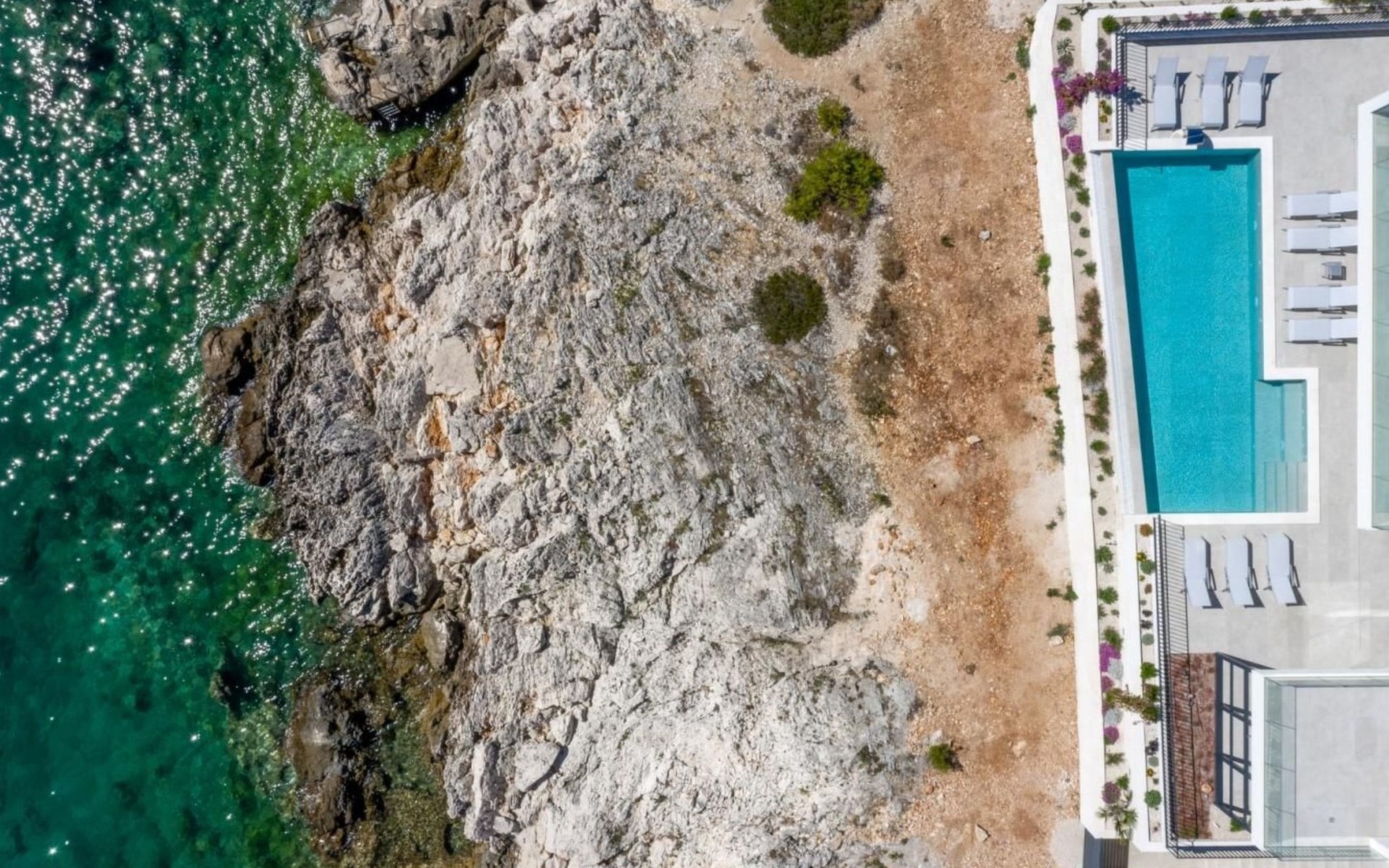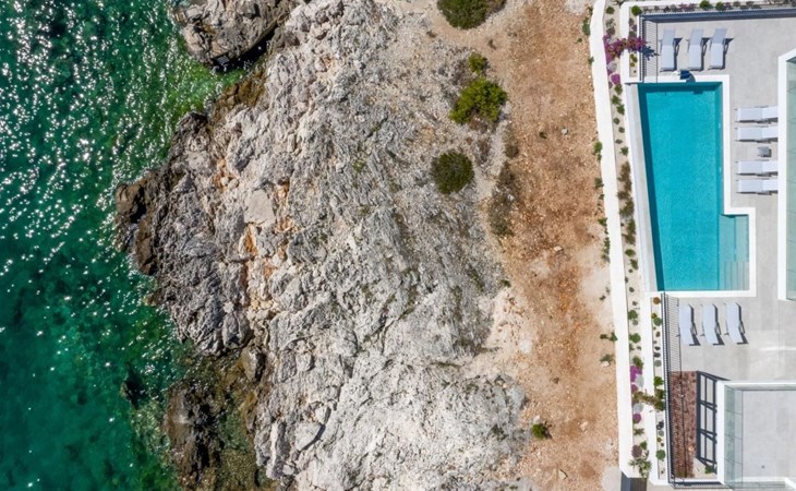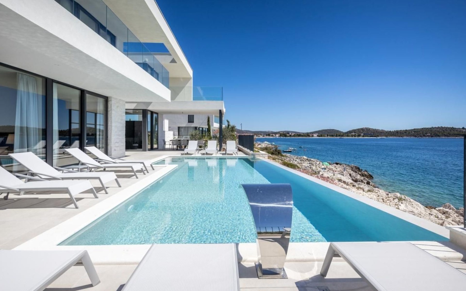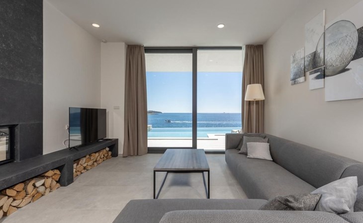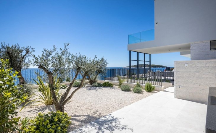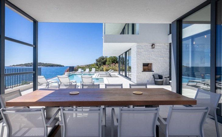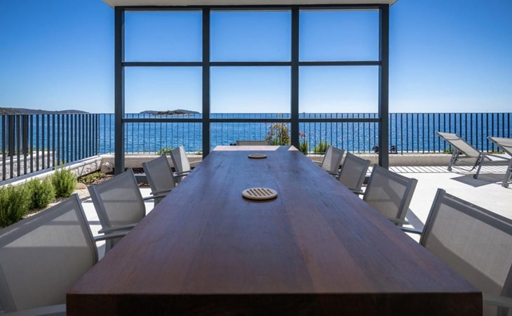 Der Ausgang zur Terrasse ist direkt vom Wohnzimmer, Esszimmer und der Küche aus möglich und draußen können Sie auf Liegestühlen am Pool mit Meerwasser bei einem erfrischenden Cocktail oder einer Tasse Kaffee entspannen und Familie und Freunde im Esszimmer im Freien beisammen haben Ein Glas Wein und ein im traditionellen dalmatinischen Stil zubereitetes Essen im Kamin werden unvergesslich sein.