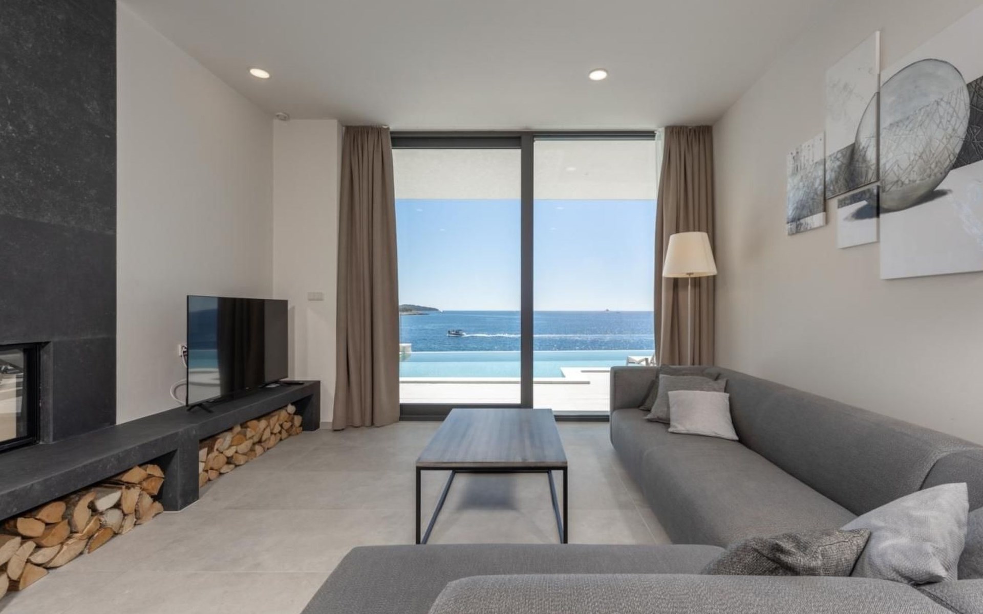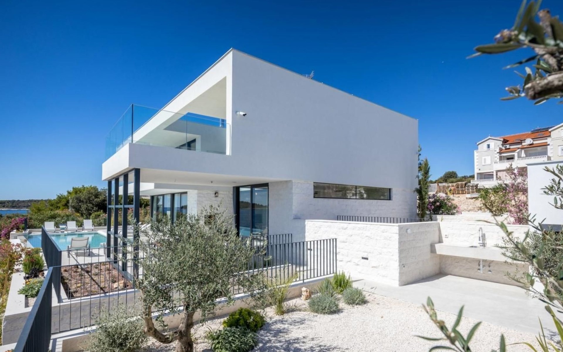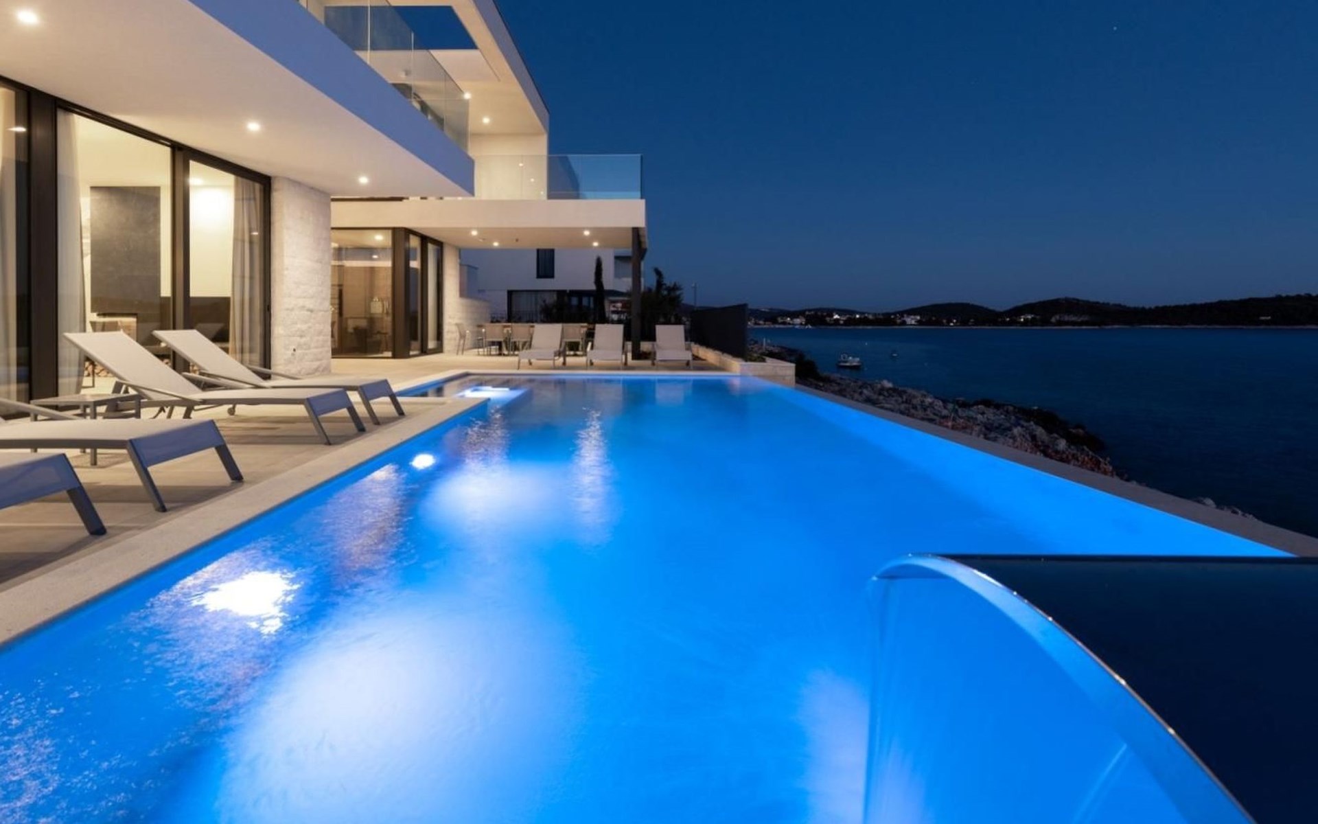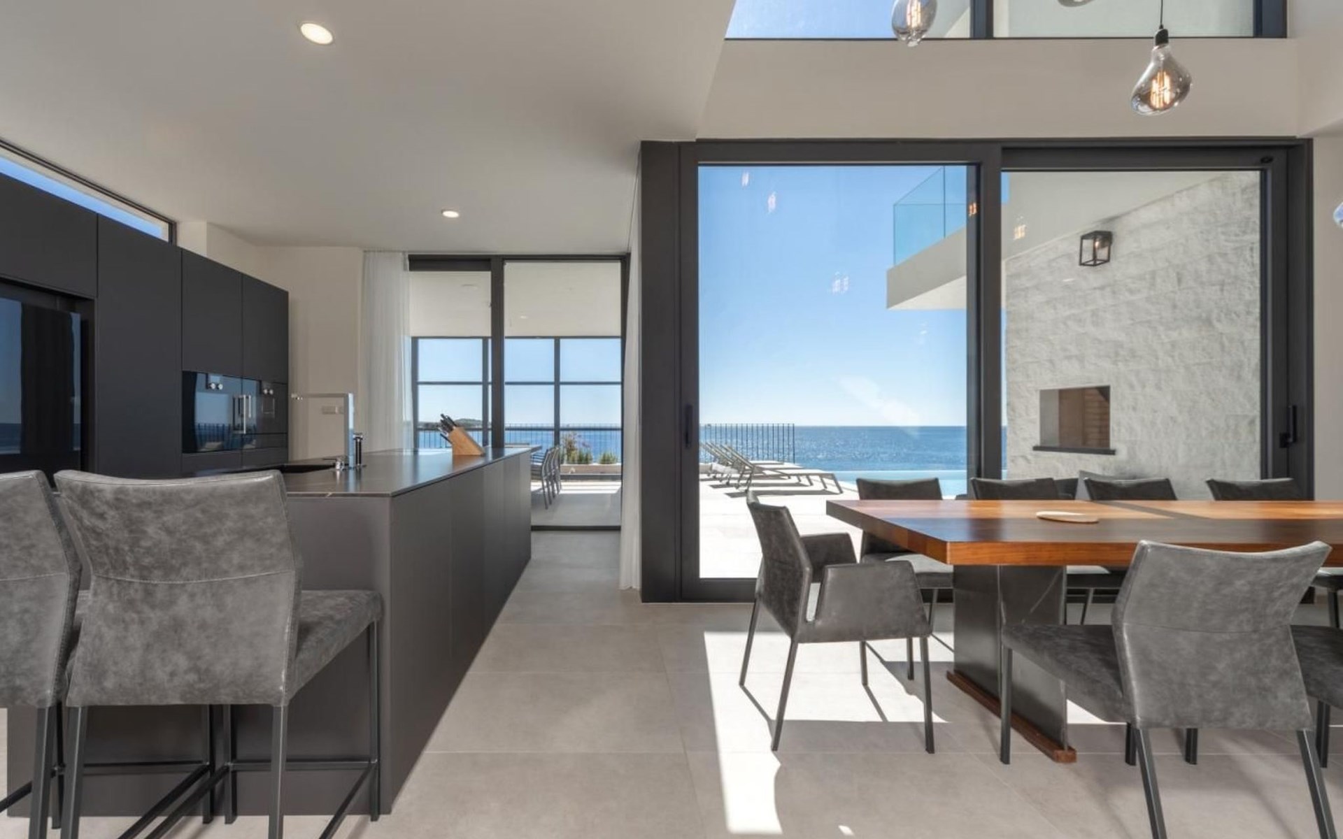Der Ausgang zur Terrasse ist direkt vom Wohnzimmer, Esszimmer und der Küche aus möglich und draußen können Sie auf Liegestühlen am Pool mit Meerwasser bei einem erfrischenden Cocktail oder einer Tasse Kaffee entspannen und Familie und Freunde im Esszimmer im Freien beisammen haben Ein Glas Wein und ein im traditionellen dalmatinischen Stil zubereitetes Essen im Kamin werden unvergesslich sein.