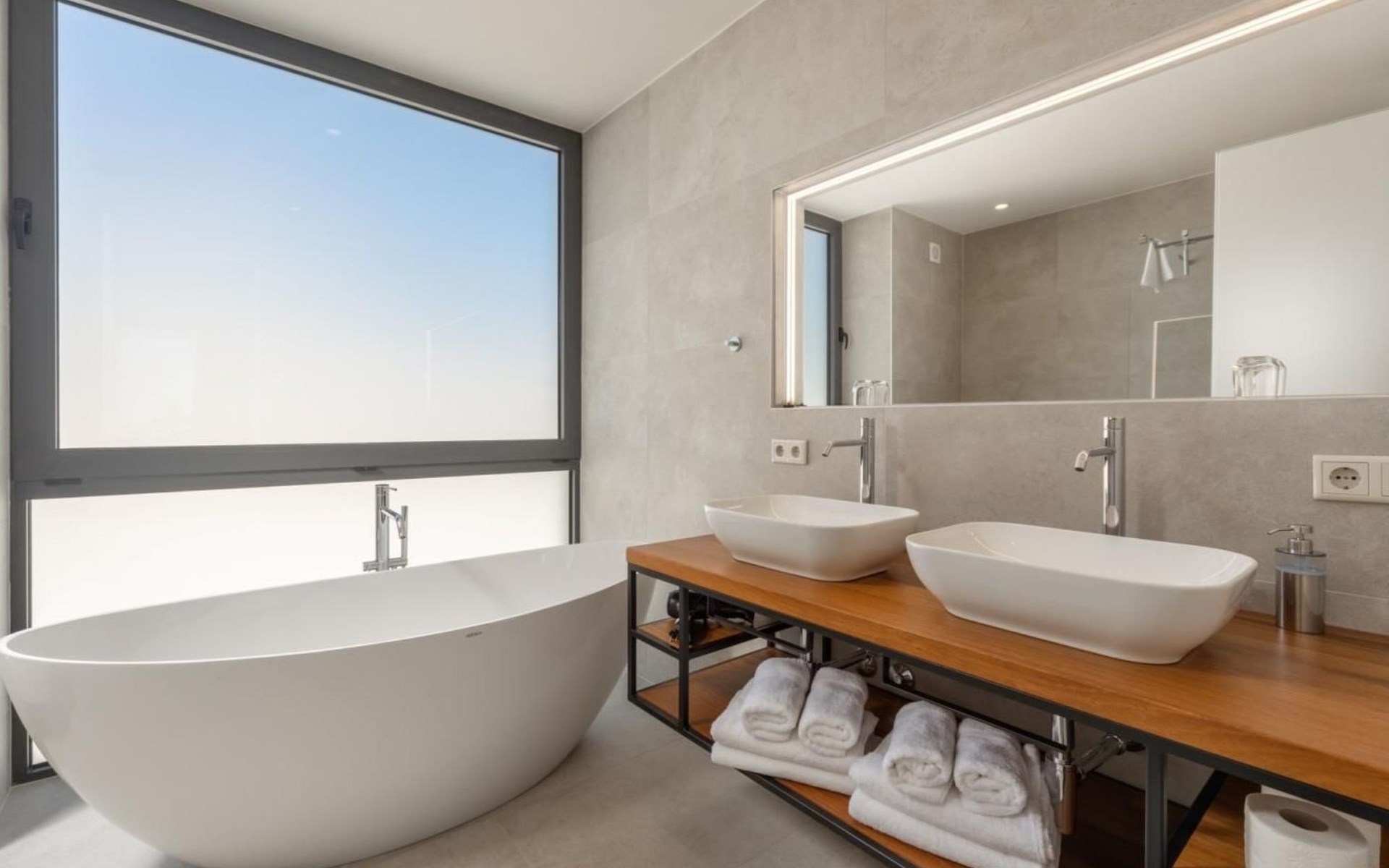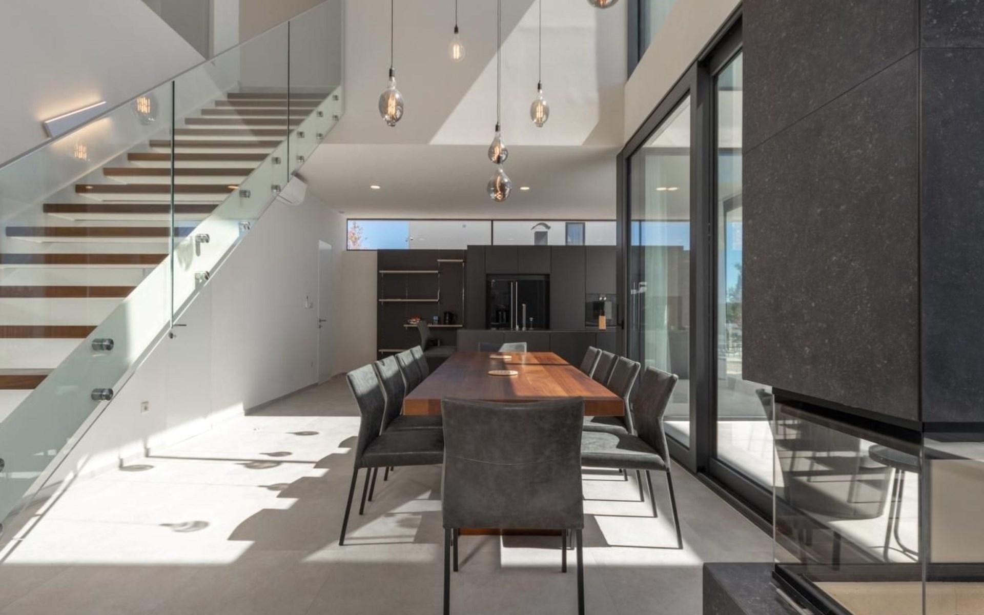 Jedes Zimmer verfügt über ein eigenes Badezimmer. Der großzügige Innenraum zeichnet sich durch ein offenes Raumkonzept und modernes Design mit luxuriösen Möbeln in neutralen Farben aus. Im Erdgeschoss können Sie in der luxuriösen, voll ausgestatteten Küche Mahlzeiten zubereiten oder im Wohnzimmer entspannen, wo es auch einen schönen Kamin gibt.