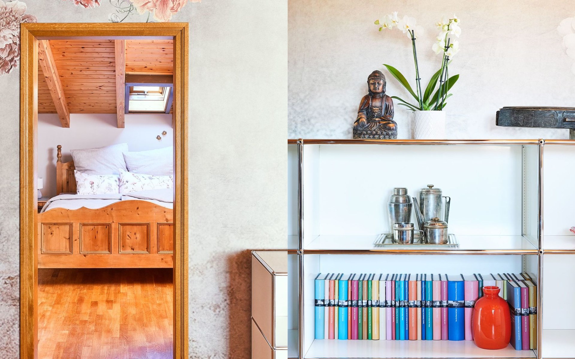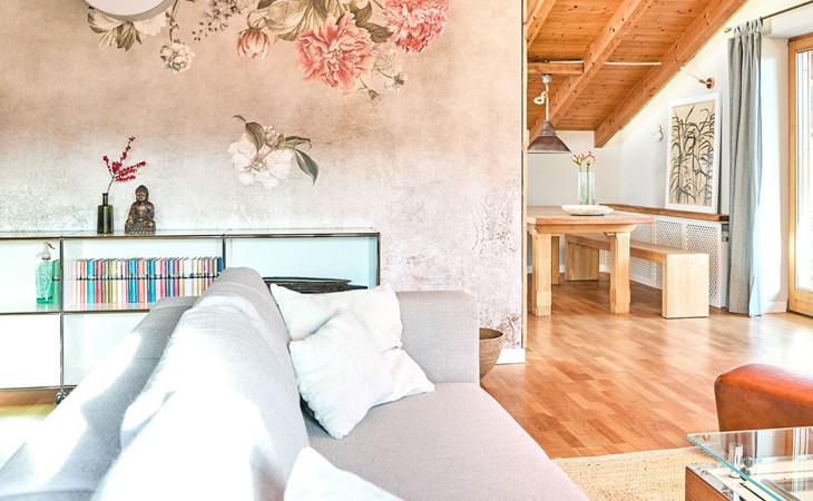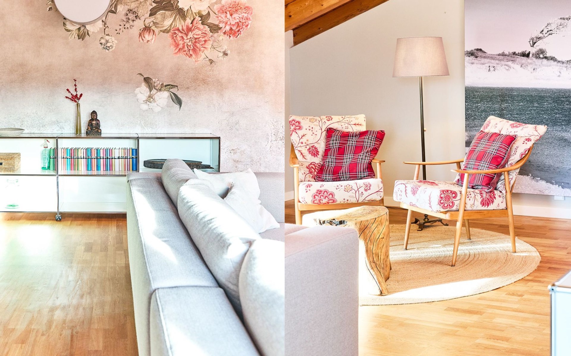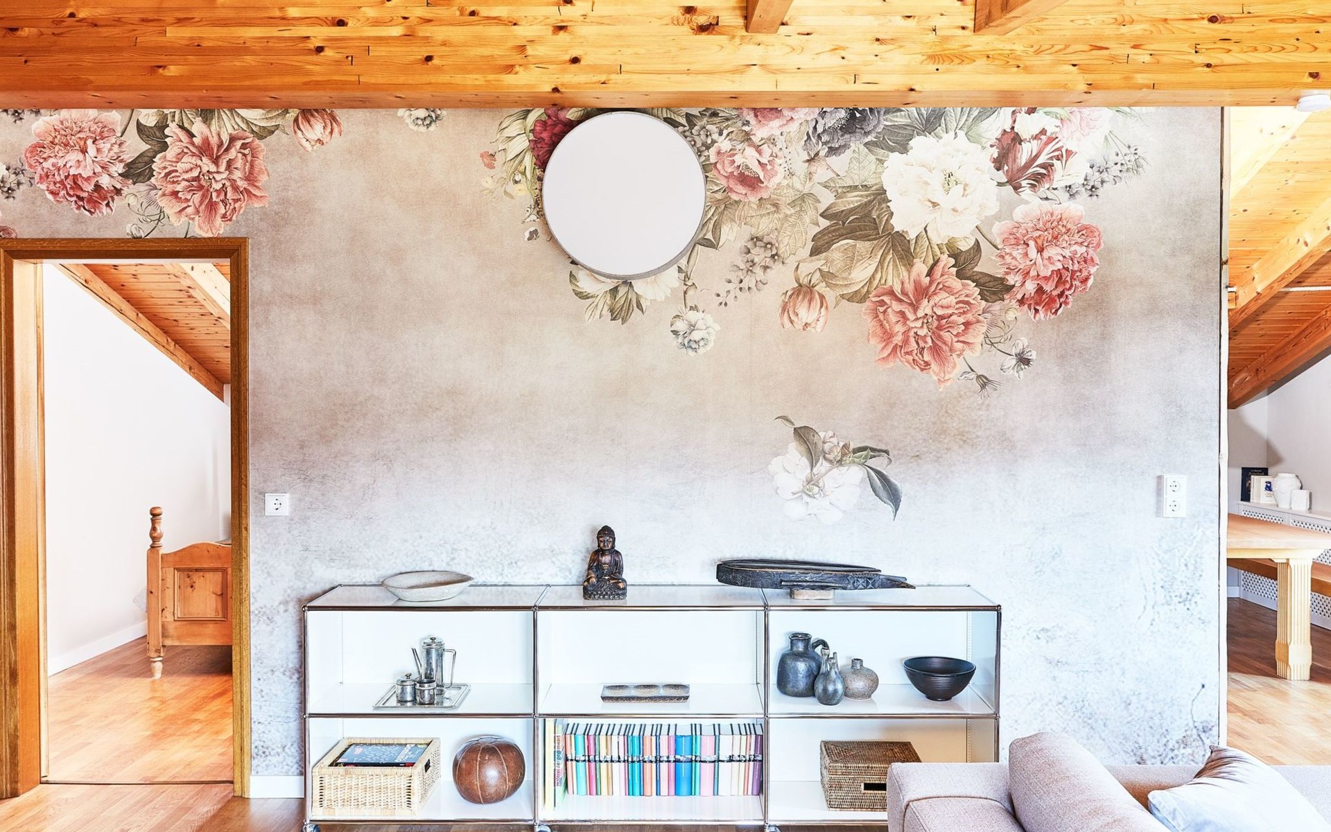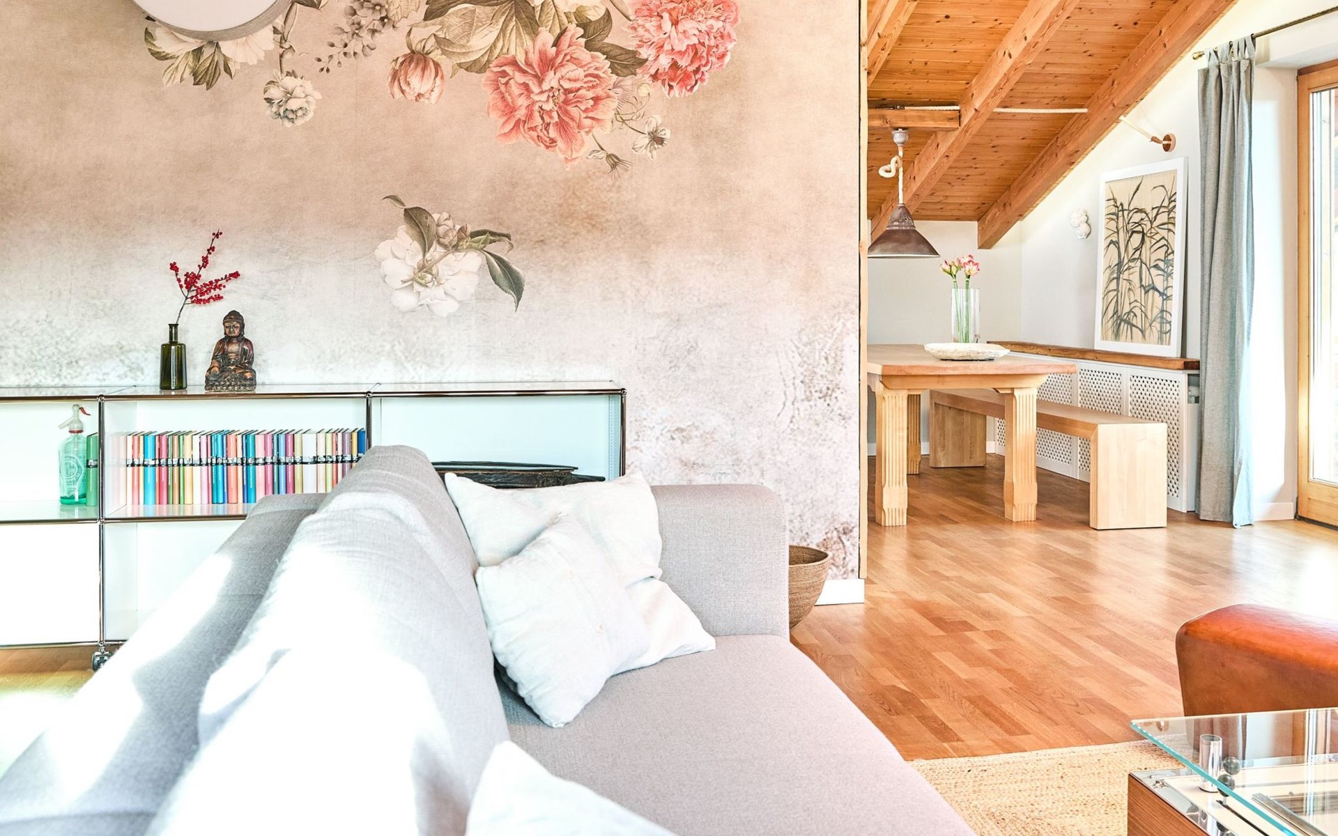 Der großzügige Wohnraum mit bequemen Sofa-Chaiselounge-Kombination und Leseecke wird durch die außergewöhnliche Pfingstrosen-Tapete stilvoll abrundet. Das Regal mit der kleinen Bibliothek aus Büchern und Magazinen lädt zum Stöbern ein.