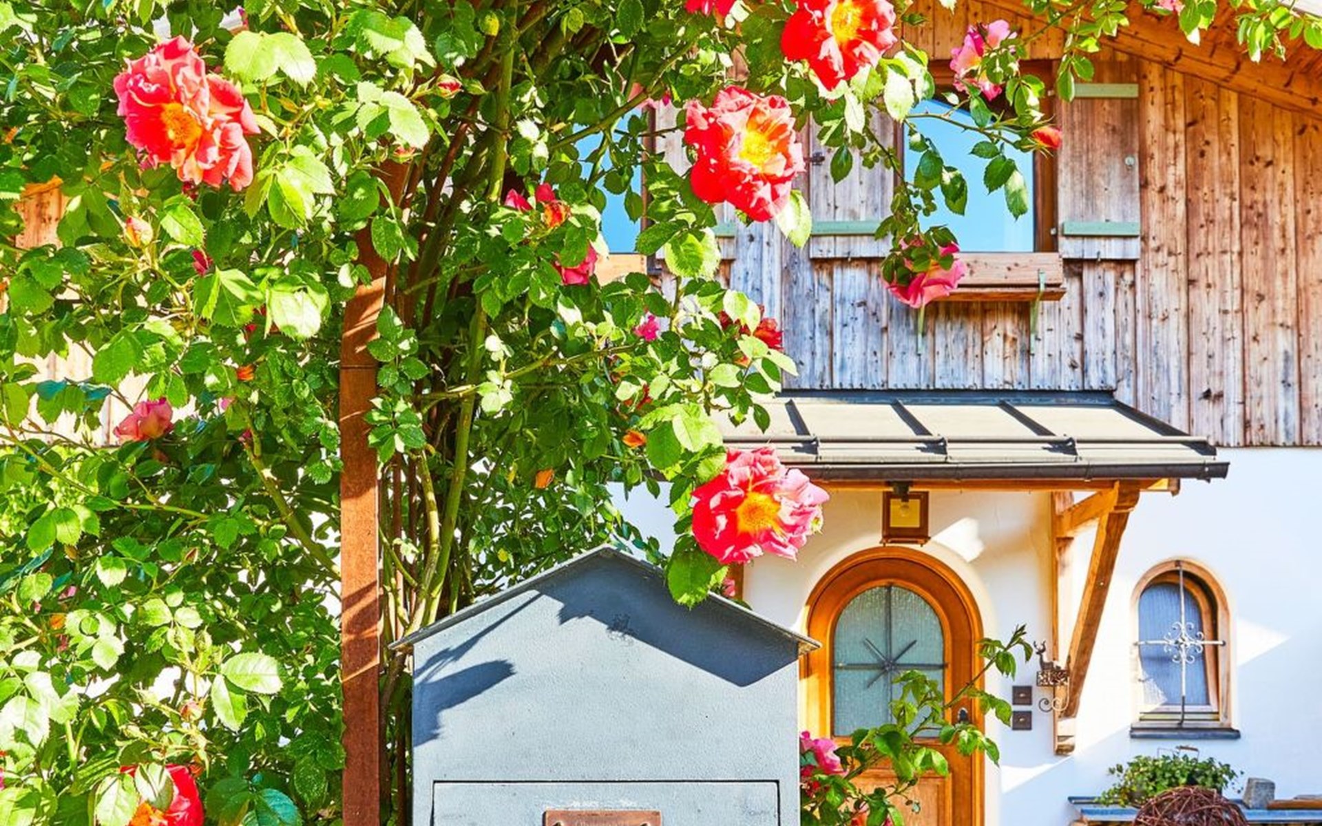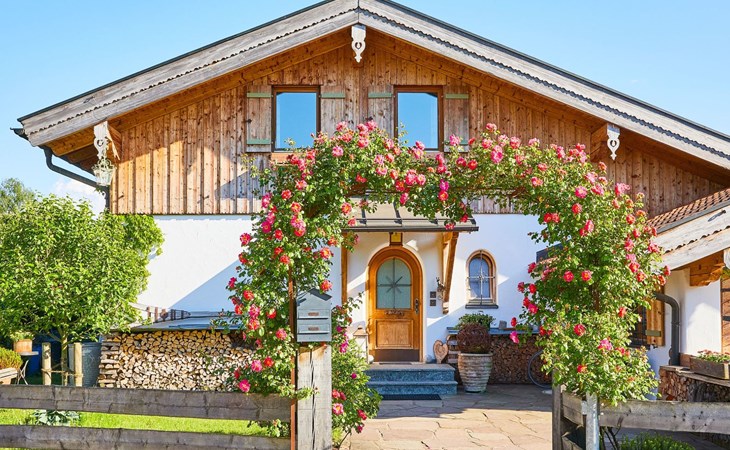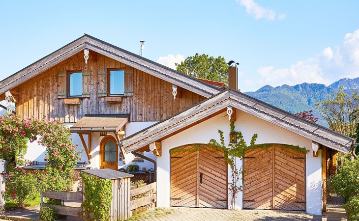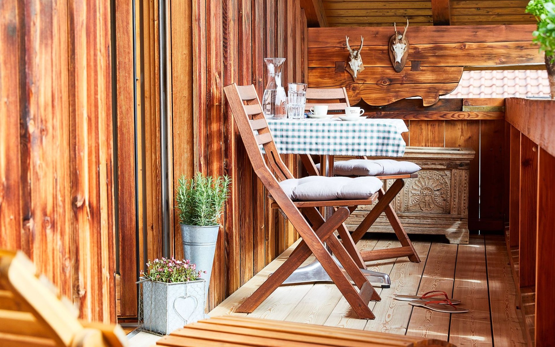 Im Außenbereich wartet ein wettergeschützter, großer Süd-Balkon mit atemberaubendem Blick auf die Chiemgauer Alpen. Hier kann der Tag mit einem entspannten Frühstück in der Morgensonne ideal begonnen werden. Der Balkon ergänzt damit perfekt das Wohlfühlambiente der Ferienwohnung.