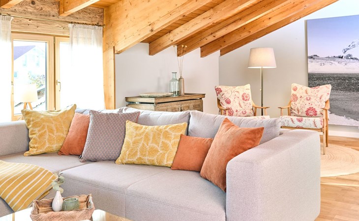 Die ca. 75 m² große DG-Ferienwohnung bietet ausreichend Raum für 2 Personen und schafft durch die komfortabel Innenausstattung mit viel Holz eine behagliche und positive Atmosphäre, in der man sich sofort zuhause fühlt – kein Hotelcharme, sondern ein Zuhause fernab vom Alltag.