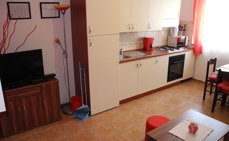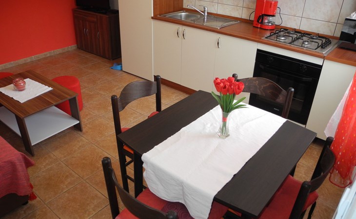 Das gemütliche Apartment im 2. Stock ist so konzipiert, dass bis zu 3 Personen bequem Platz finden. Die Aufteilung umfasst ein gut ausgestattetes Schlafzimmer, das einen erholsamen Schlaf garantiert. Das Herzstück der Wohnung ist der Küchen- und Wohnbereich mit einer bequemen Schlafcouch für einen weiteren Gast. Der Raum ist mit den wichtigsten Geräten wie einem Gasherd, einer Kaffeemaschine und einem Wasserkocher ausgestattet, so dass alle Ihre kulinarischen Bedürfnisse erfüllt werden. Für Unterhaltung und Konnektivität ist mit Sat-TV und Internetzugang gesorgt. Das Badezimmer ist mit einer Dusche ausgestattet, die einen erfrischenden Start oder Abschluss des Tages ermöglicht.