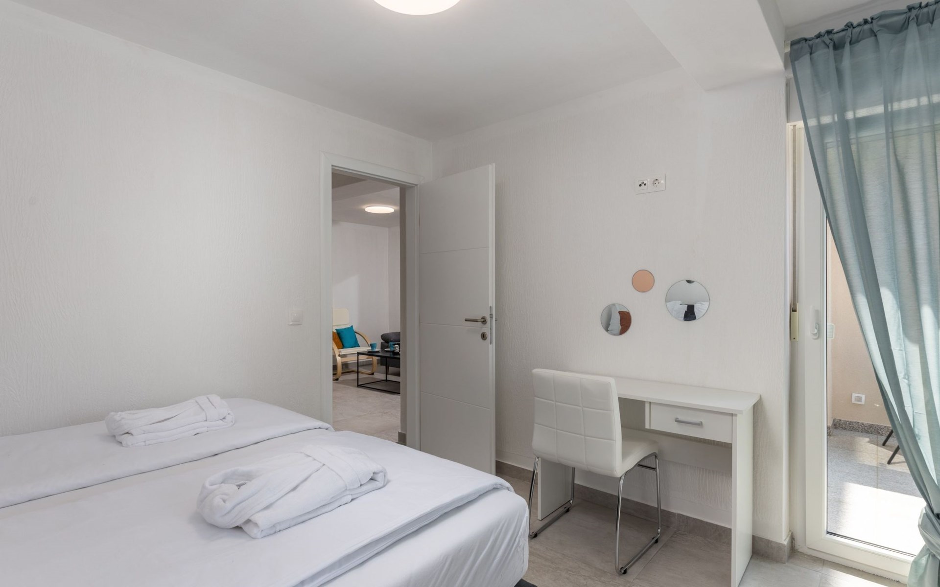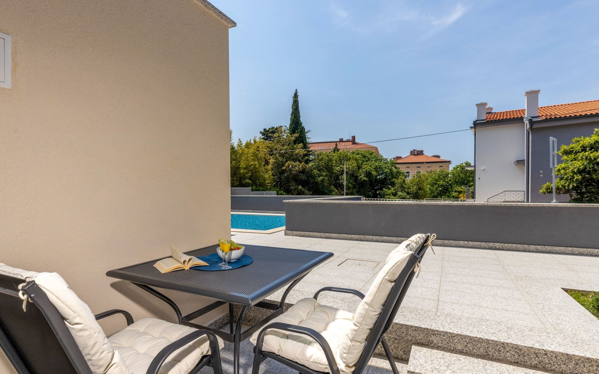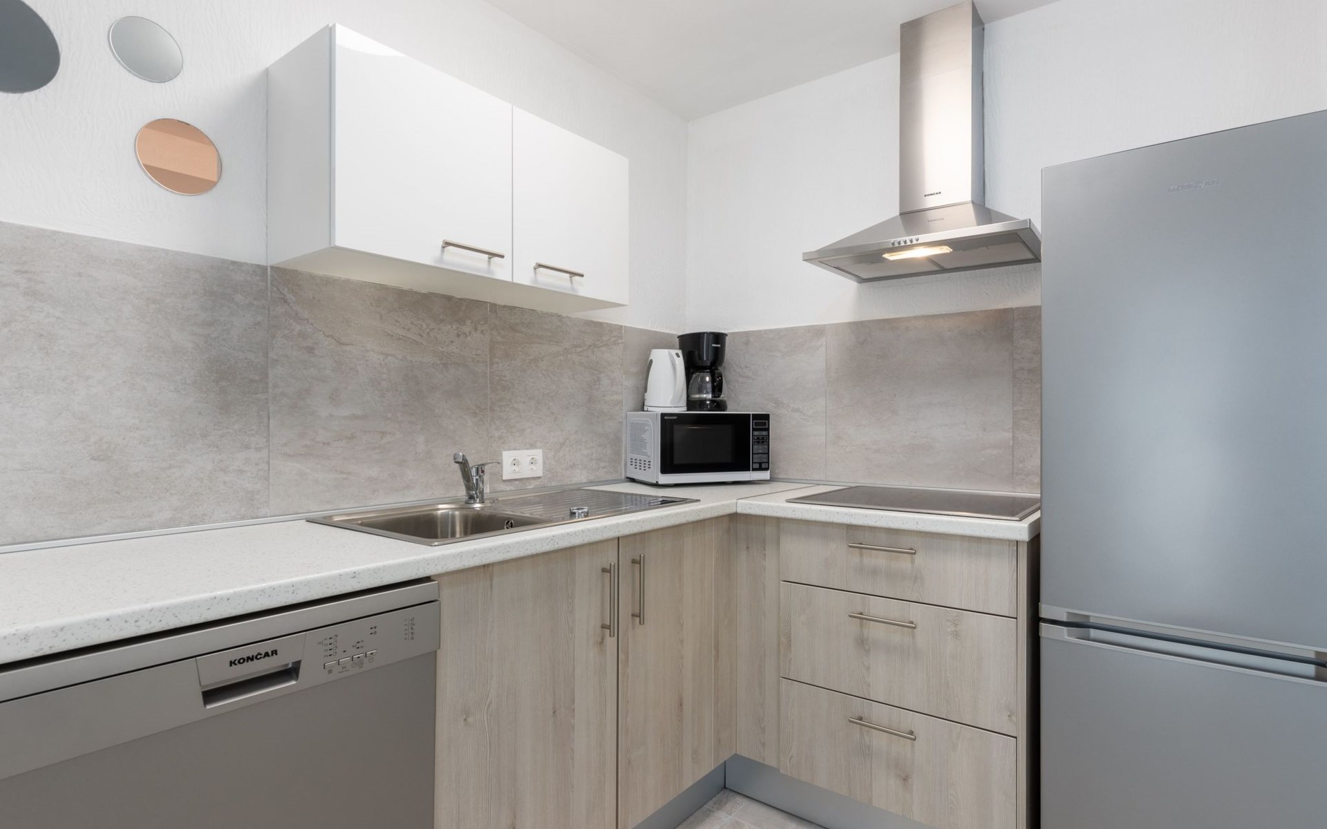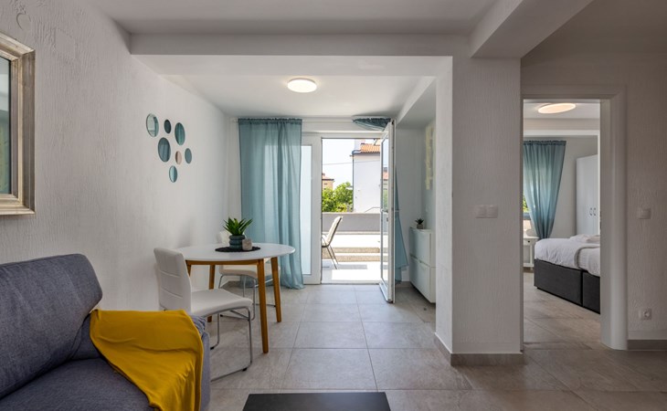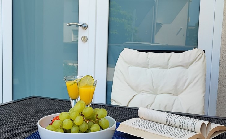 Die Wohnung hat 1 Schlafzimmer, Badezimmer mit Duschen, Waschbecken und Waschmaschinen. Das Wohnzimmer ist Teil der Küche, wo Sie einen bequemen Stuhl zum Ausruhen und Esstisch mit sehr bequemen Stühlen, eine kleine, aber gut ausgestattete Küche zu finden. Vom Wohnzimmer aus gibt es einen Ausgang zu einer schönen Terrasse mit Tisch und Stühlen und direktem Zugang zum Pool, so dass Sie Ihr morgendliches Frühstück oder das abendliche Grillen auf der Terrasse auf dem elektrischen Grill genießen können, den Sie auch in der Wohnung finden können. Der Blick auf das schöne Schwimmbad und die Liegewiese wird Sie sprachlos machen.
