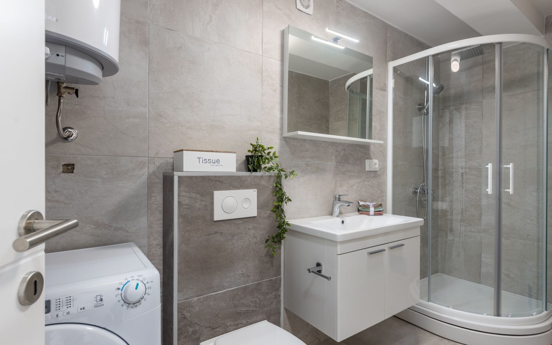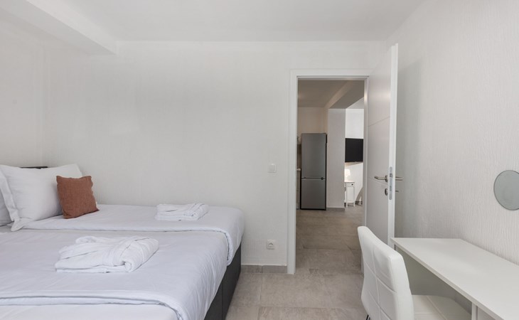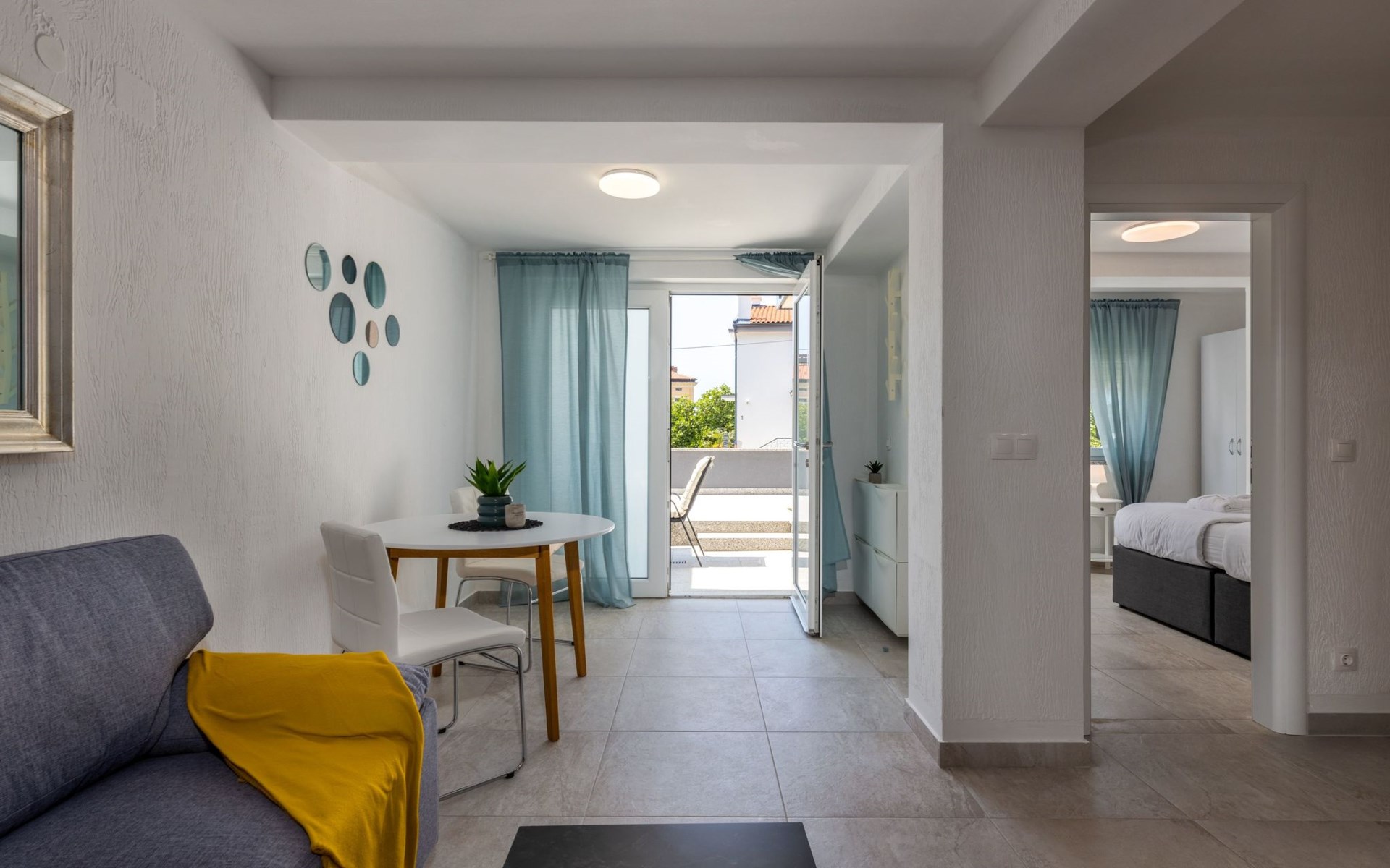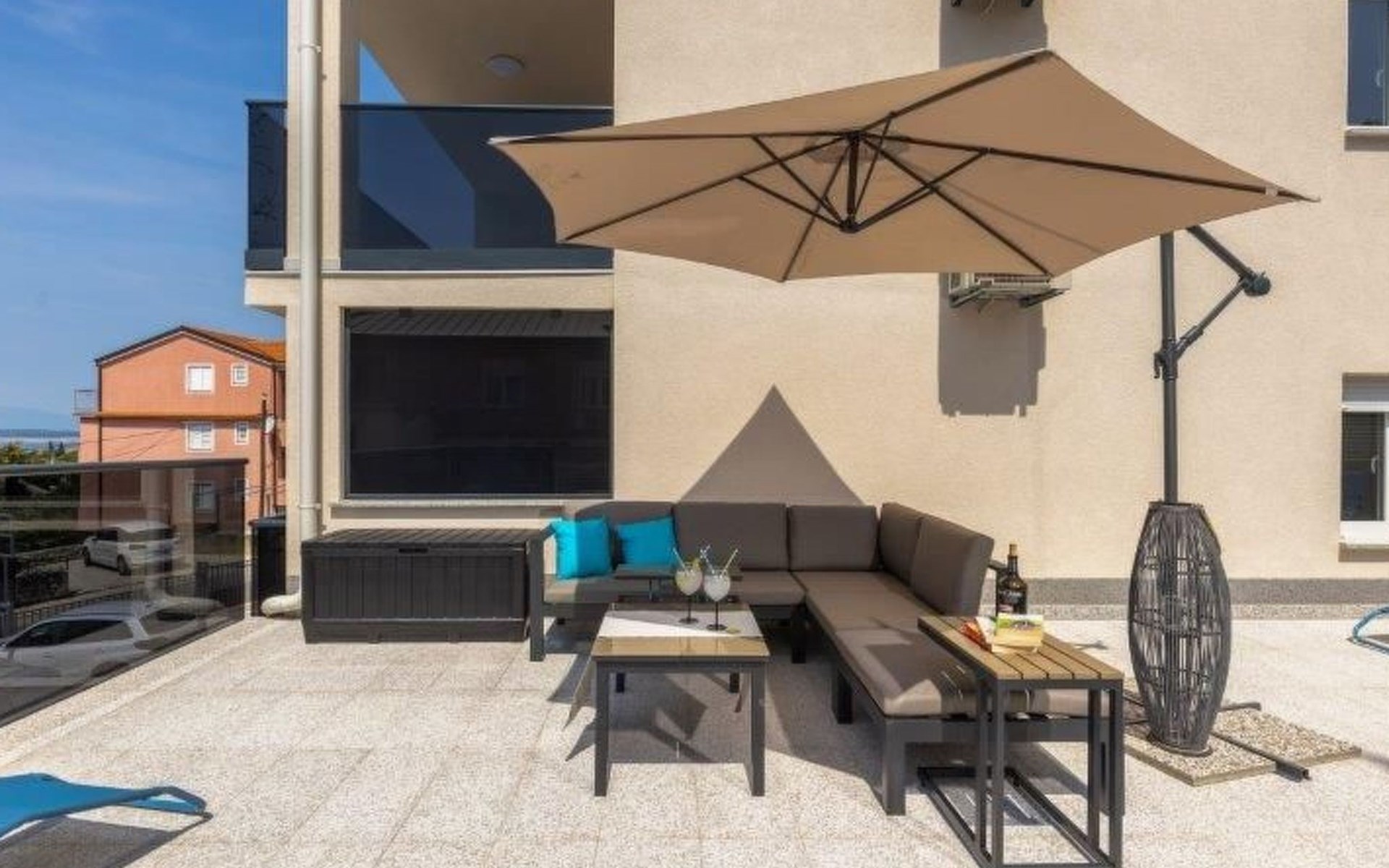 Die Wohnung hat 1 Schlafzimmer, Badezimmer mit Duschen, Waschbecken und Waschmaschinen. Das Wohnzimmer ist Teil der Küche, wo Sie einen bequemen Stuhl zum Ausruhen und Esstisch mit sehr bequemen Stühlen, eine kleine, aber gut ausgestattete Küche zu finden. Vom Wohnzimmer aus gibt es einen Ausgang zu einer schönen Terrasse mit Tisch und Stühlen und direktem Zugang zum Pool, so dass Sie Ihr morgendliches Frühstück oder das abendliche Grillen auf der Terrasse auf dem elektrischen Grill genießen können, den Sie auch in der Wohnung finden können. Der Blick auf das schöne Schwimmbad und die Liegewiese wird Sie sprachlos machen.