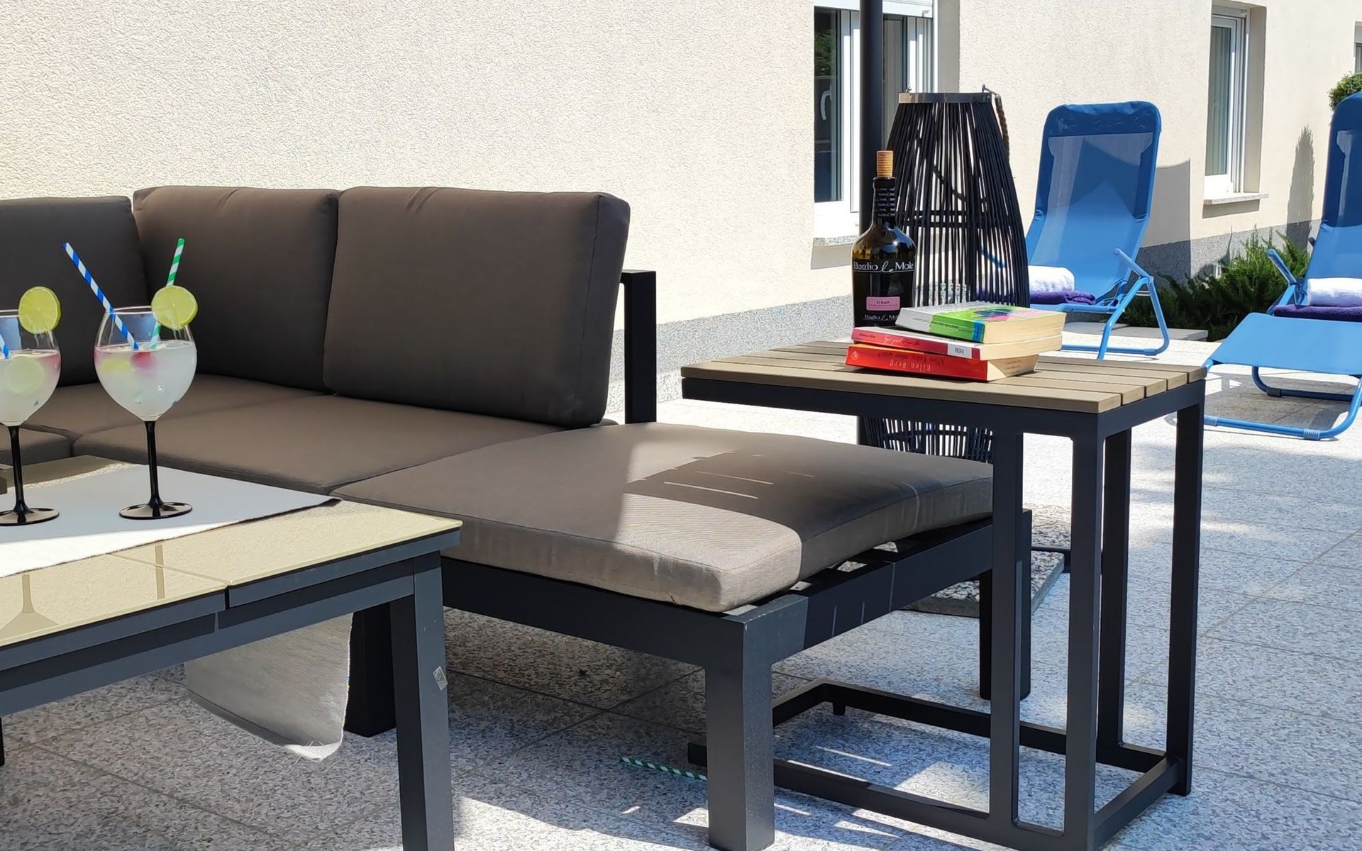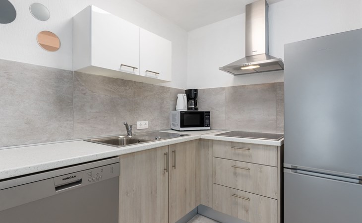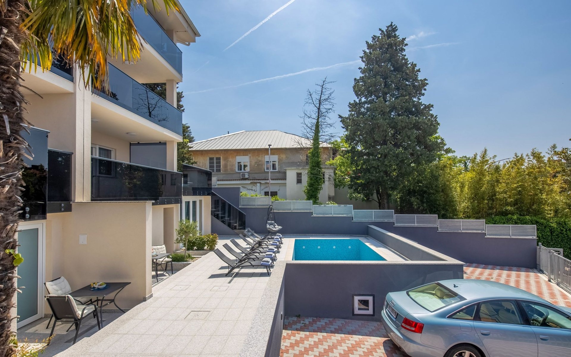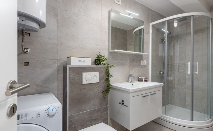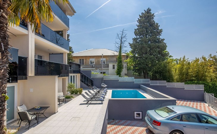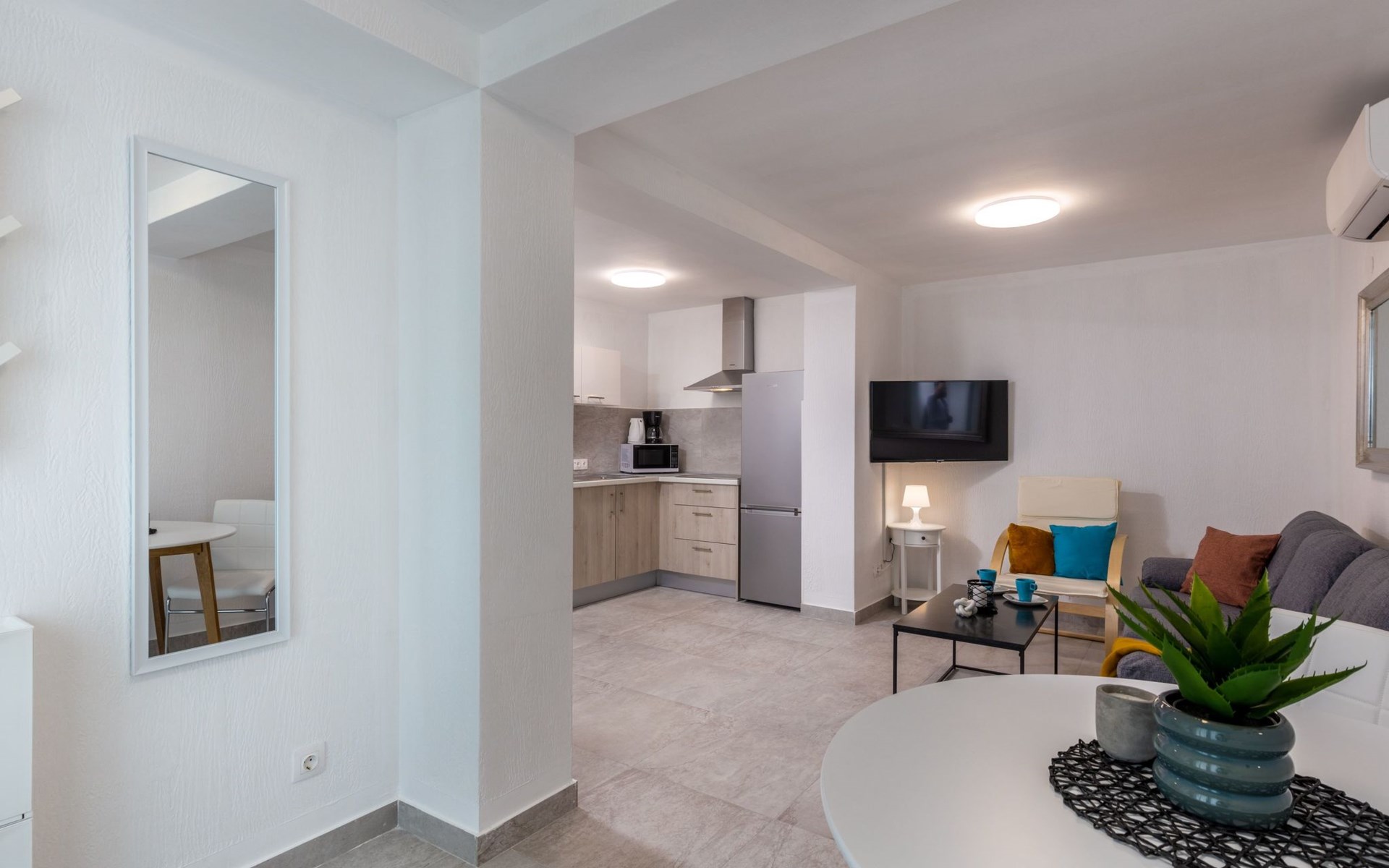 Die Wohnung hat 1 Schlafzimmer, Badezimmer mit Duschen, Waschbecken und Waschmaschinen. Das Wohnzimmer ist Teil der Küche, wo Sie einen bequemen Stuhl zum Ausruhen und Esstisch mit sehr bequemen Stühlen, eine kleine, aber gut ausgestattete Küche zu finden. Vom Wohnzimmer aus gibt es einen Ausgang zu einer schönen Terrasse mit Tisch und Stühlen und direktem Zugang zum Pool, so dass Sie Ihr morgendliches Frühstück oder das abendliche Grillen auf der Terrasse auf dem elektrischen Grill genießen können, den Sie auch in der Wohnung finden können. Der Blick auf das schöne Schwimmbad und die Liegewiese wird Sie sprachlos machen.