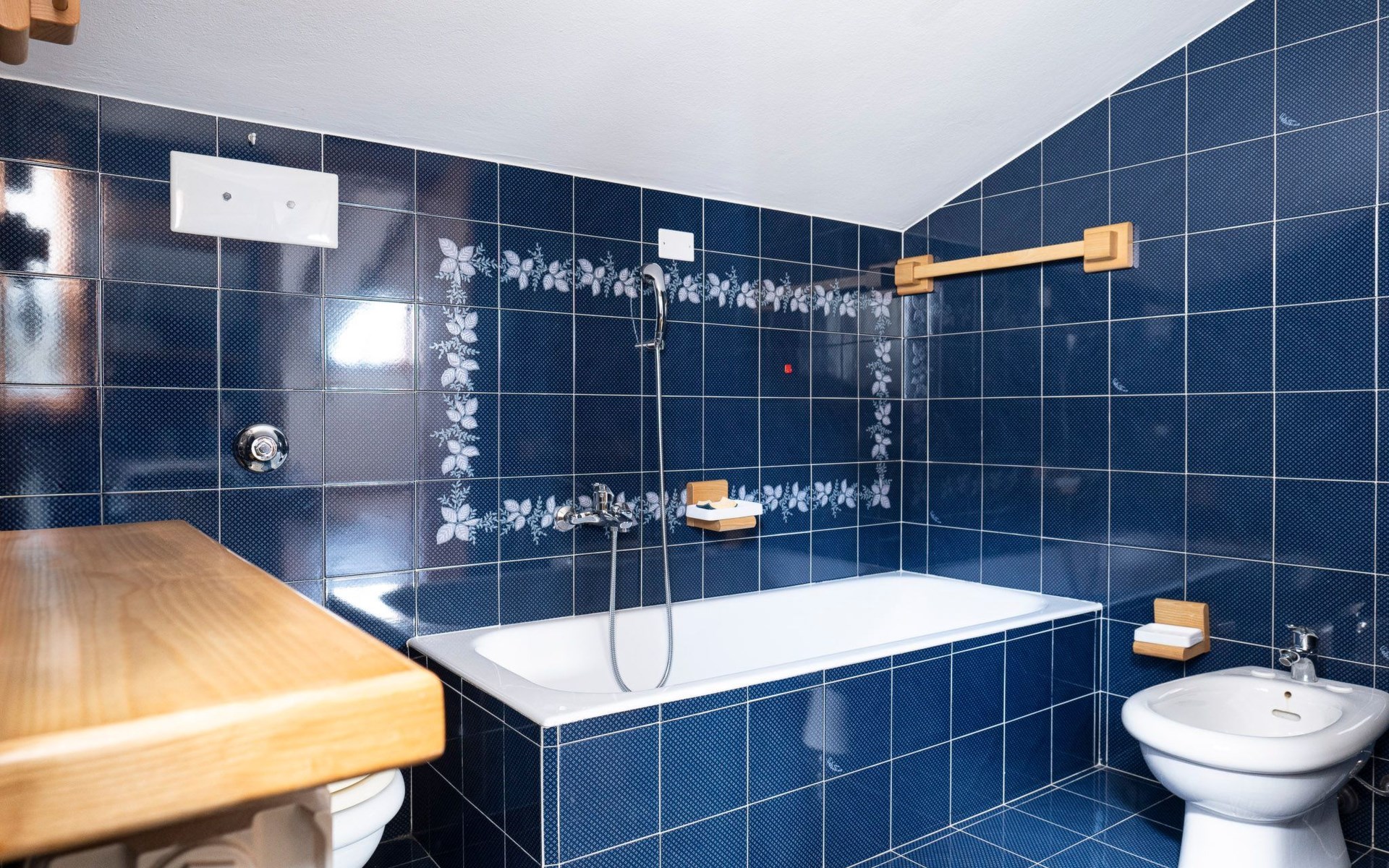 Vom Wohnzimmer aus gehen Sie nach links in das Badezimmer und die Schlafzimmer. Das erste, mit blauen Keramikfliesen, ist mit Waschbecken, Toilette, Bidet und Badewanne ausgestattet. Die Waschmaschine befindet sich in einem separaten Hauswirtschaftsraum. Das erste, kleinere Zimmer hat ein Einzelbett und einen Schreibtisch. Das zweite Zimmer ist größer und hat ein Doppelbett, eine Kommode mit Spiegel und einen großen Kleiderschrank.