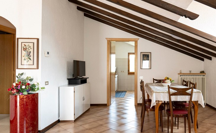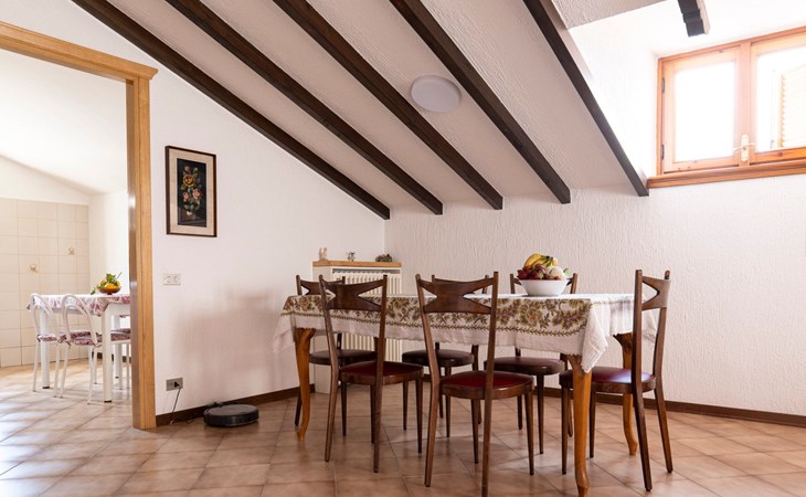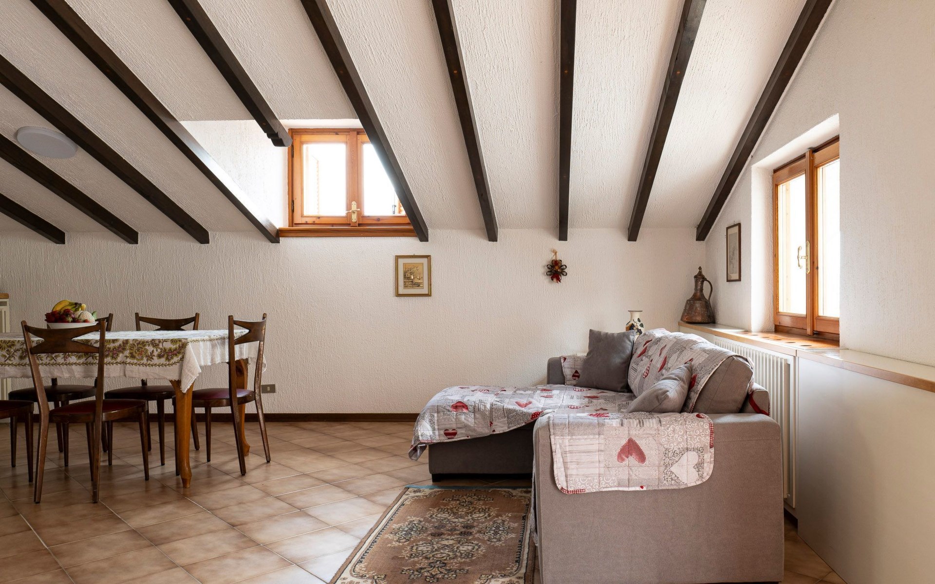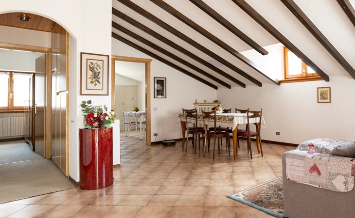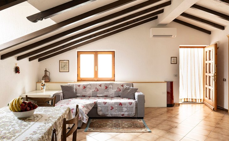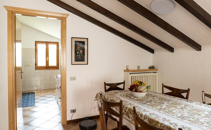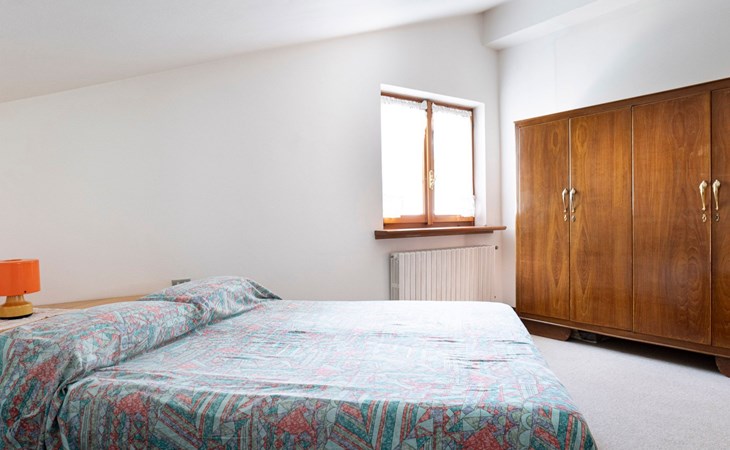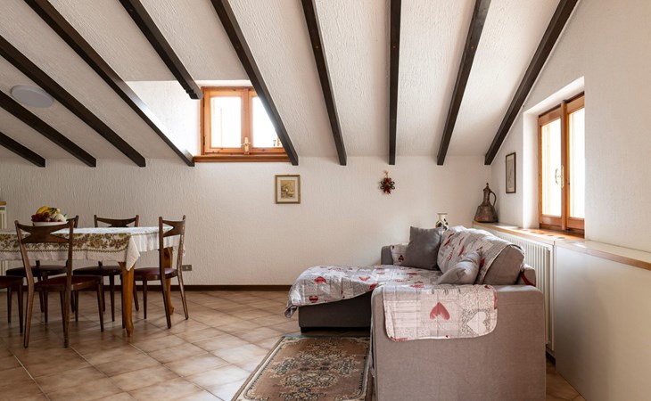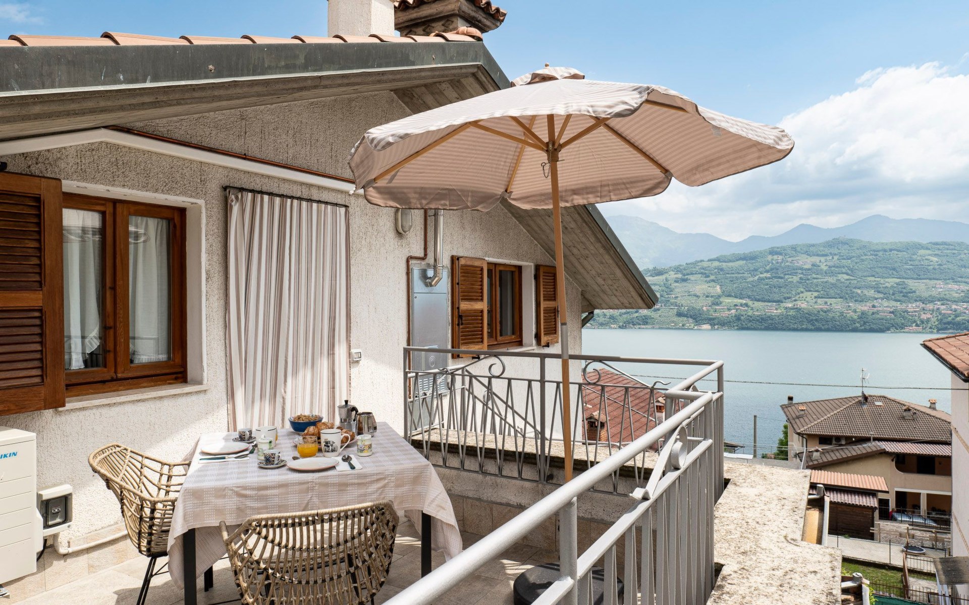 Die Dreizimmerwohnung Gioia del Verde befindet sich in der Gemeinde Tavernola Bergamasca, mit Blick auf die bergamasker Seite des Iseosees, direkt gegenüber von Montisola, in einem kleinen Gebäude in dem Teil des Dorfes, der hinter ihm den Hügel hinaufgeht. Es handelt sich um eine Mansarde mit schrägem Dach und sichtbaren Balken, die auch im untersten Teil eine gute Höhe hat und durch Dachgauben und Fenster Licht erhält.