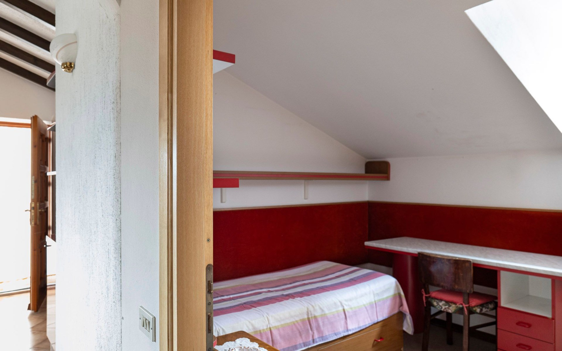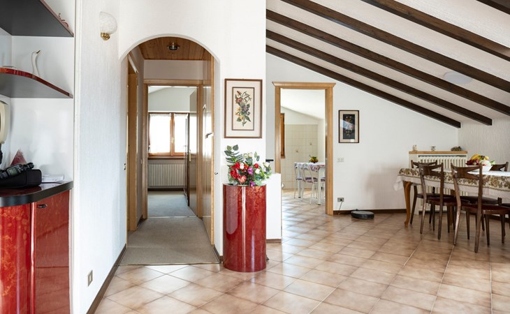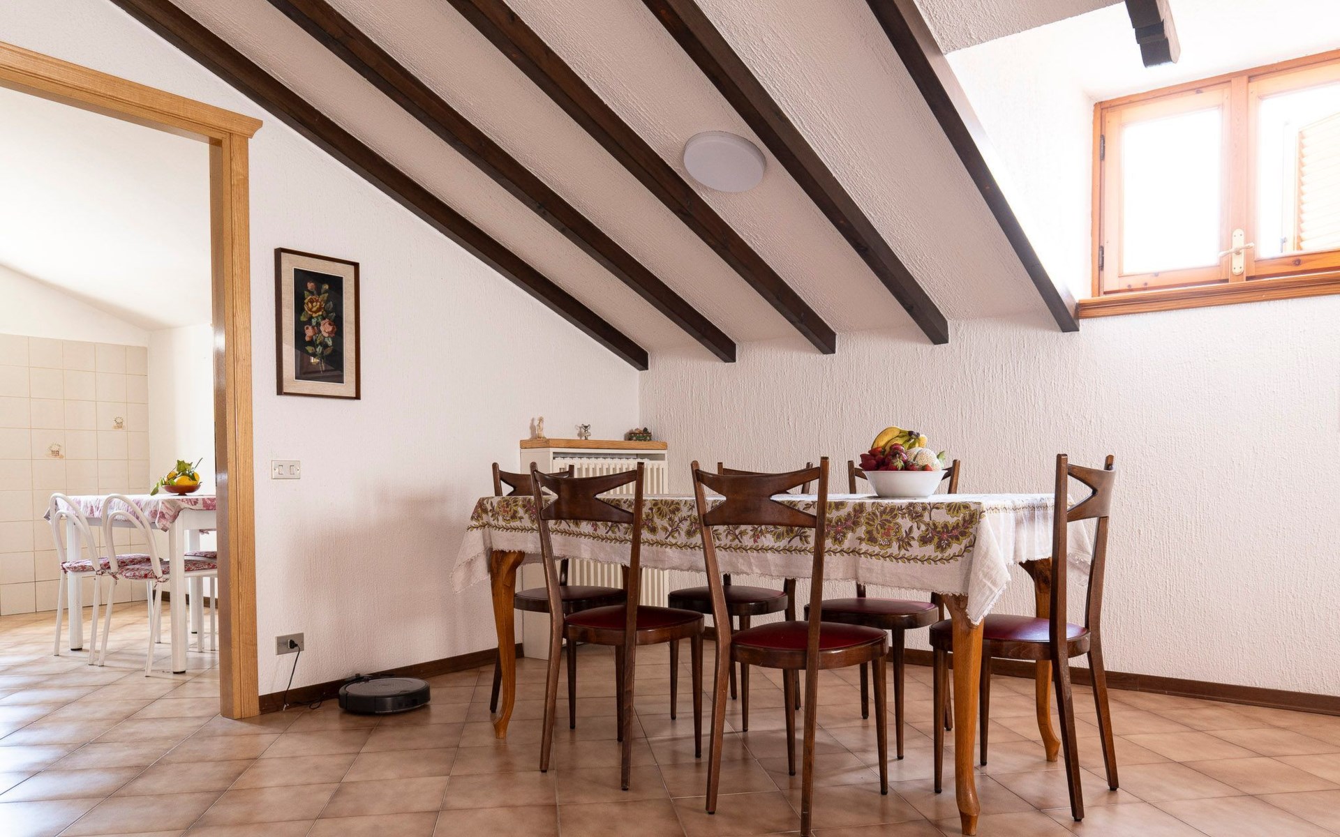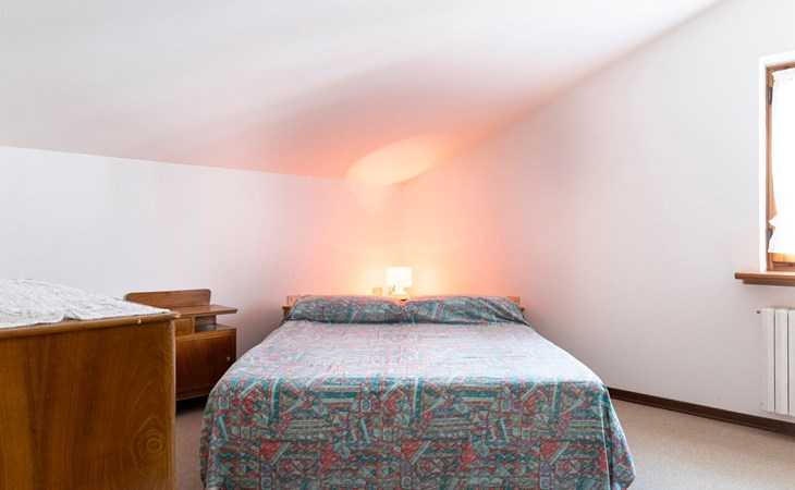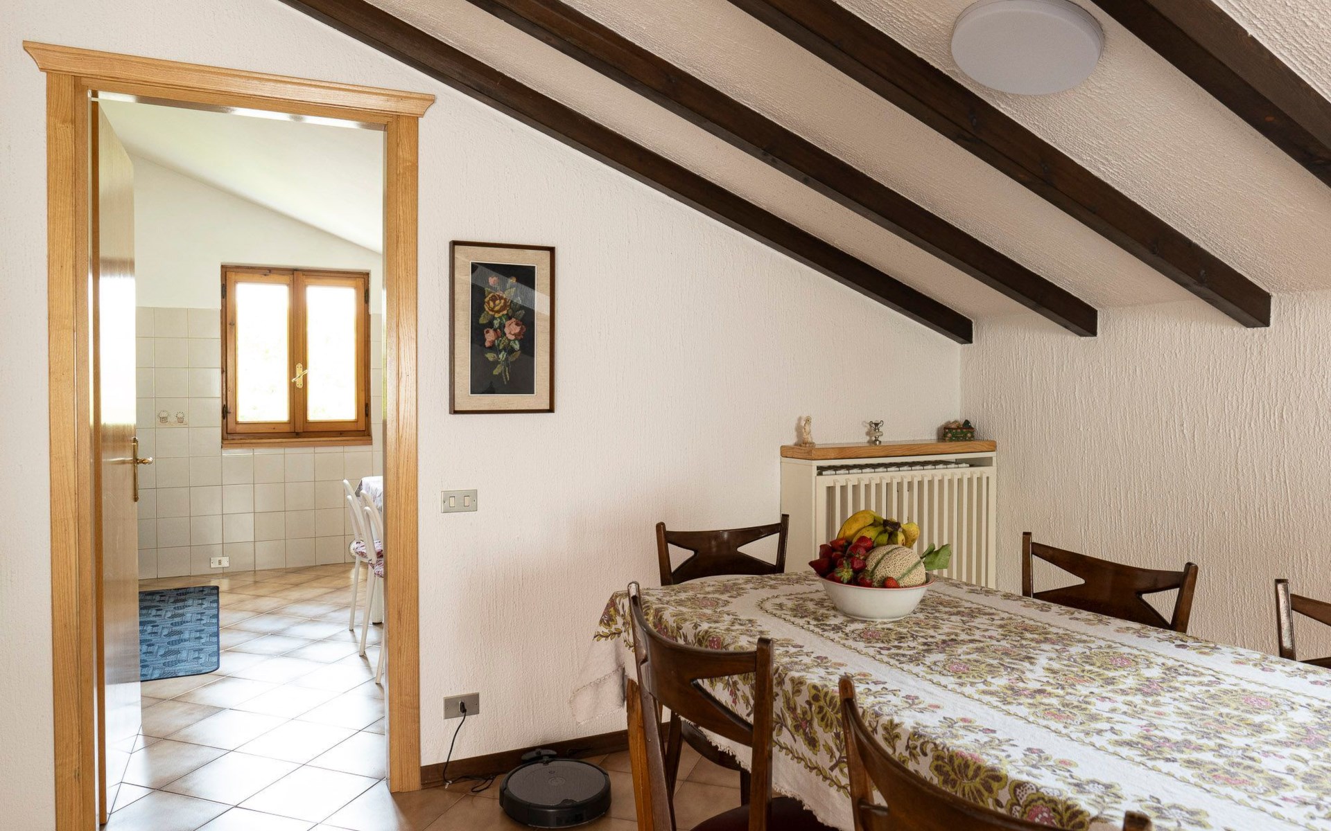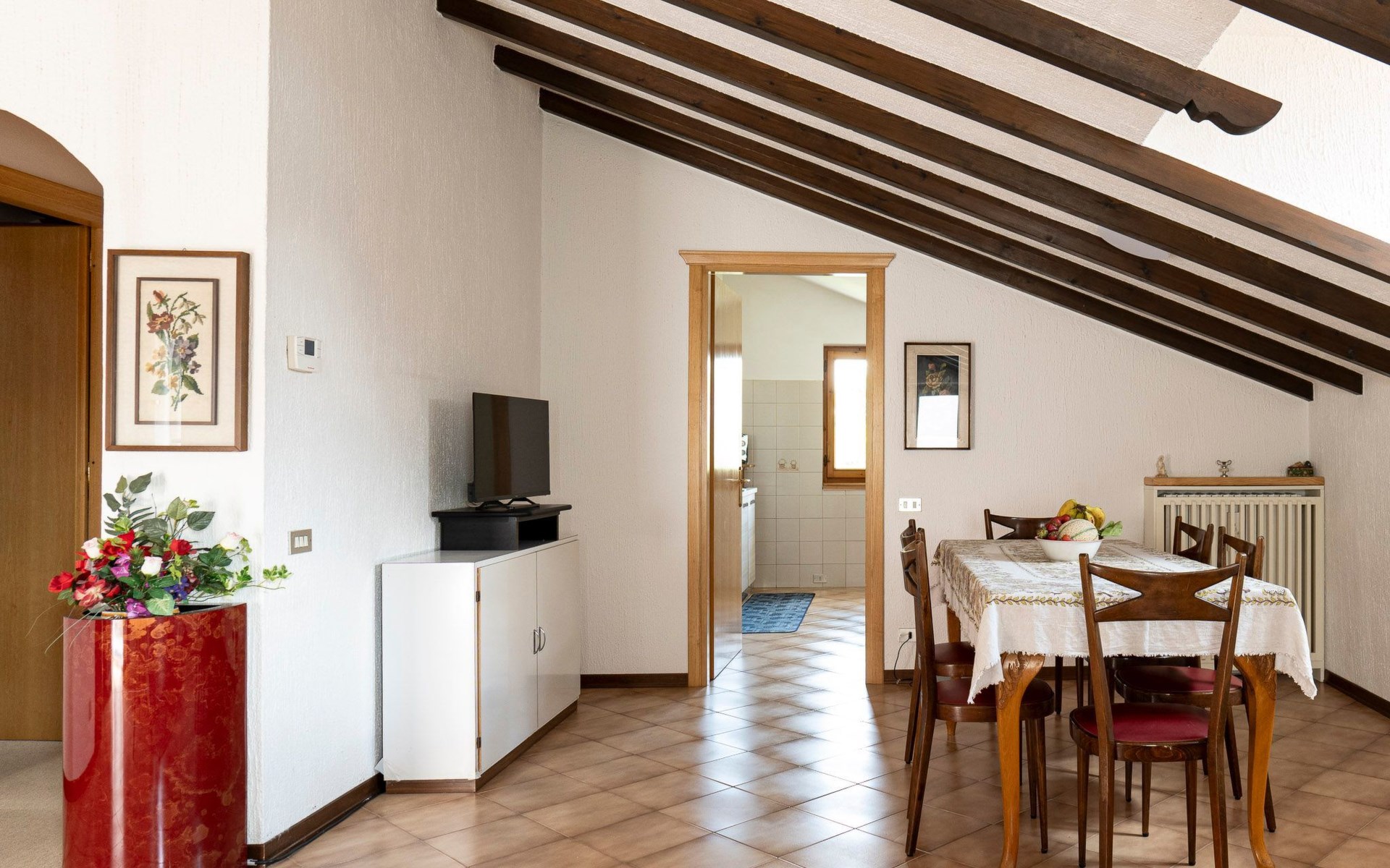 Die Dreizimmerwohnung Gioia del Verde befindet sich in der Gemeinde Tavernola Bergamasca, mit Blick auf die bergamasker Seite des Iseosees, direkt gegenüber von Montisola, in einem kleinen Gebäude in dem Teil des Dorfes, der hinter ihm den Hügel hinaufgeht. Es handelt sich um eine Mansarde mit schrägem Dach und sichtbaren Balken, die auch im untersten Teil eine gute Höhe hat und durch Dachgauben und Fenster Licht erhält.