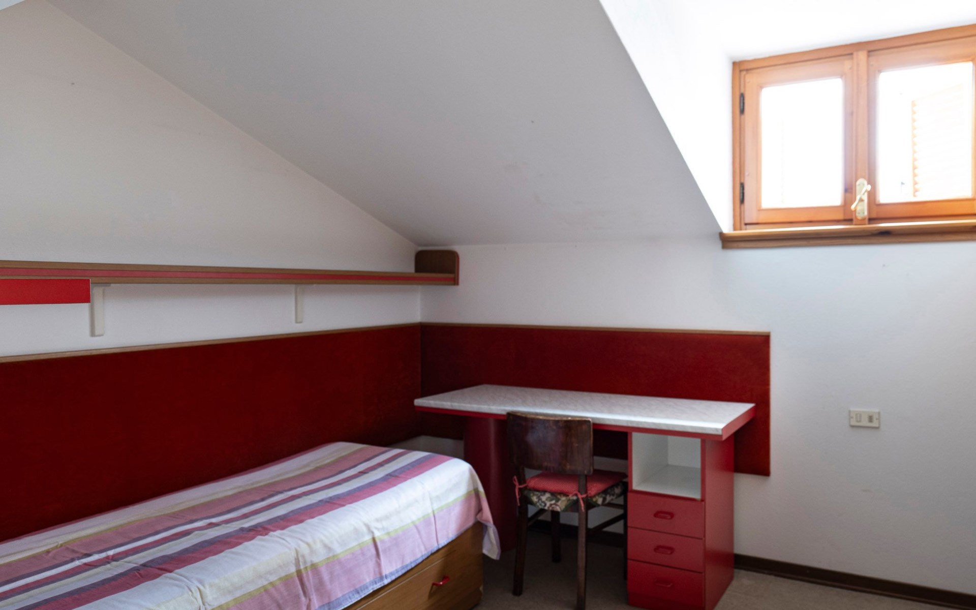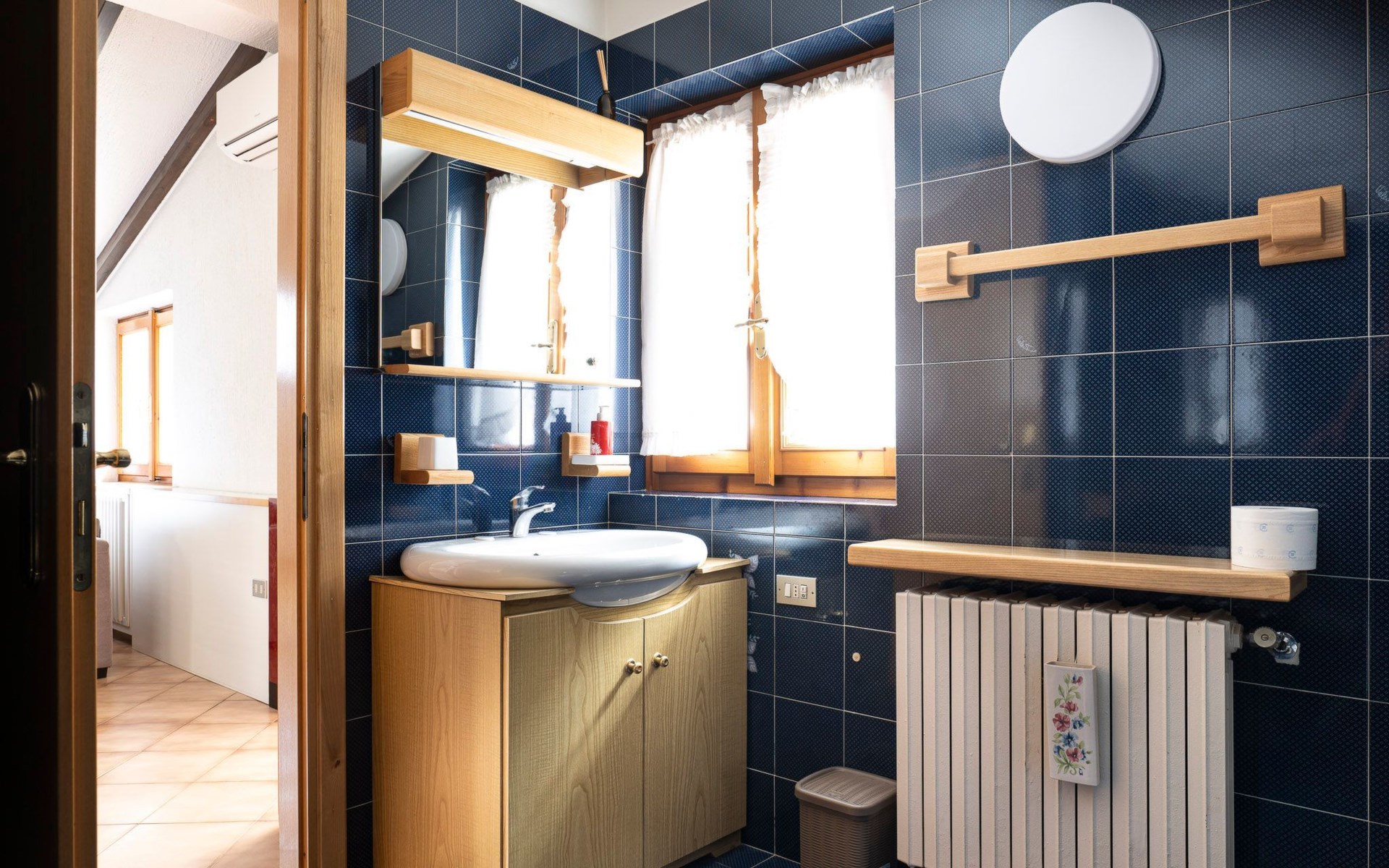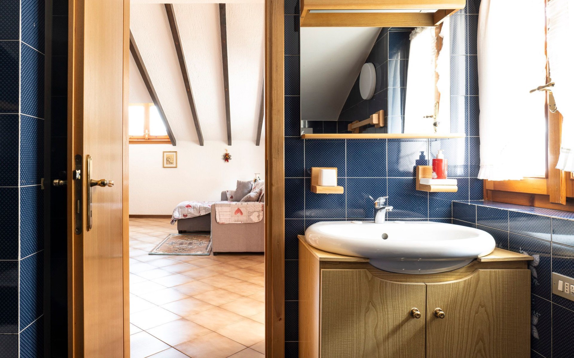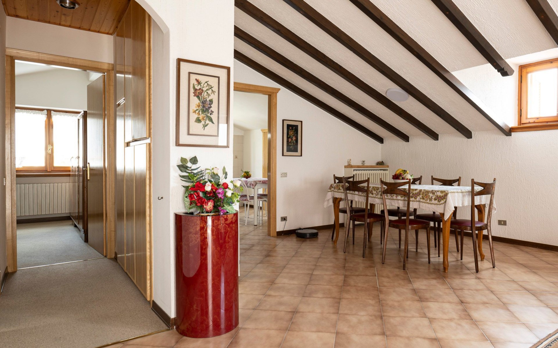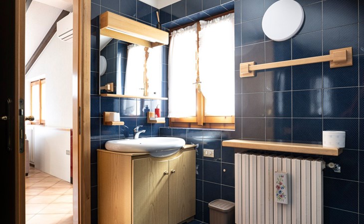 Die Dreizimmerwohnung Gioia del Verde befindet sich in der Gemeinde Tavernola Bergamasca, mit Blick auf die bergamasker Seite des Iseosees, direkt gegenüber von Montisola, in einem kleinen Gebäude in dem Teil des Dorfes, der hinter ihm den Hügel hinaufgeht. Es handelt sich um eine Mansarde mit schrägem Dach und sichtbaren Balken, die auch im untersten Teil eine gute Höhe hat und durch Dachgauben und Fenster Licht erhält.