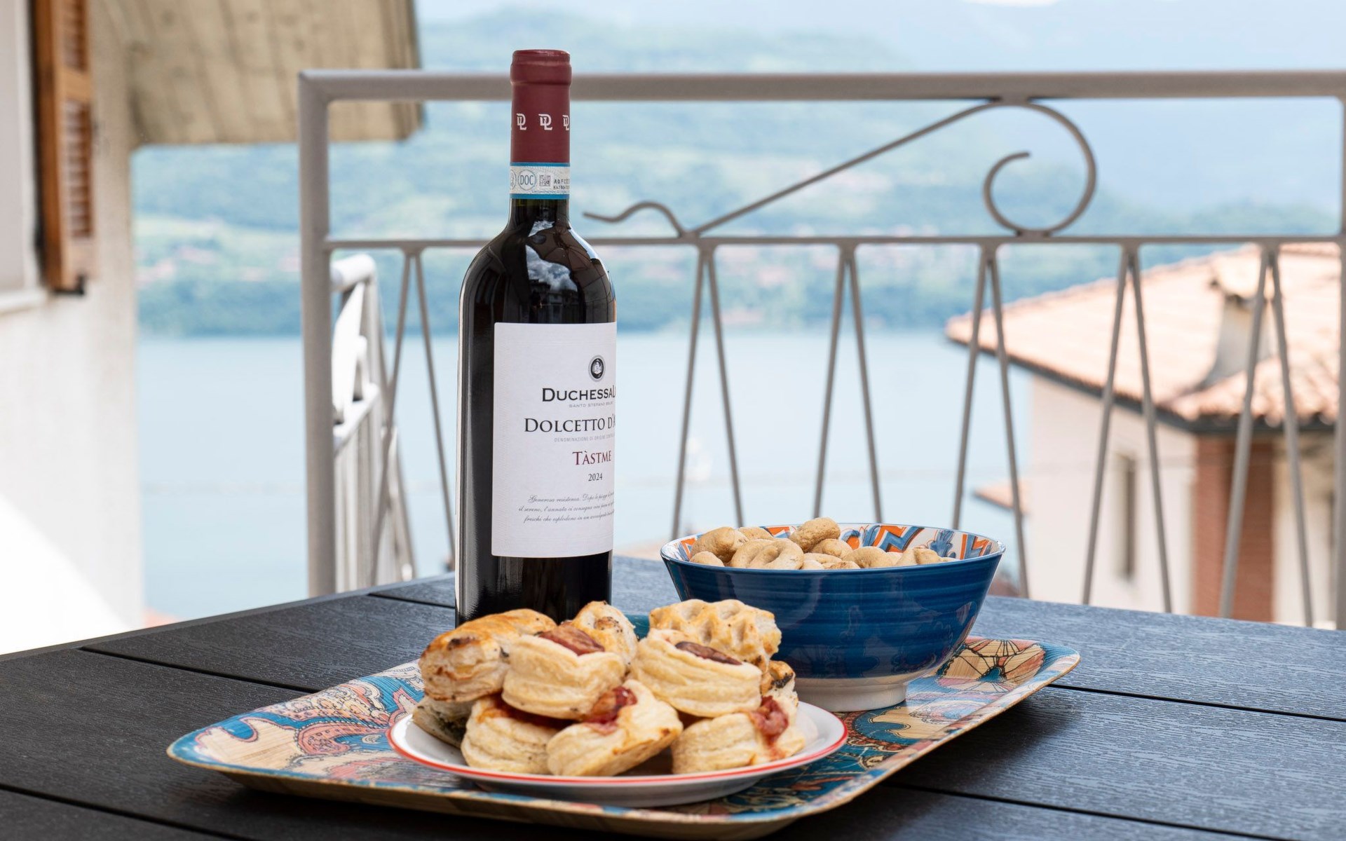 Das mit traditionellen Holzmöbeln eingerichtete Ferienhaus Gioia del Verde hat eine Wohnfläche von 100 m2 und verfügt über eine große Terrasse mit Tisch, Sonnenschirm und Stühlen, auf der man frühstücken oder zu Mittag essen kann, während man den See bewundert, der durch die Dächer hindurchschaut.