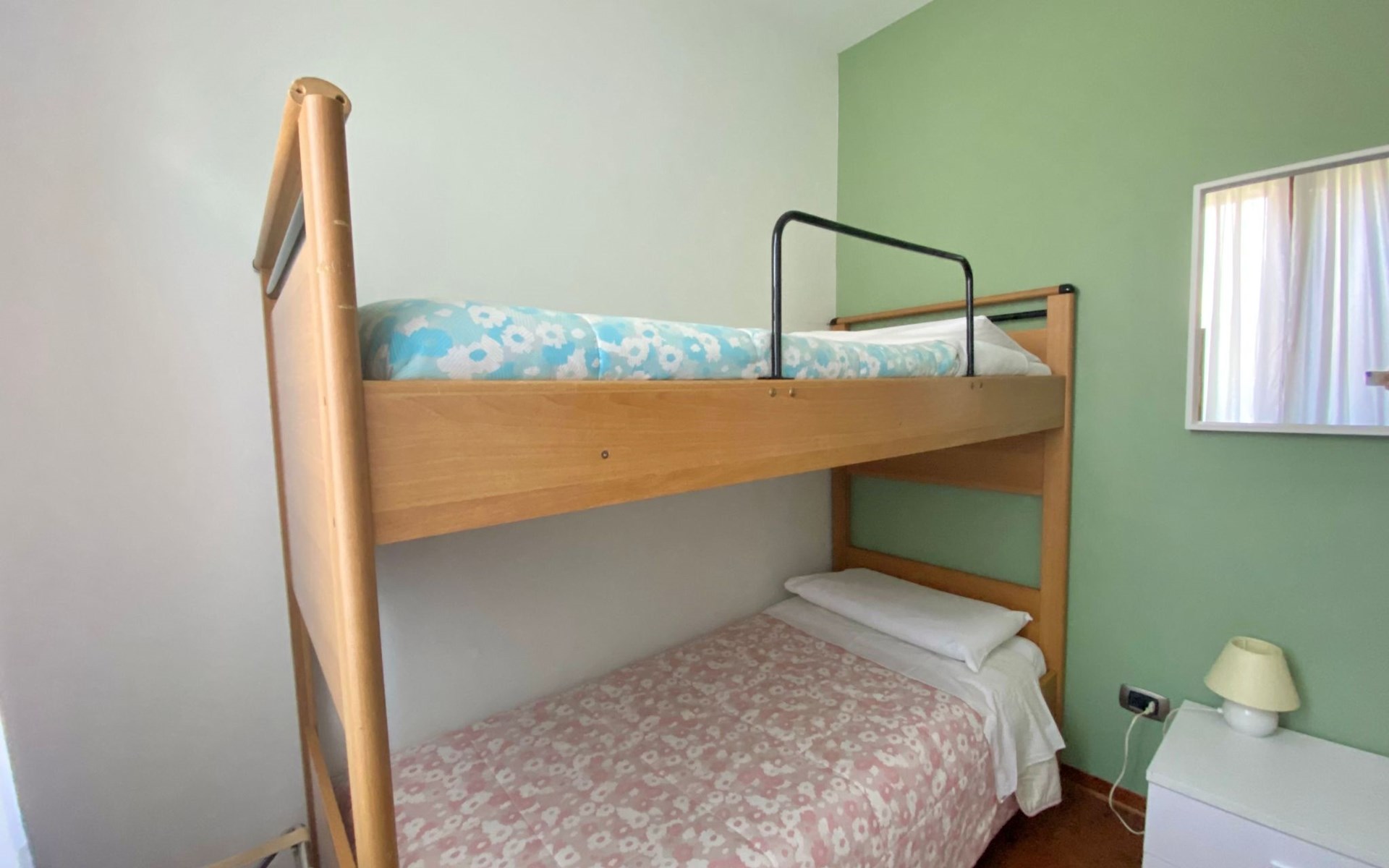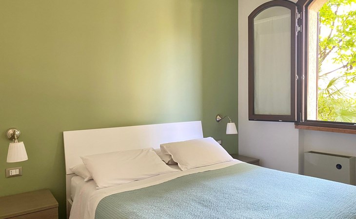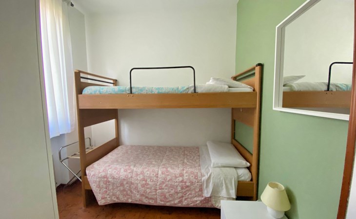 L'appartamento è situato al piano terra ed è composto da una camera con letto matrimoniale, una camera con letto a castello, un bagno con doccia e asciugacapelli, un soggiorno con divano letto e zona pranzo, e una cucina completamente attrezzata con lavastoviglie.