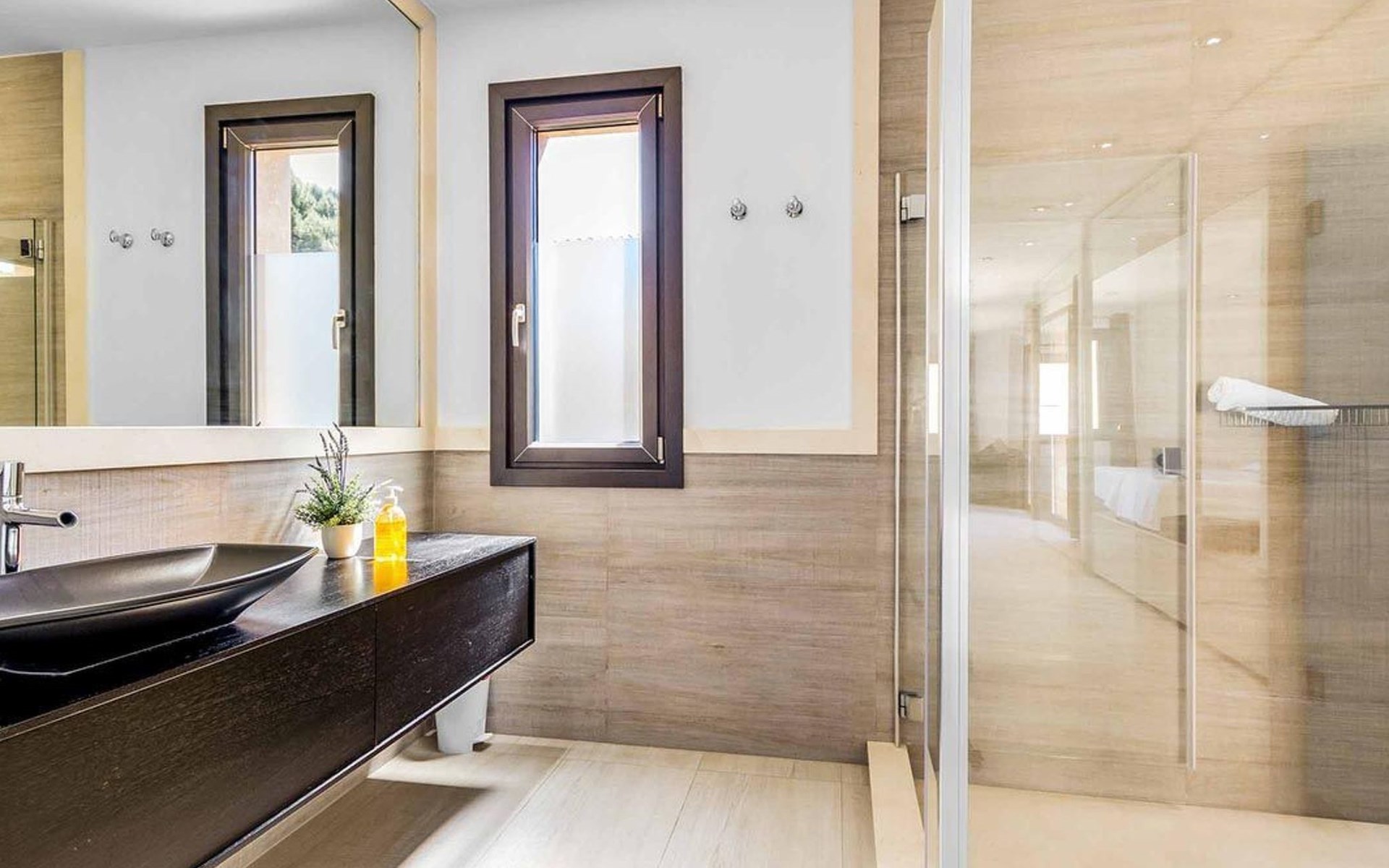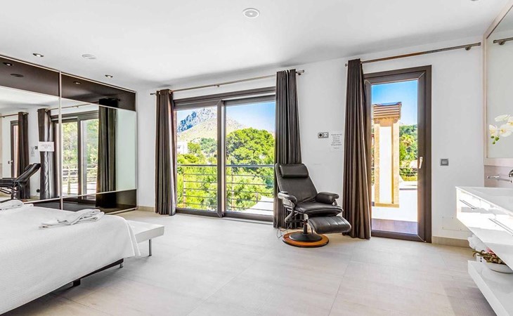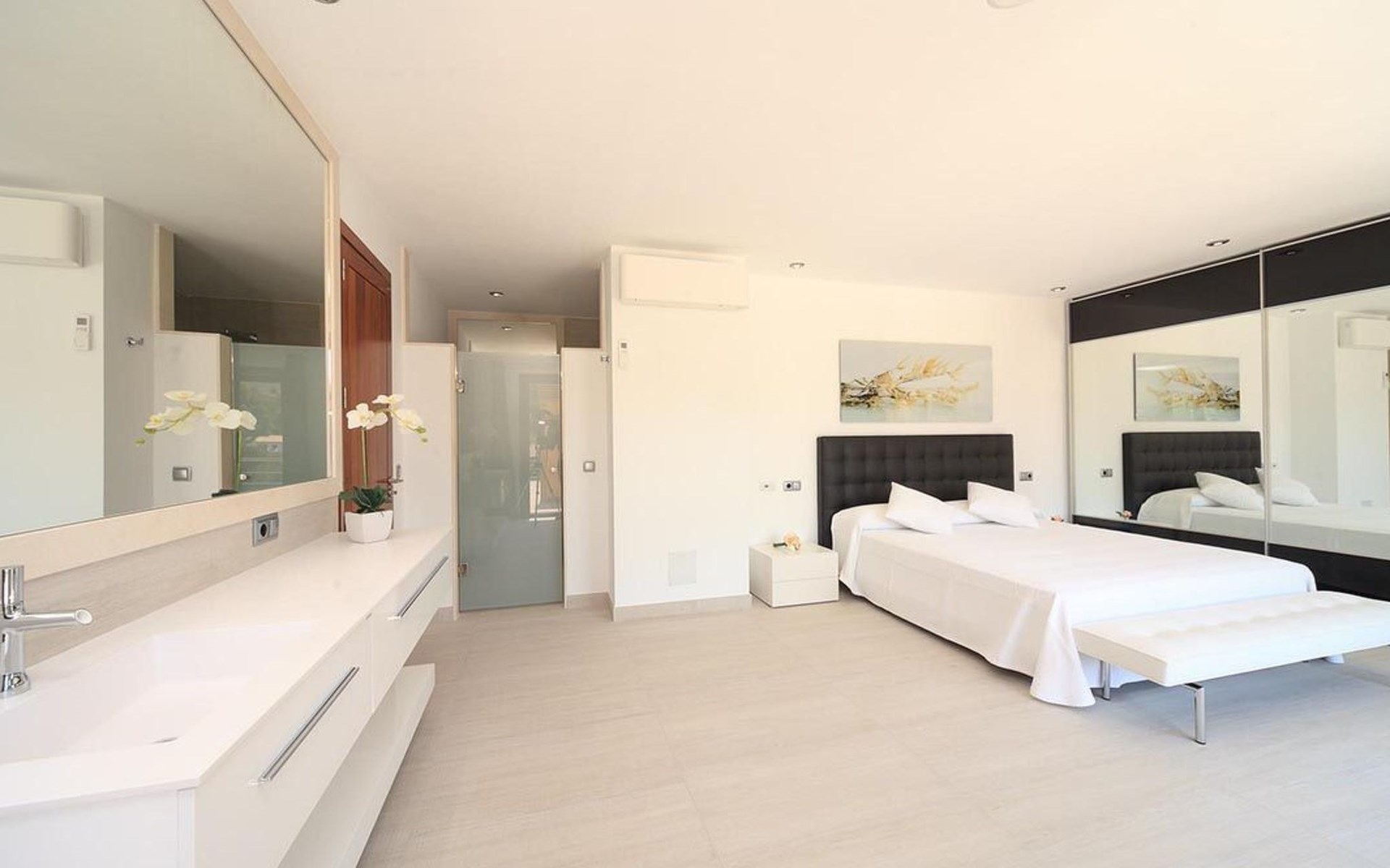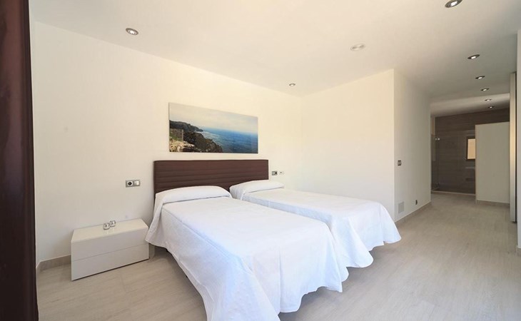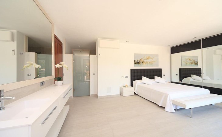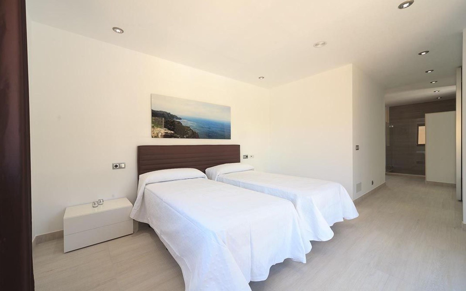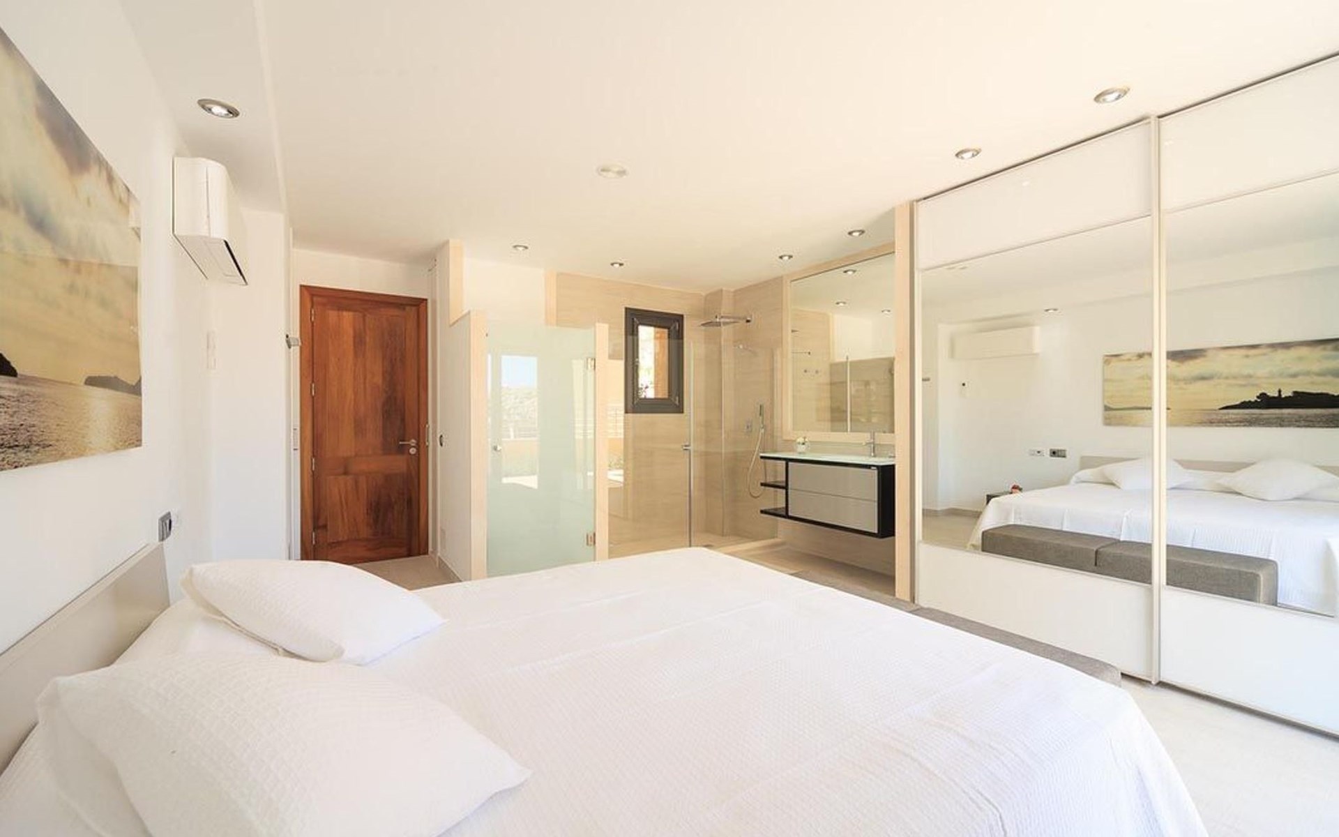 Im Obergeschoss des Hauses gibt es eine Außenterrasse mit ebenso fantastischer Aussicht sowie zwei geräumige und sehr moderne Schlafzimmer mit Einbauschränken und großen Spiegeltüren. Eines der Schlafzimmer verfügt über ein Doppelbett, das andere über zwei Einzelbetten. Jedes hat ein eigenes Bad.
