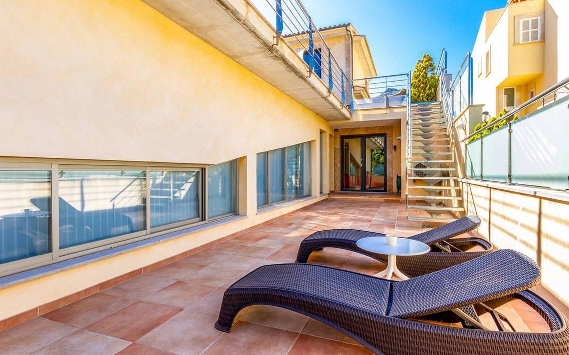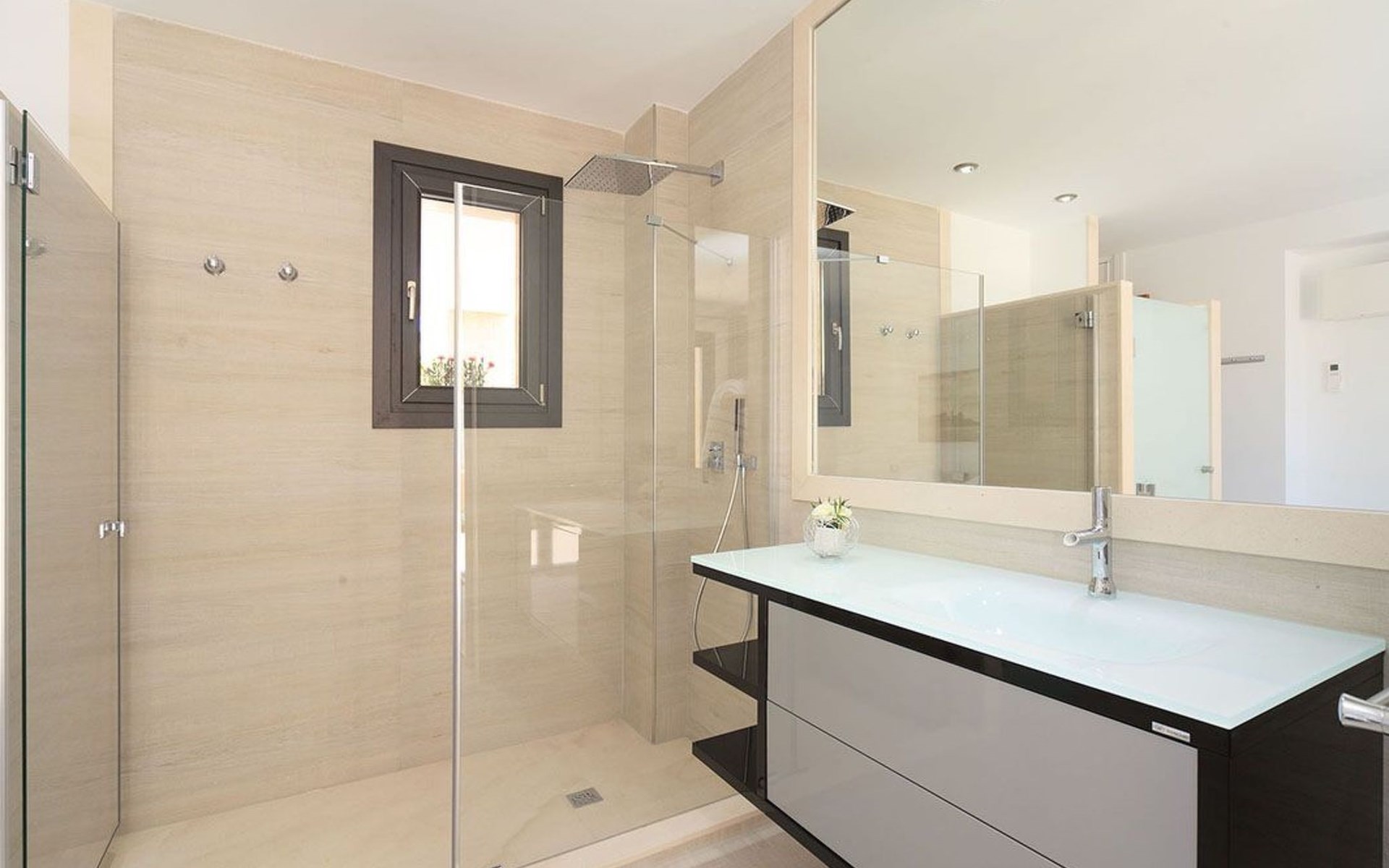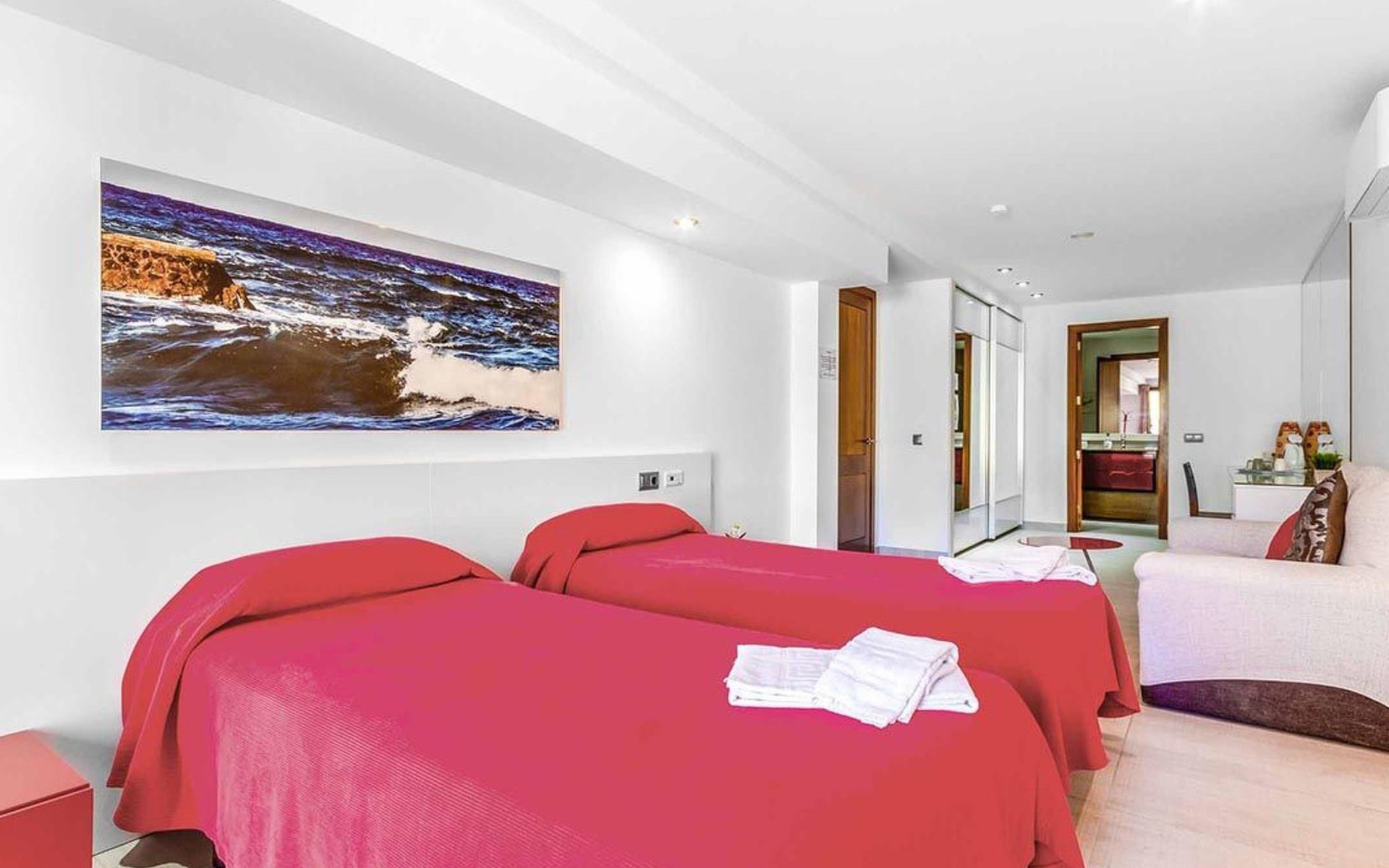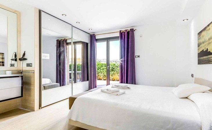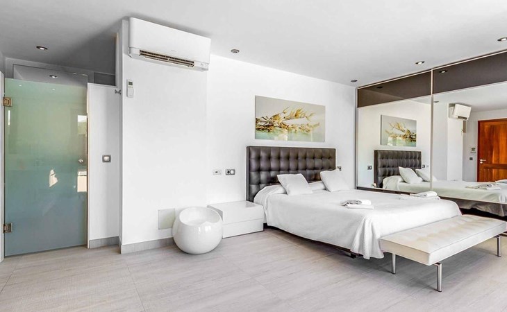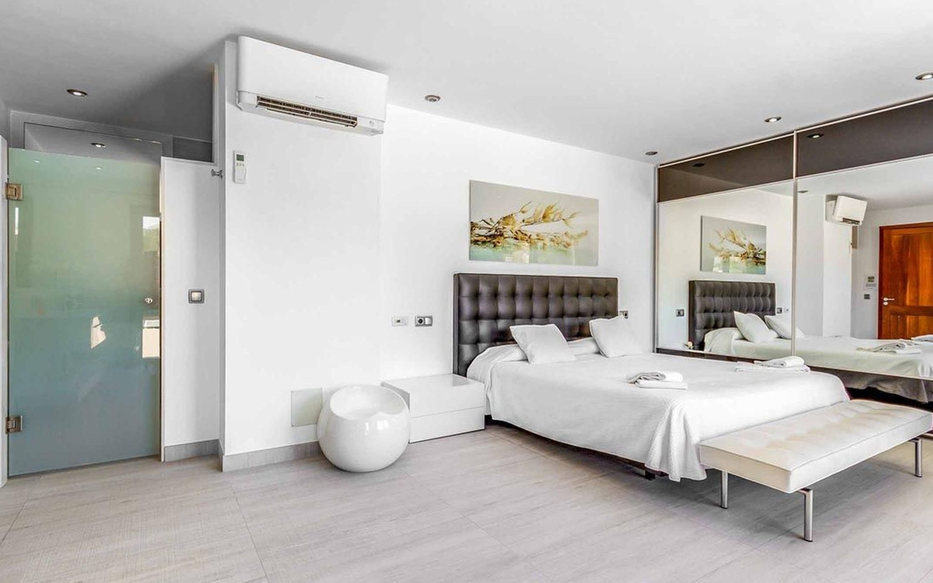 Im Obergeschoss des Hauses gibt es eine Außenterrasse mit ebenso fantastischer Aussicht sowie zwei geräumige und sehr moderne Schlafzimmer mit Einbauschränken und großen Spiegeltüren. Eines der Schlafzimmer verfügt über ein Doppelbett, das andere über zwei Einzelbetten. Jedes hat ein eigenes Bad.