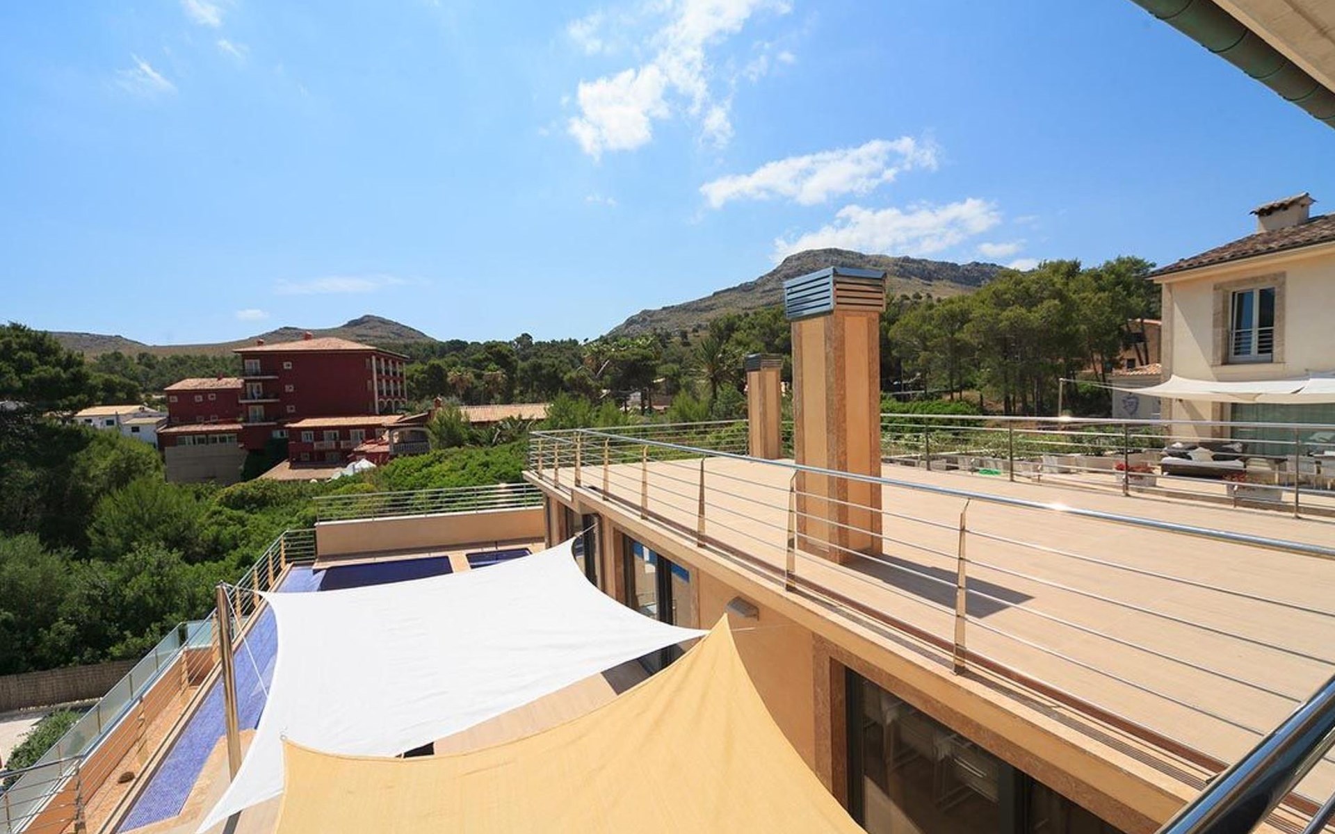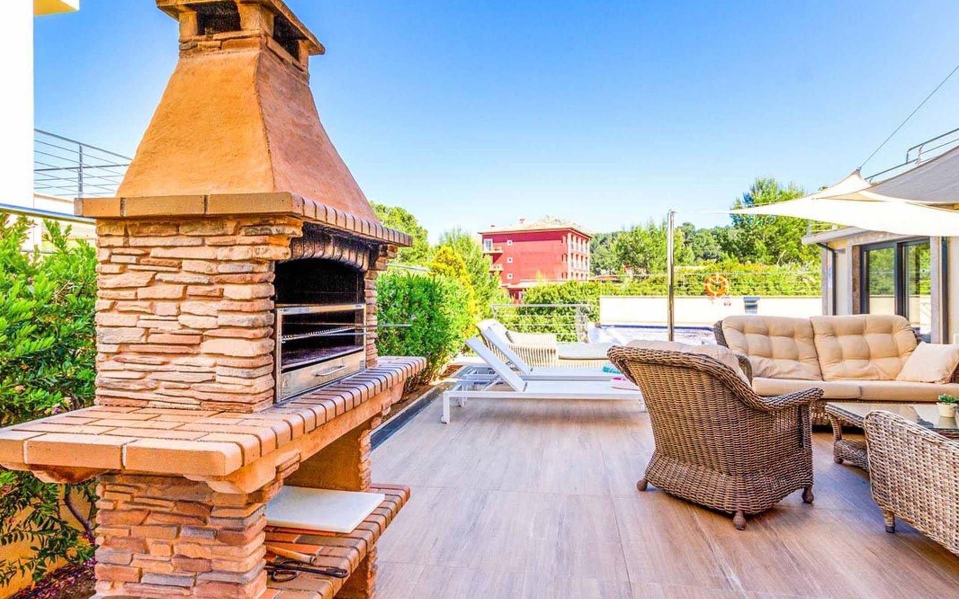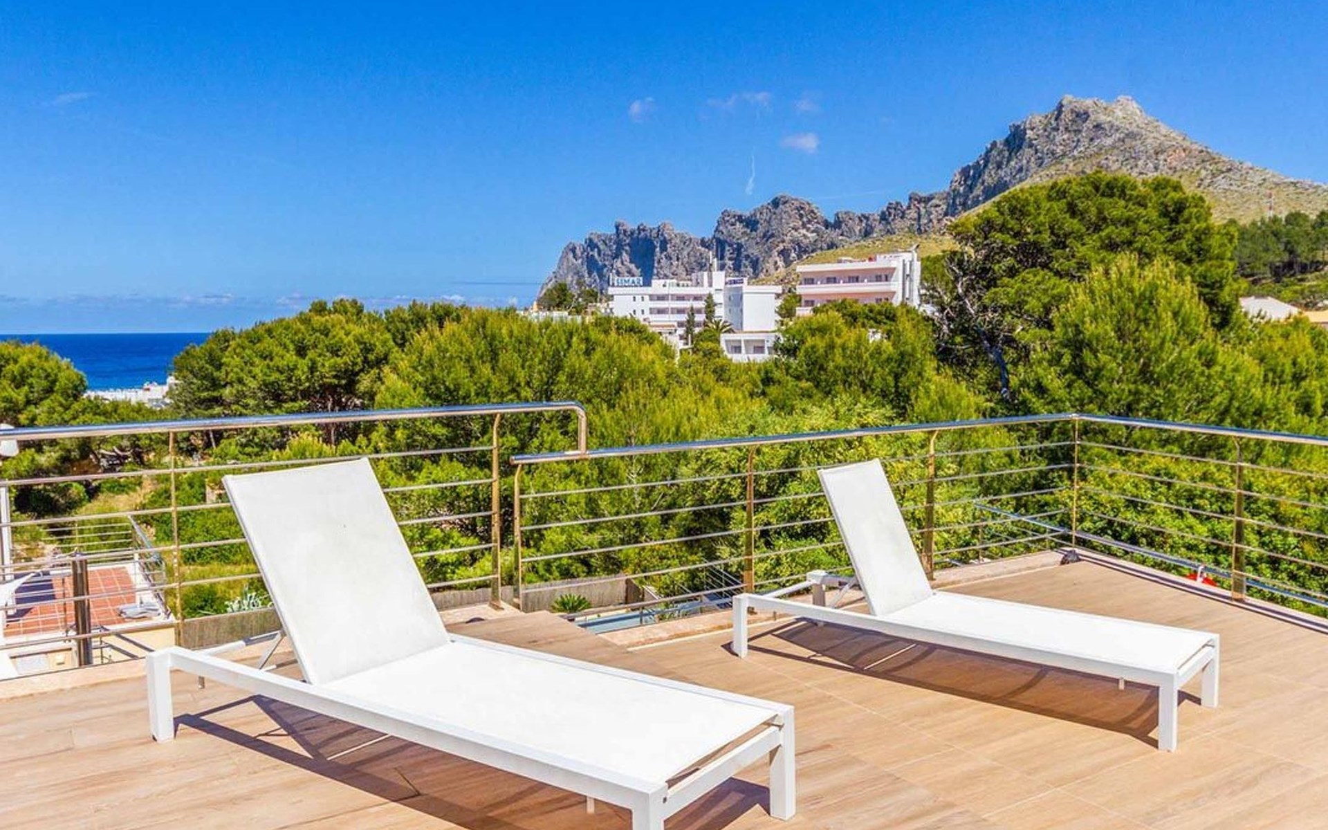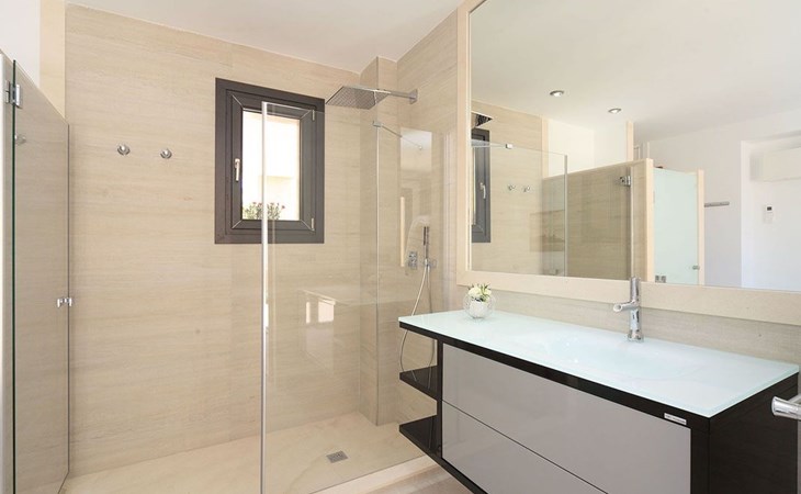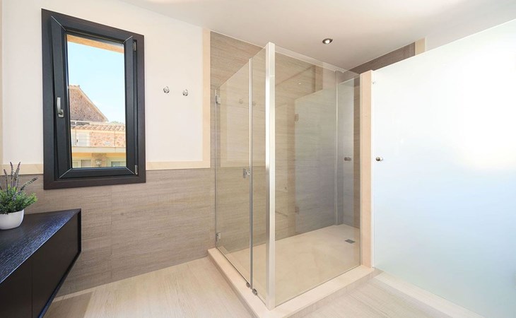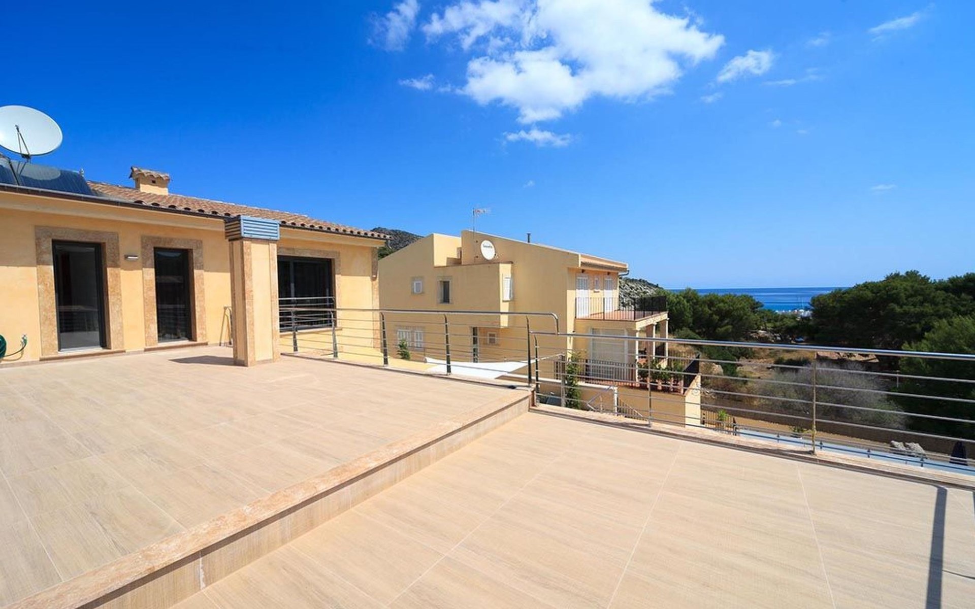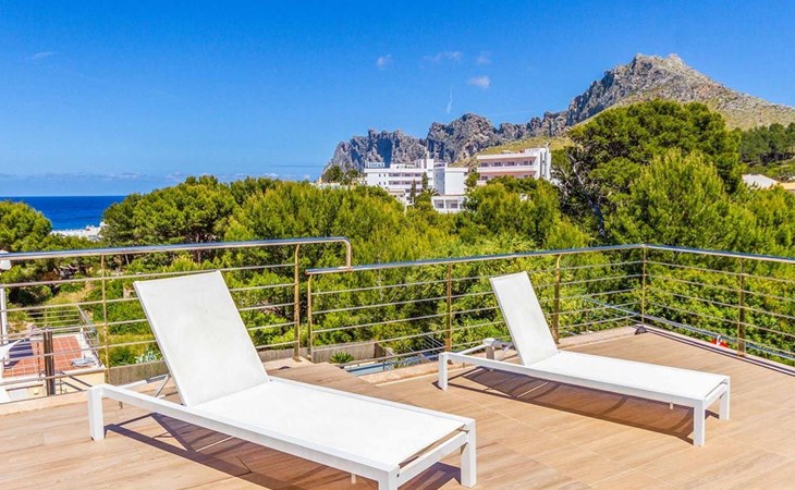Im Obergeschoss des Hauses gibt es eine Außenterrasse mit ebenso fantastischer Aussicht sowie zwei geräumige und sehr moderne Schlafzimmer mit Einbauschränken und großen Spiegeltüren. Eines der Schlafzimmer verfügt über ein Doppelbett, das andere über zwei Einzelbetten. Jedes hat ein eigenes Bad.
