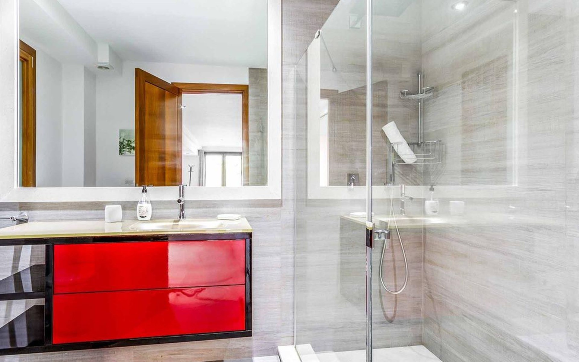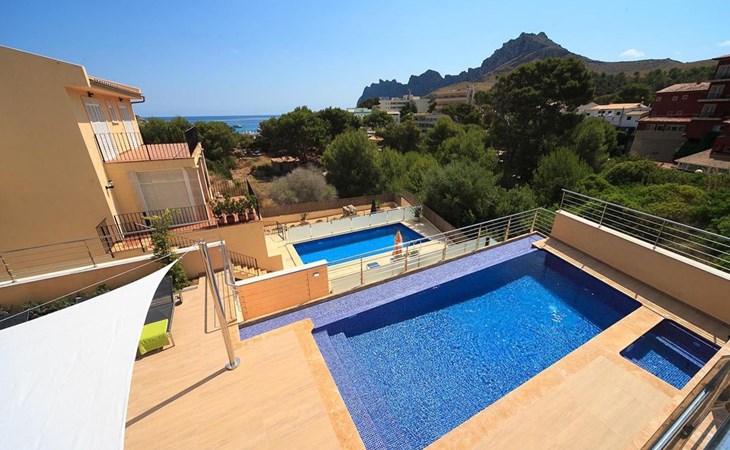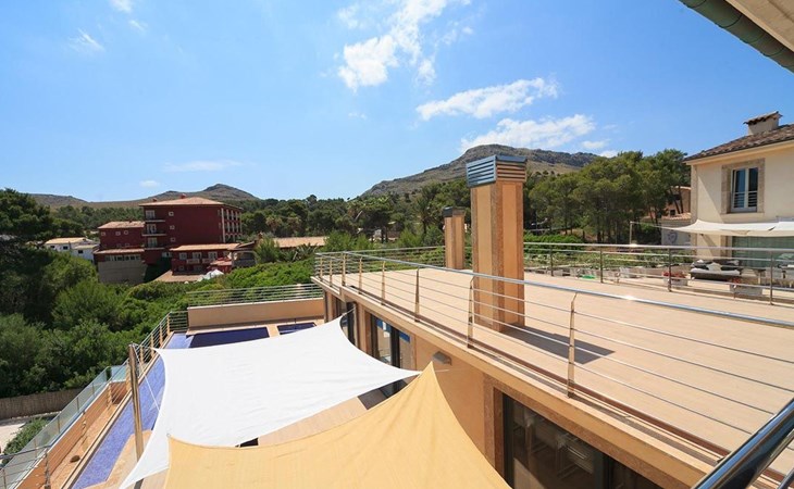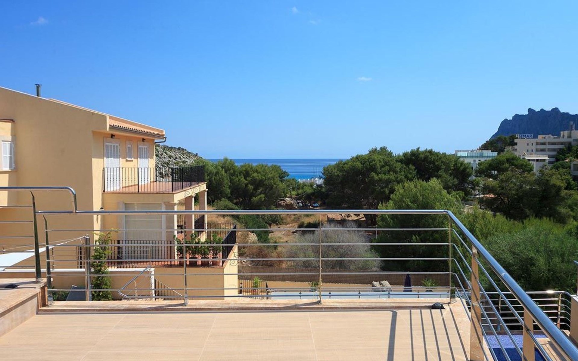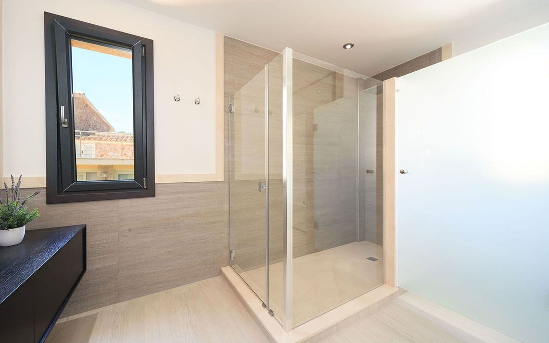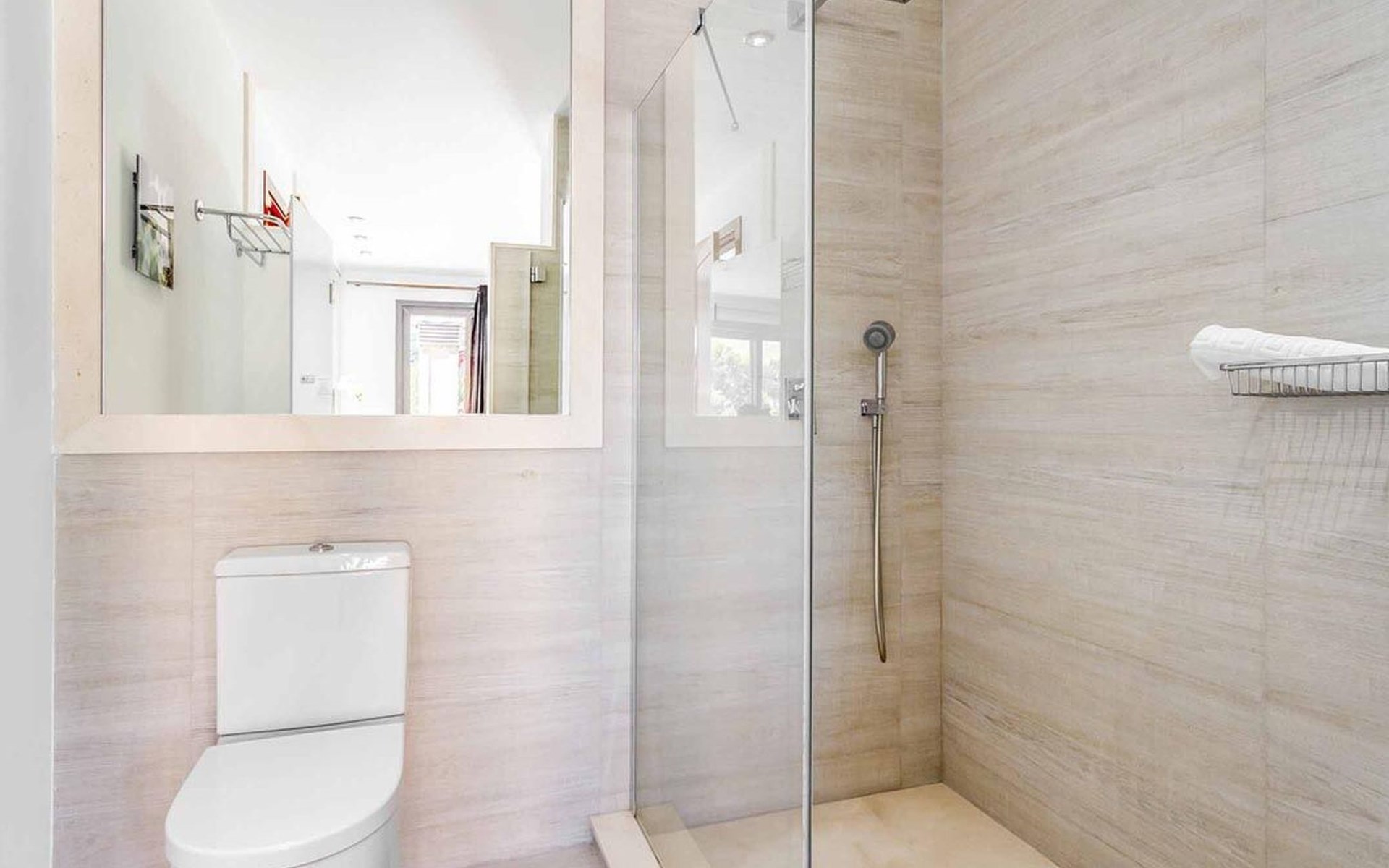 Im Obergeschoss des Hauses gibt es eine Außenterrasse mit ebenso fantastischer Aussicht sowie zwei geräumige und sehr moderne Schlafzimmer mit Einbauschränken und großen Spiegeltüren. Eines der Schlafzimmer verfügt über ein Doppelbett, das andere über zwei Einzelbetten. Jedes hat ein eigenes Bad.