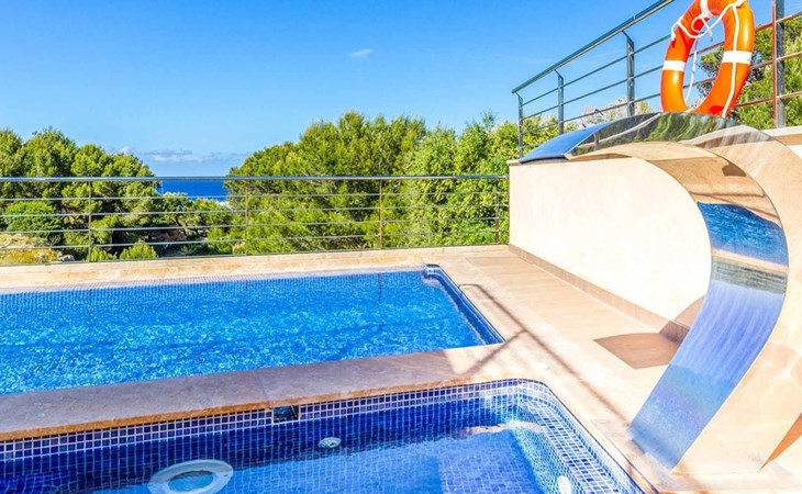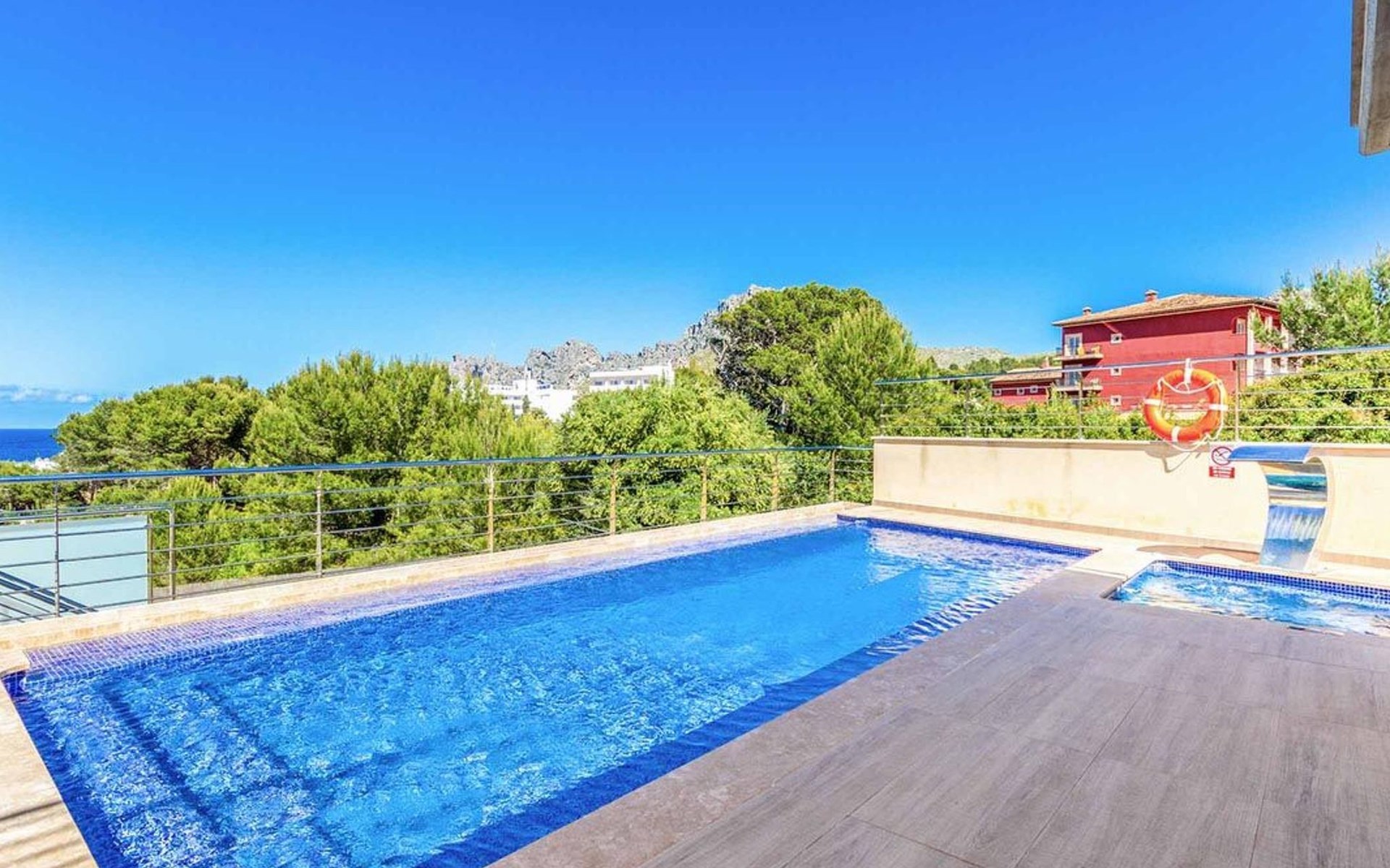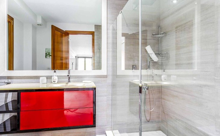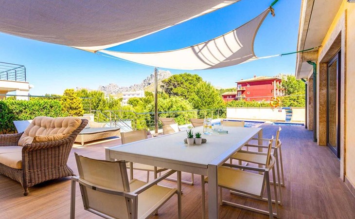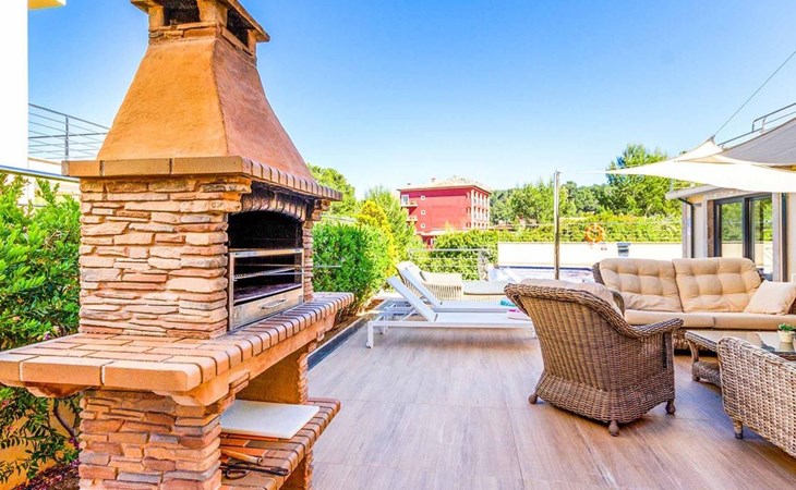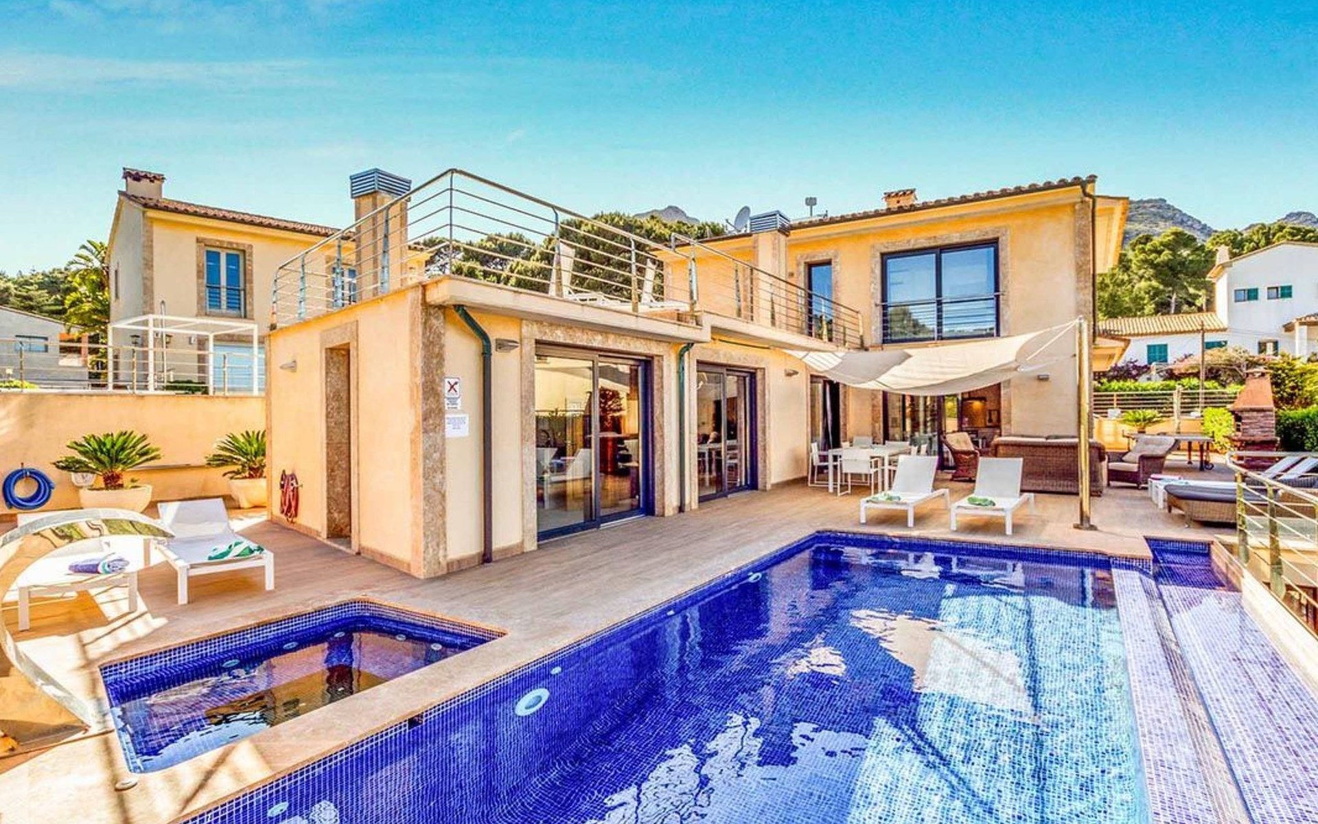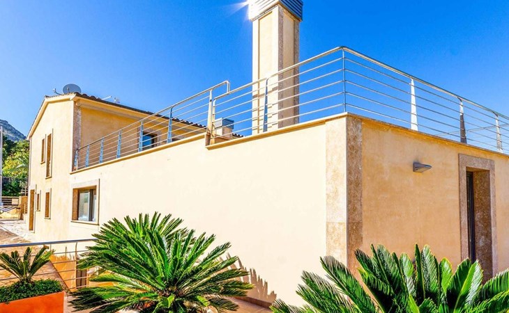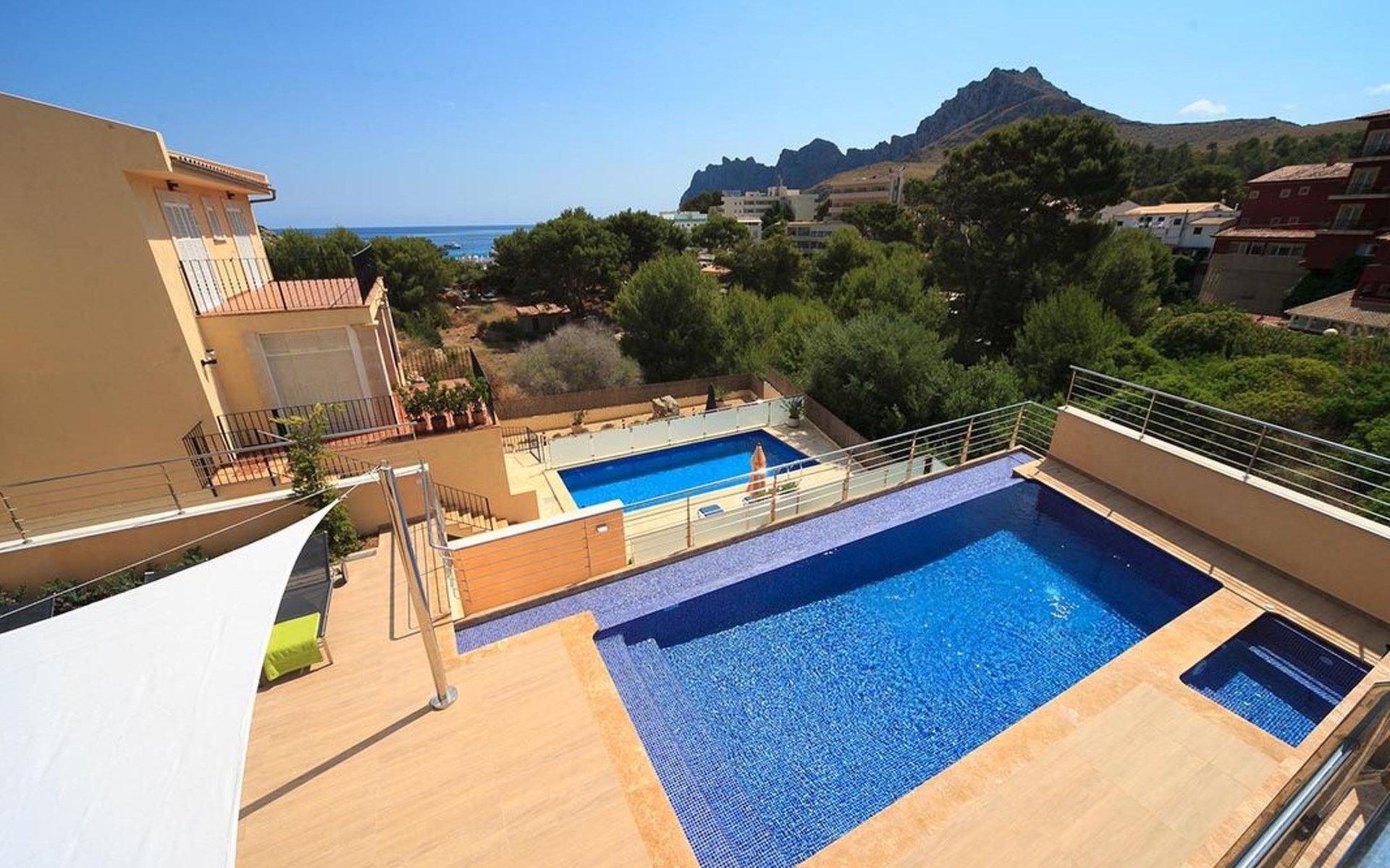 Im Obergeschoss des Hauses gibt es eine Außenterrasse mit ebenso fantastischer Aussicht sowie zwei geräumige und sehr moderne Schlafzimmer mit Einbauschränken und großen Spiegeltüren. Eines der Schlafzimmer verfügt über ein Doppelbett, das andere über zwei Einzelbetten. Jedes hat ein eigenes Bad.