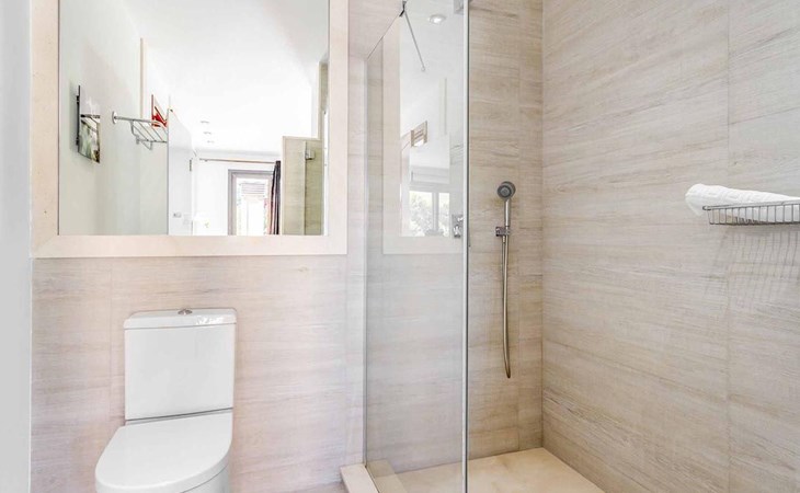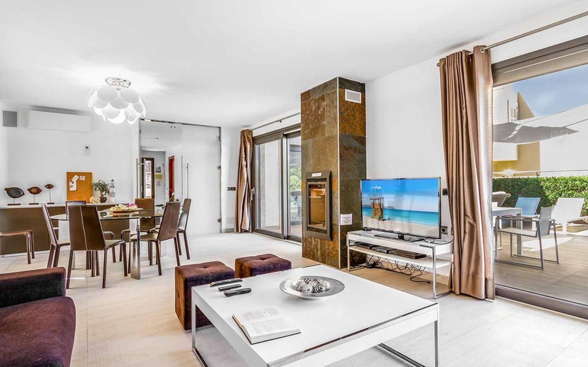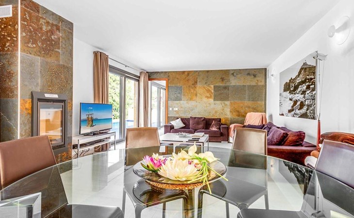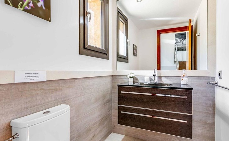 Das geschmackvoll eingerichtete Wohn-/Esszimmer hat ebenfalls einen direkten Zugang zur Terrasse und ist mit Satellitenfernsehen und DVD-Player mit einem spektakulären Soundsystem ausgestattet. Der Waschraum vervollständigt diesen Bereich.
