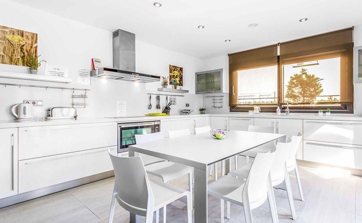 Neben dem Haupteingang befindet sich ein Doppelschlafzimmer mit eigenem Bad und direktem Zugang zu den Terrassen. Separat gibt es eine moderne und geräumige Küche, ebenfalls mit Zugang zur Terrasse und zum Poolbereich durch Schiebetüren. Die Küche ist komplett ausgestattet, einschließlich eines doppelten Kühl-/Gefrierschranks und eines bequemen Tisches mit Platz für 6 Personen.