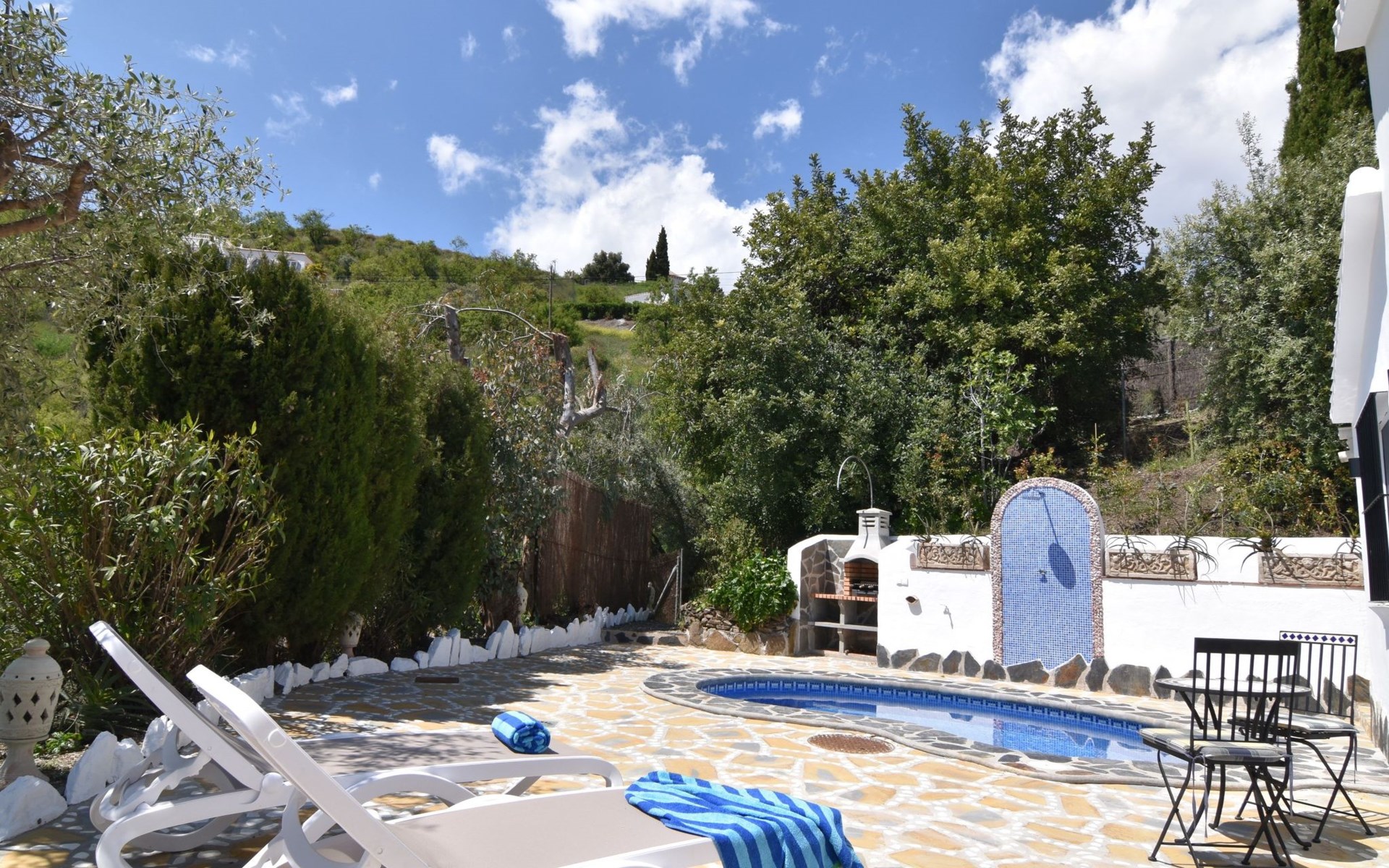 Die überdachte Außenterrasse ist ideal für Mahlzeiten im Freien, bei denen man die herrliche Aussicht auf den Garten und die Berge genießen kann. Auf der Rückseite des Hauses lädt ein kleiner Pool zum Schwimmen ein, und der Grillplatz verleiht Ihrem Aufenthalt im Freien eine einzigartige Note.