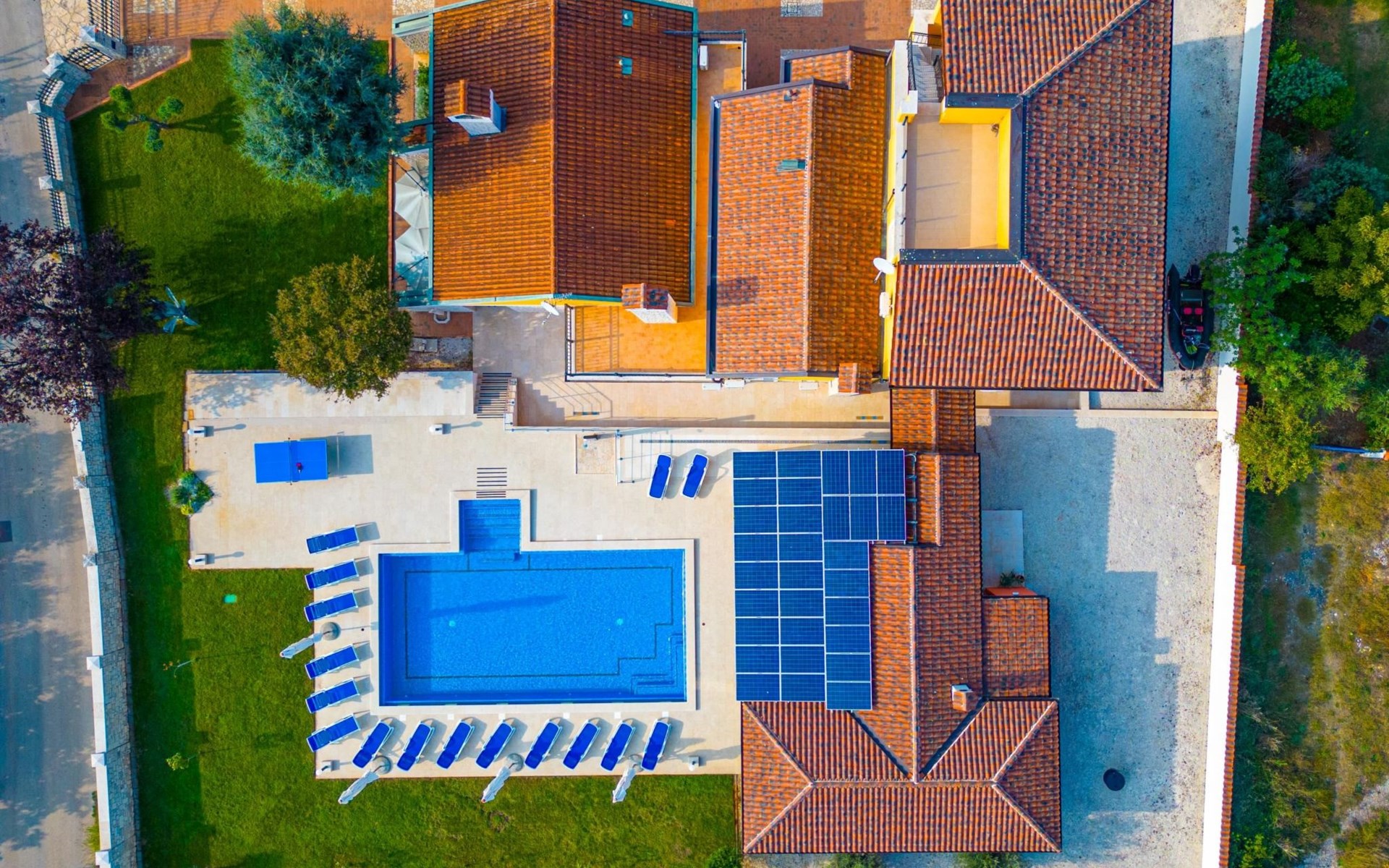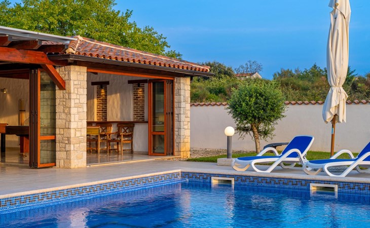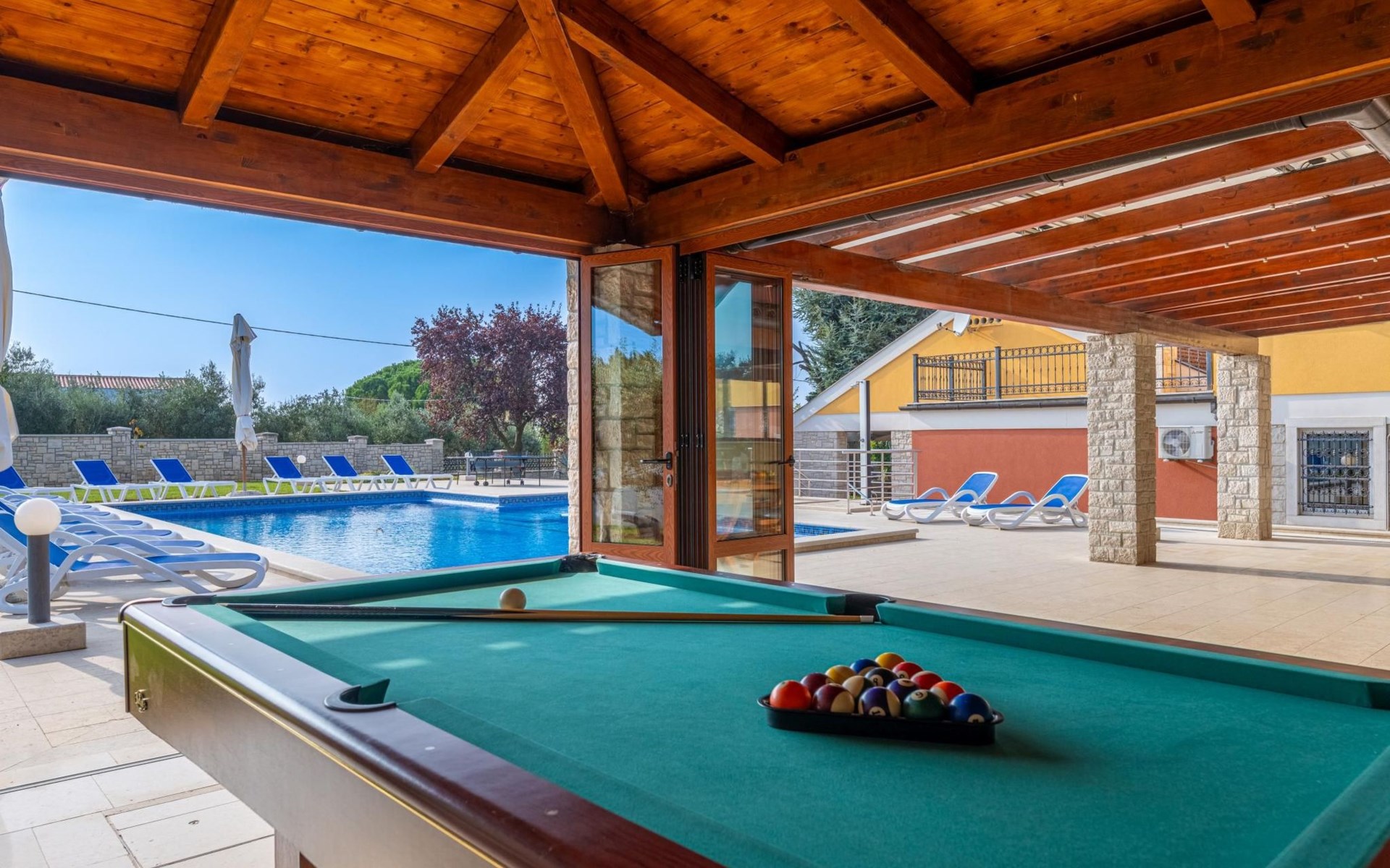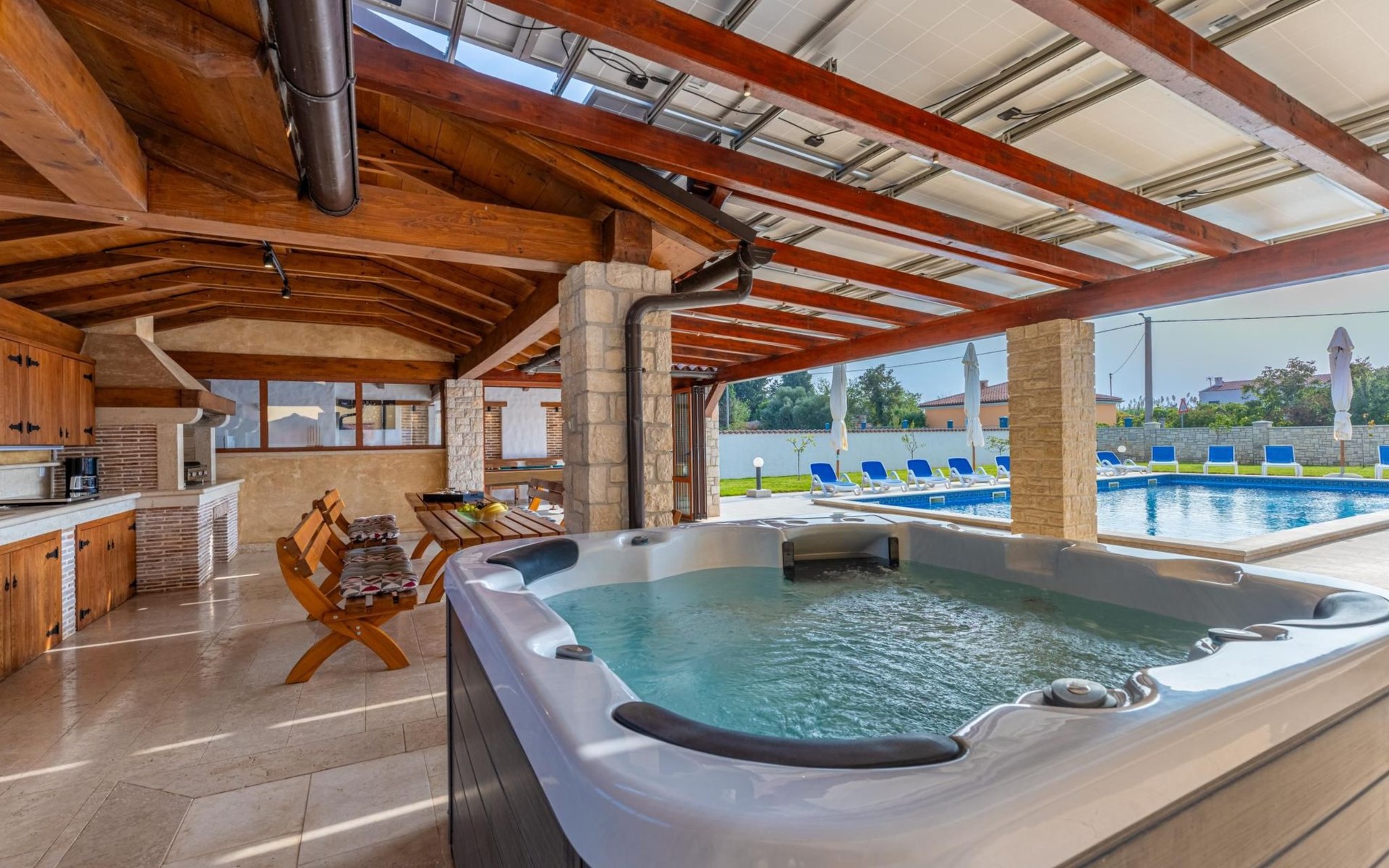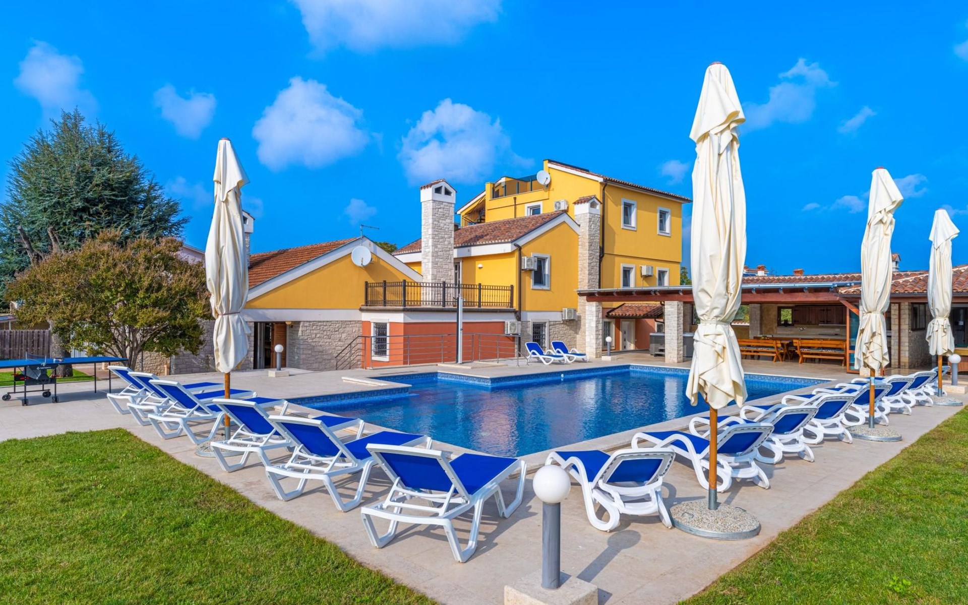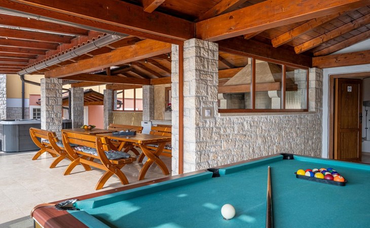 Der Außenbereich der Villa Suzanne bietet den Gästen einen großen Swimmingpool von 80 m2, 16 Liegestühle zum Sonnenbaden, Billard, Tischtennis, Tischfußball, Darts, eine Sommerküche mit Grill und einen Esstisch für 16 Personen.