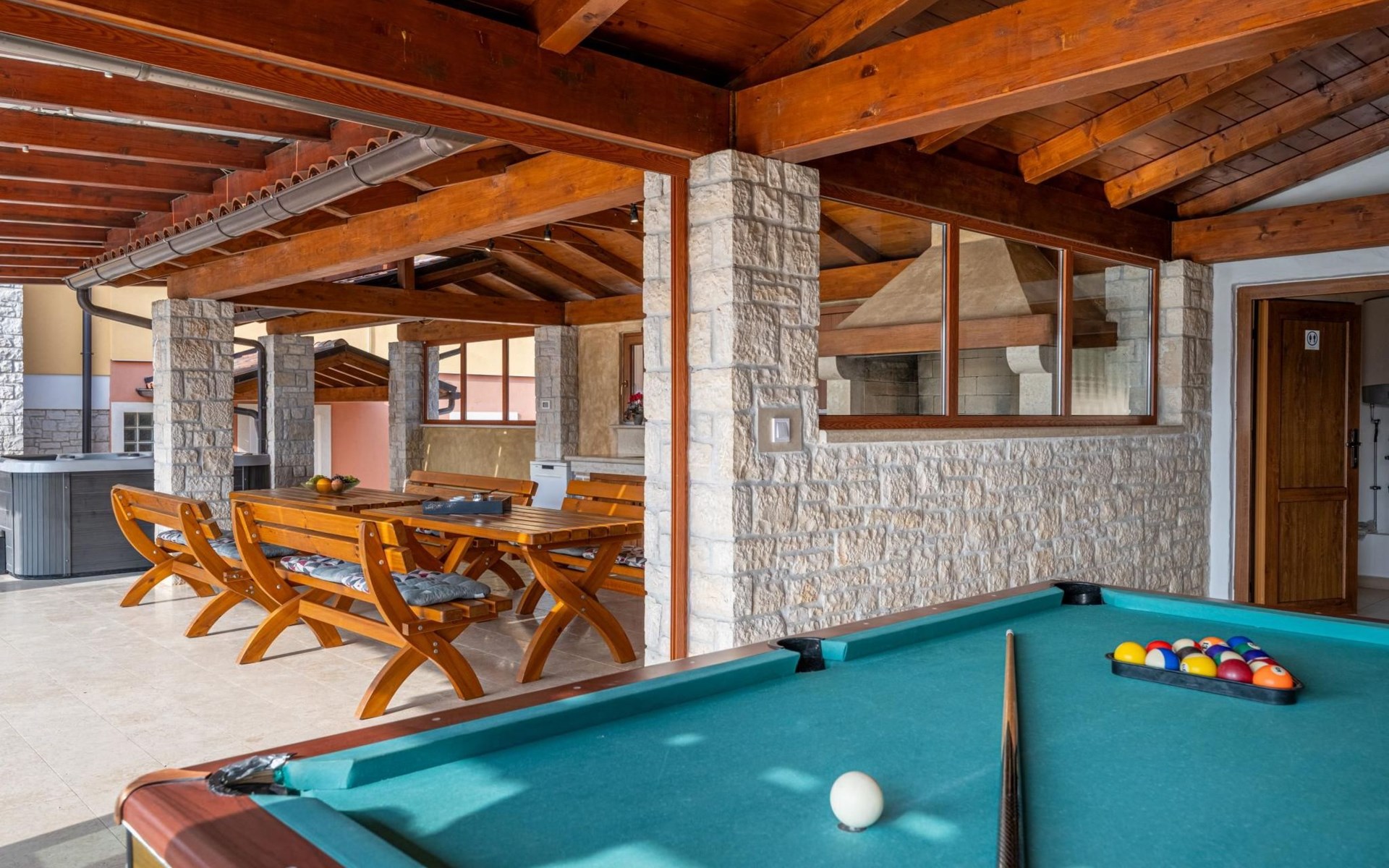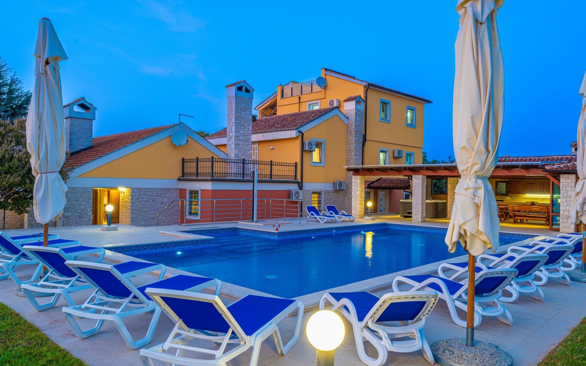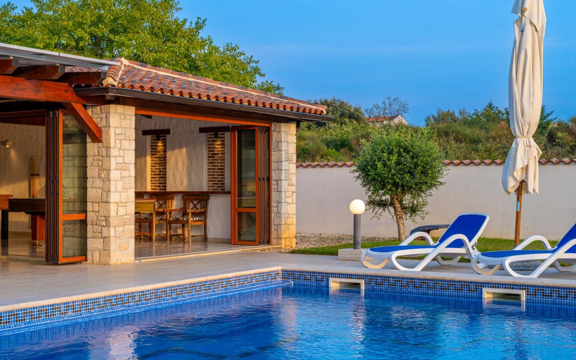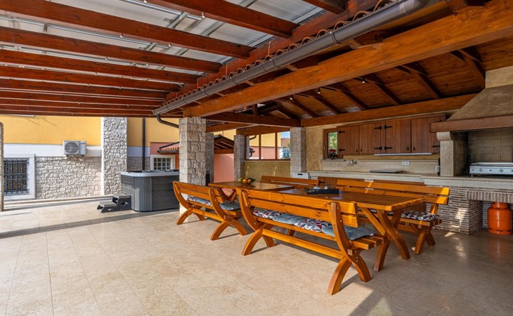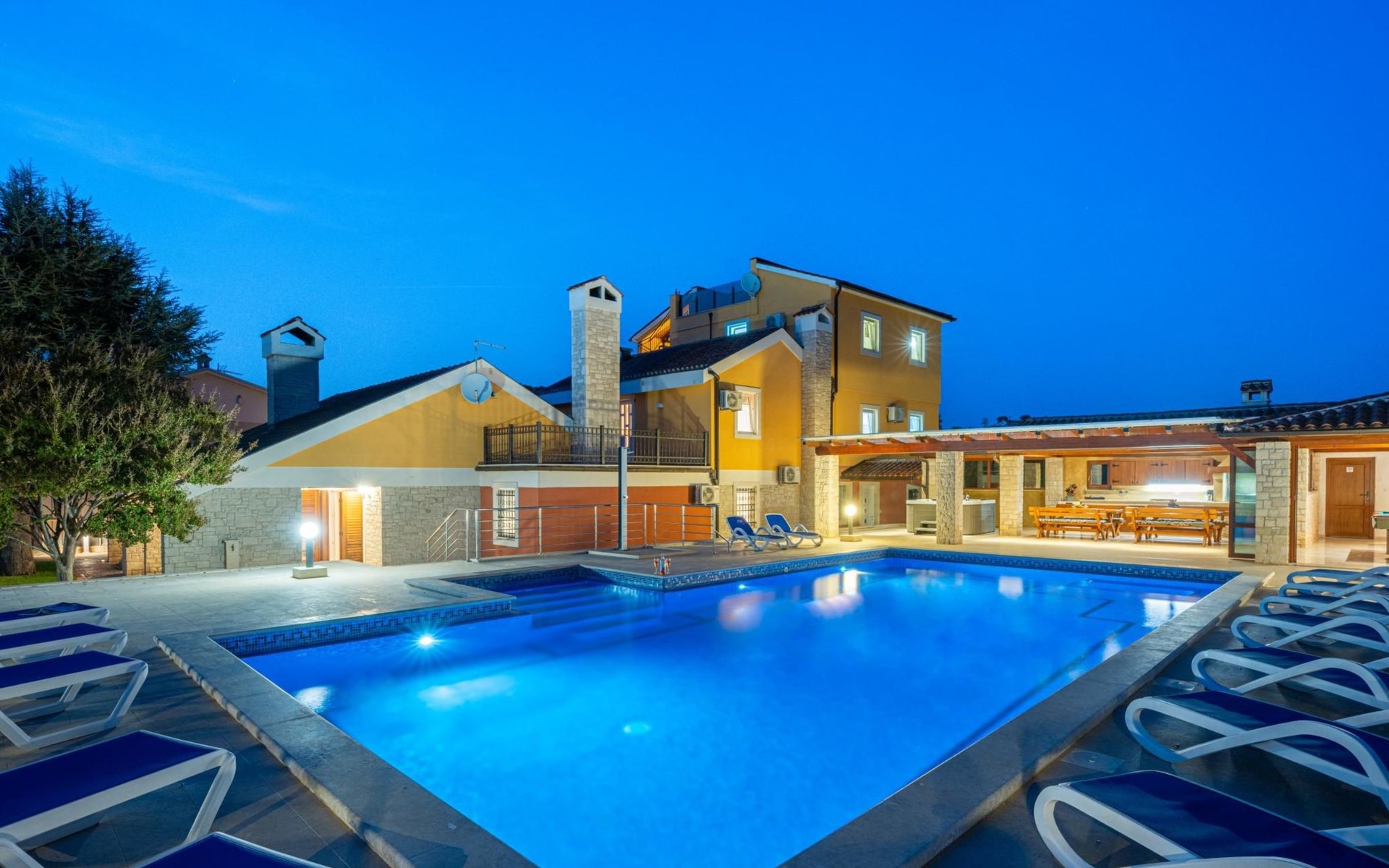 Der Außenbereich der Villa Suzanne bietet den Gästen einen großen Swimmingpool von 80 m2, 16 Liegestühle zum Sonnenbaden, Billard, Tischtennis, Tischfußball, Darts, eine Sommerküche mit Grill und einen Esstisch für 16 Personen.