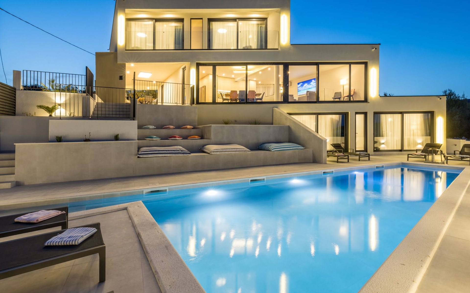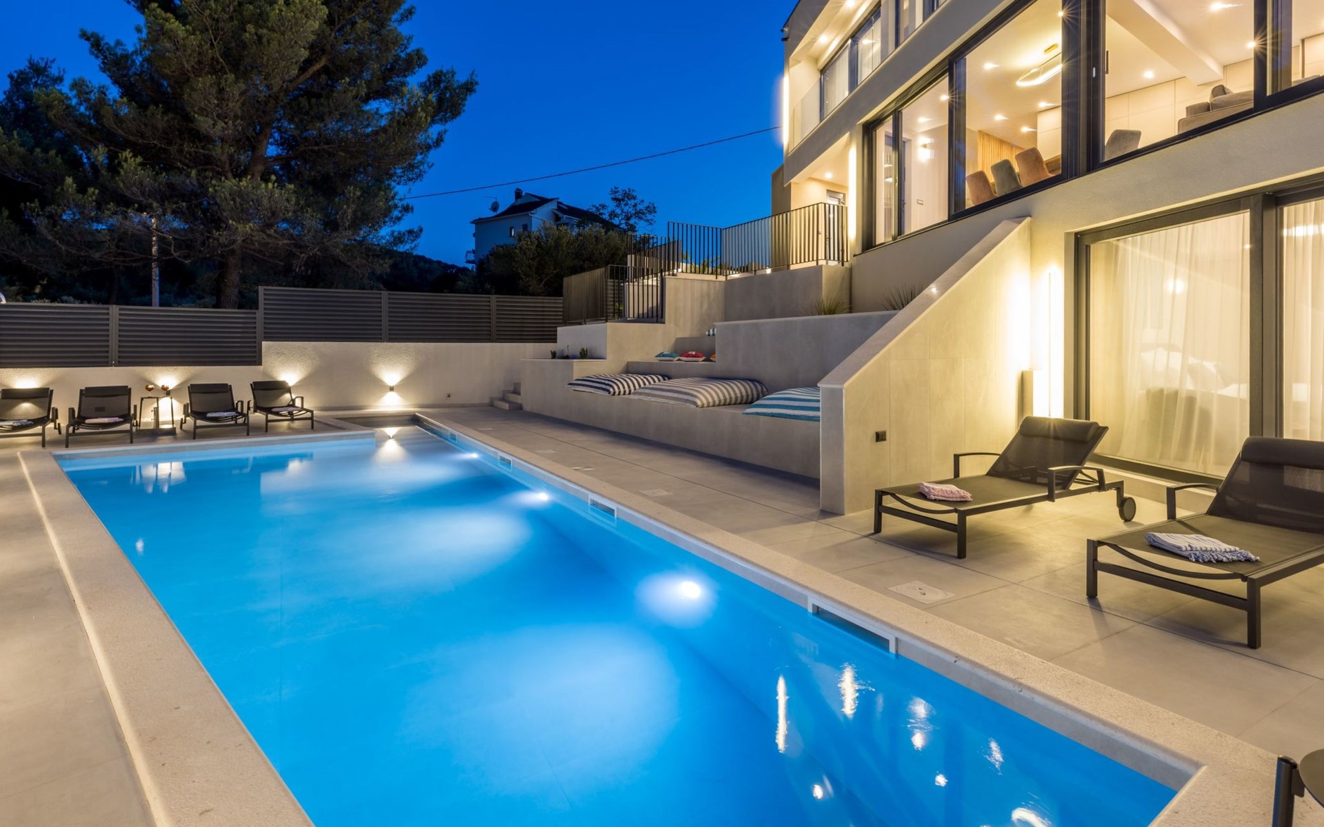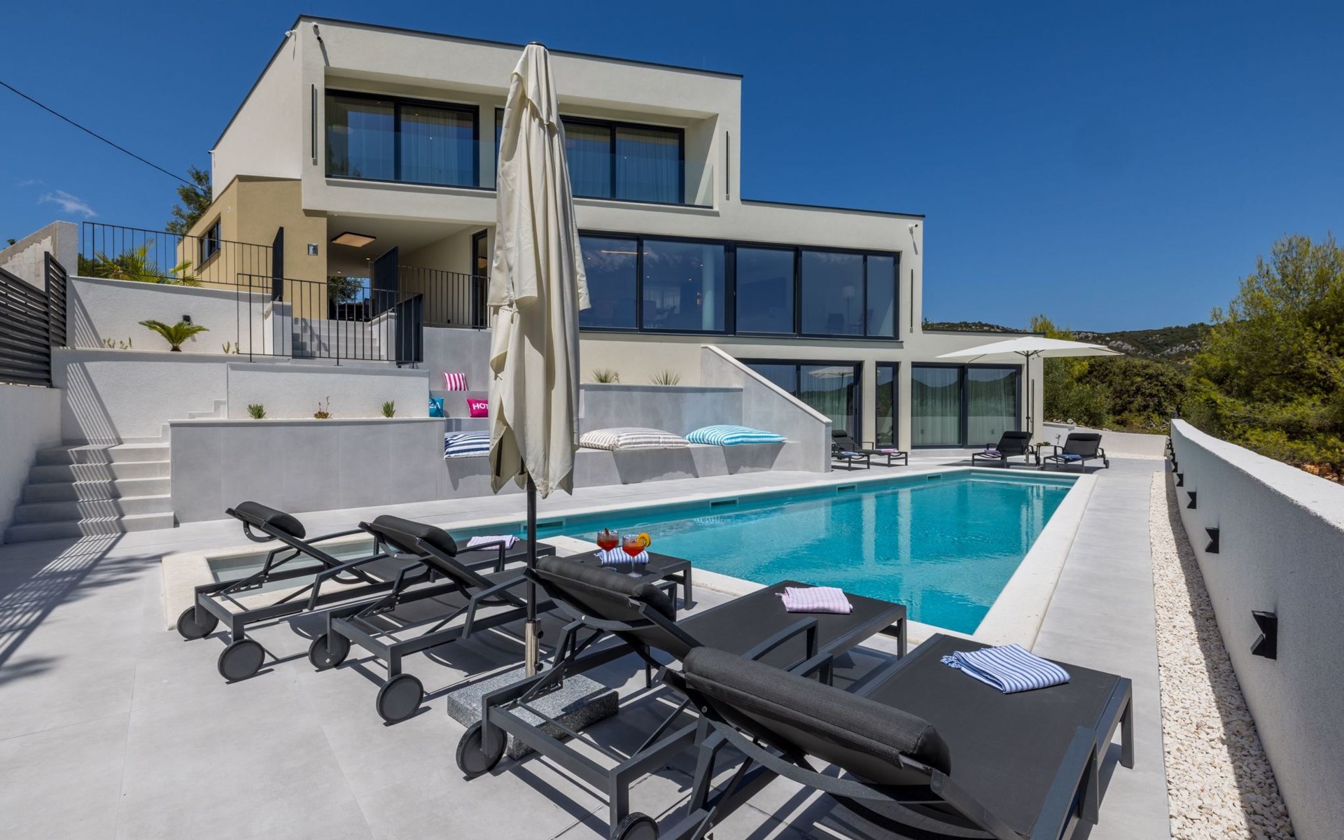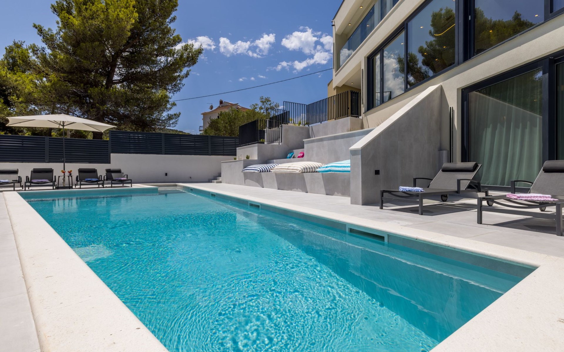 Der Außenbereich dieses Anwesens ist ebenso einladend, mit einer überdachten Küche mit Gasgrill und einem großen Pool mit großzügigem Lounge-Bereich, der Ihnen zur alleinigen Nutzung zur Verfügung steht. Die Villa ist komplett eingezäunt, was sie zu einem sicheren Ort für Ihre kleinen Hunde macht. Die beiden Schlafzimmer im Obergeschoss verfügen über einen Balkon, auf dem Sie die frische dalmatinische Luft in aller Ruhe genießen können.