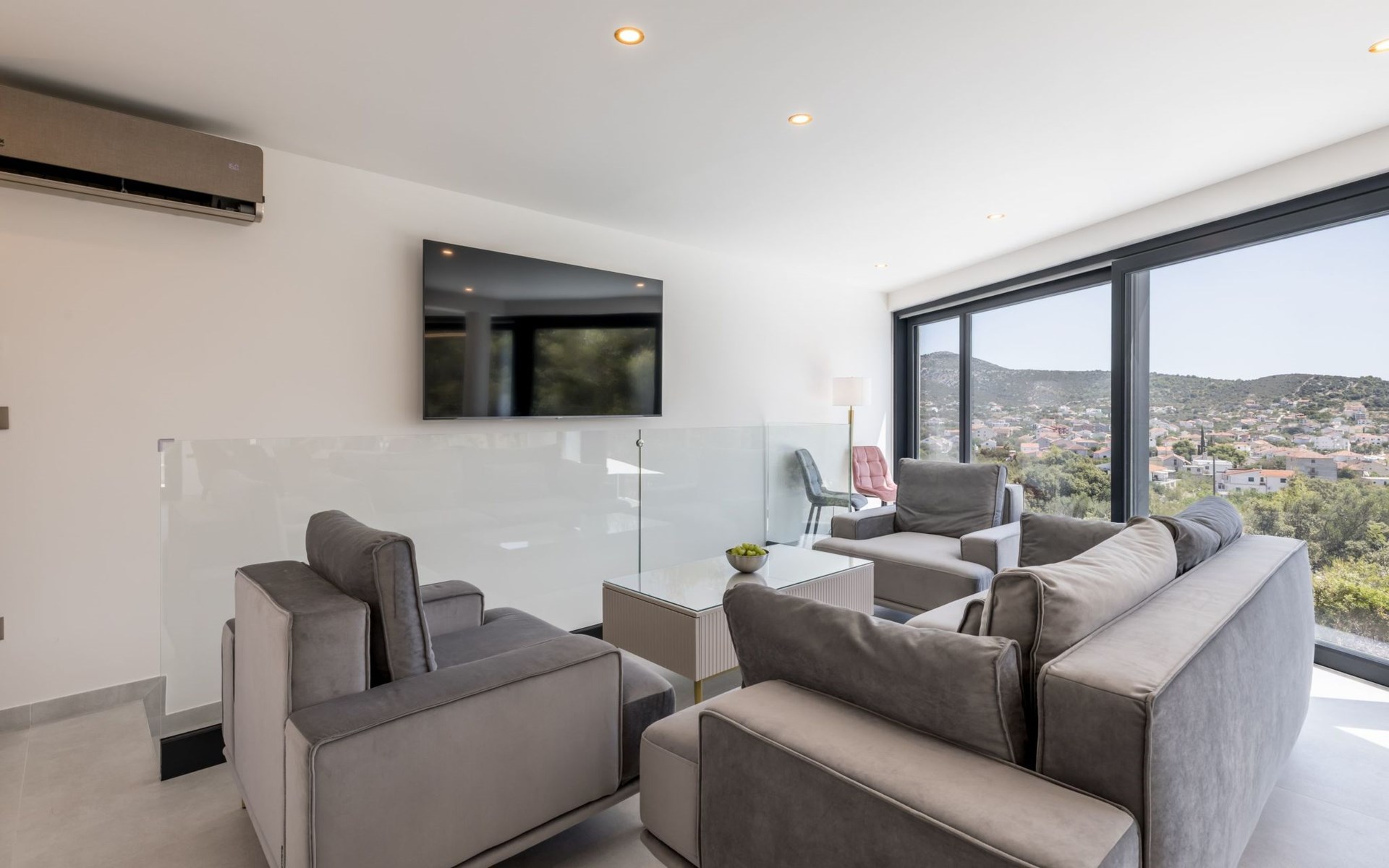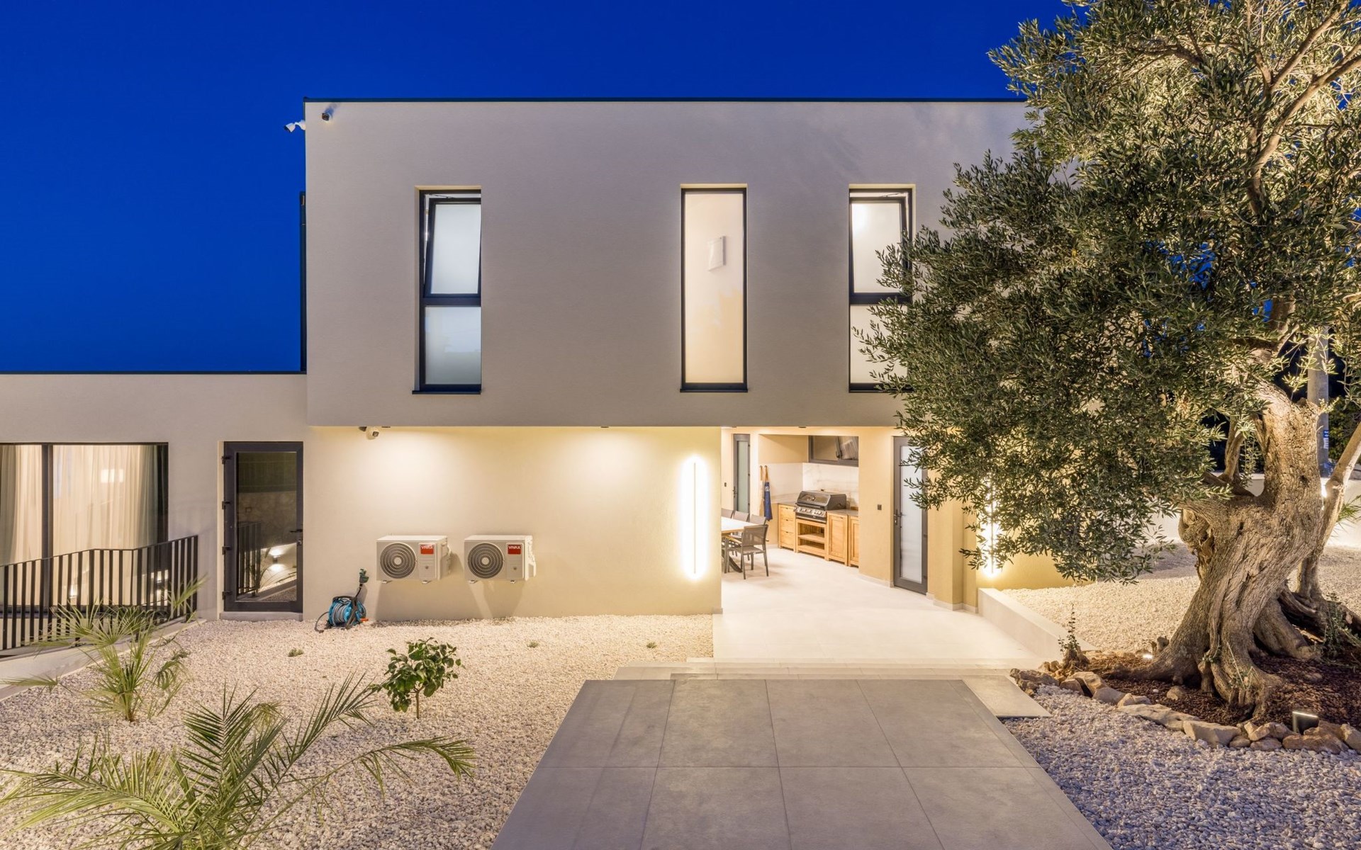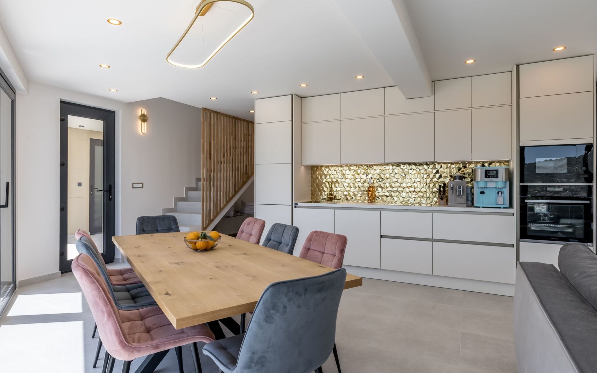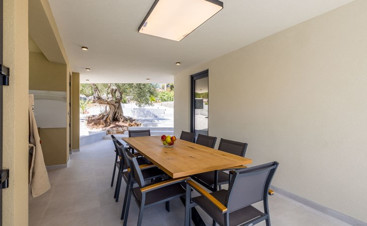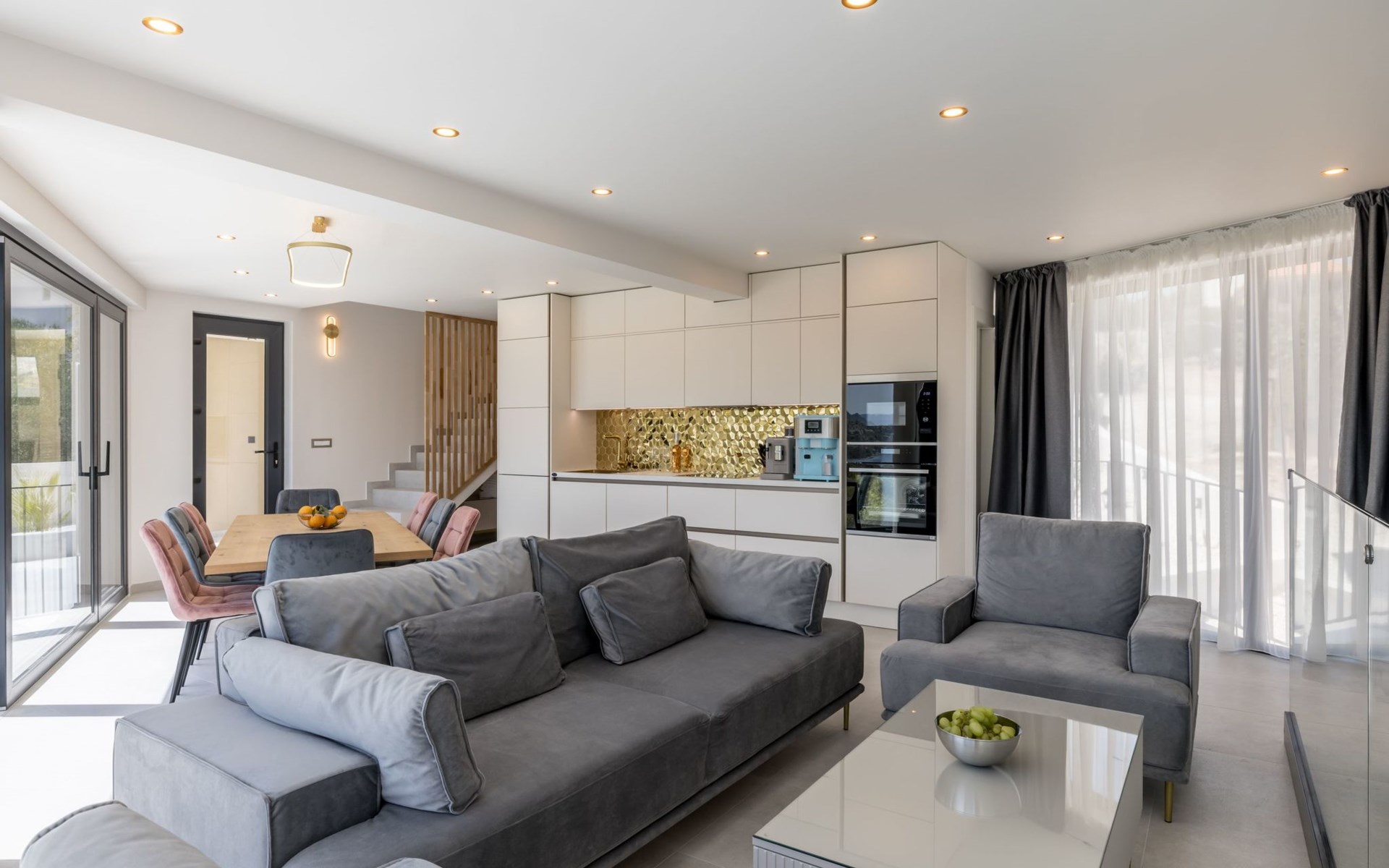 Im Inneren bietet das Haus eine Reihe von Annehmlichkeiten, die alle Ihre Bedürfnisse erfüllen. Mit vier Schlafzimmern und vier eigenen Badezimmern hat jeder in Ihrer Gruppe seinen eigenen Raum und seine eigene Privatsphäre. Die Klimaanlage in der gesamten Villa sowie die Fußbodenheizung im Wohnzimmer und in den Badezimmern sorgen für einen angenehmen Aufenthalt, egal zu welcher Jahreszeit. Für zusätzlichen Komfort sind eine Waschmaschine und ein Wäschetrockner zur alleinigen Nutzung sowie Smart-TVs zur Unterhaltung im Wohnzimmer und in jedem Schlafzimmer vorhanden. Die Küche enttäuscht nicht: Sie verfügt über ein Induktionskochfeld, eine De Longhi-Kaffeemaschine und eine Nespresso-Maschine, einen Geschirrspüler und einen Wasserkocher, so dass die Zubereitung von Mahlzeiten ein Kinderspiel ist.