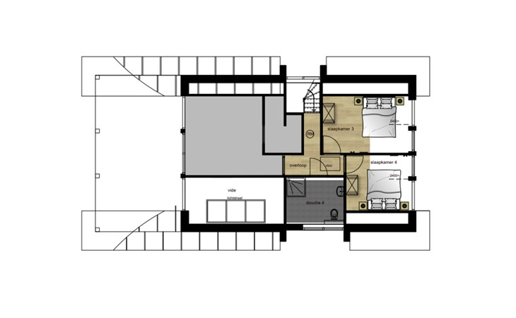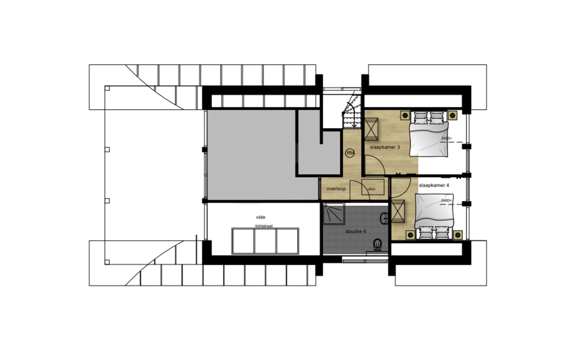 Der zweite Stock verfügt über zwei Schlafzimmer und ein Badezimmer. Das zweite Schlafzimmer ist mit zwei Etagenbetten ausgestattet, ideal für Kinder oder zusätzliche Gäste.