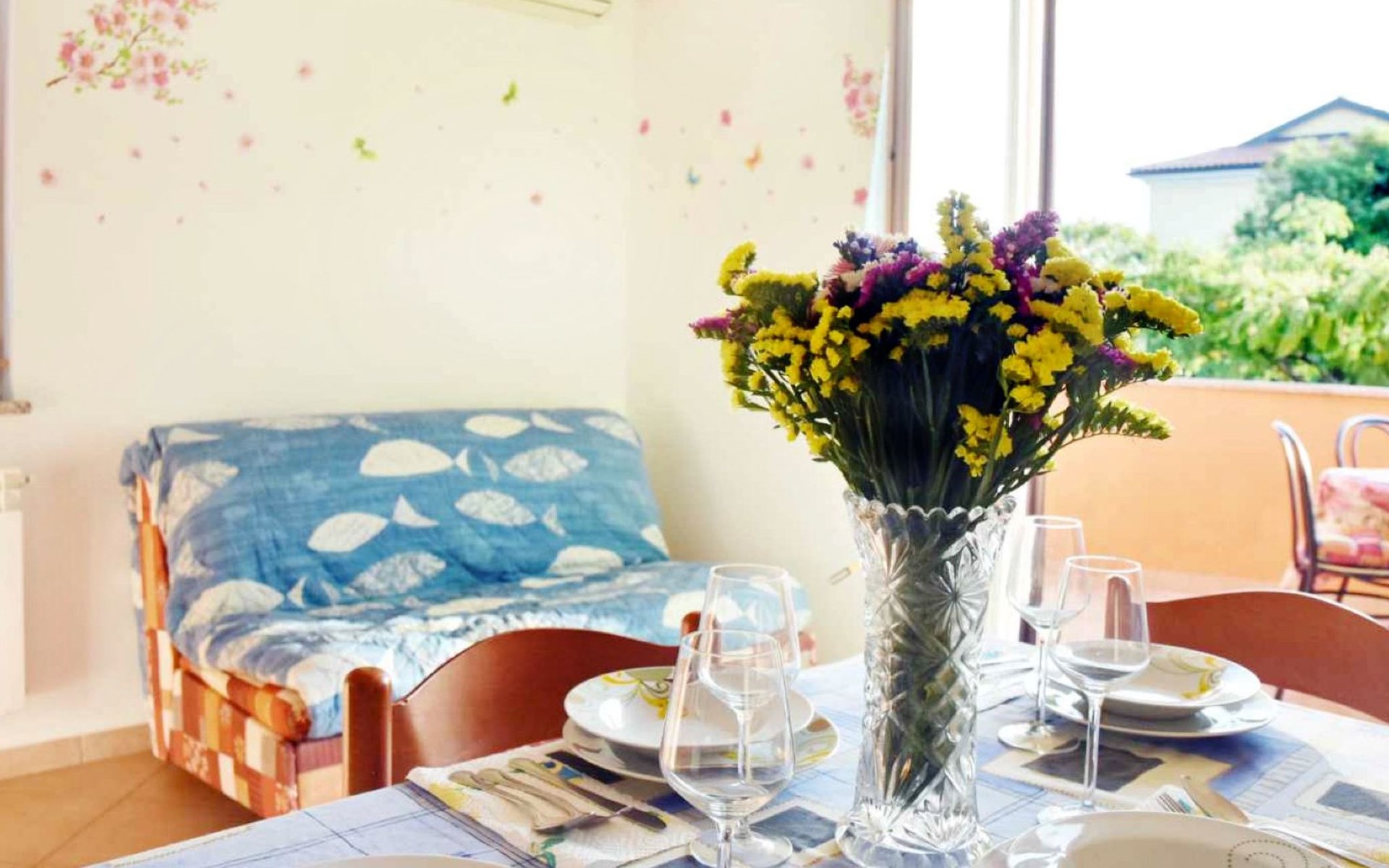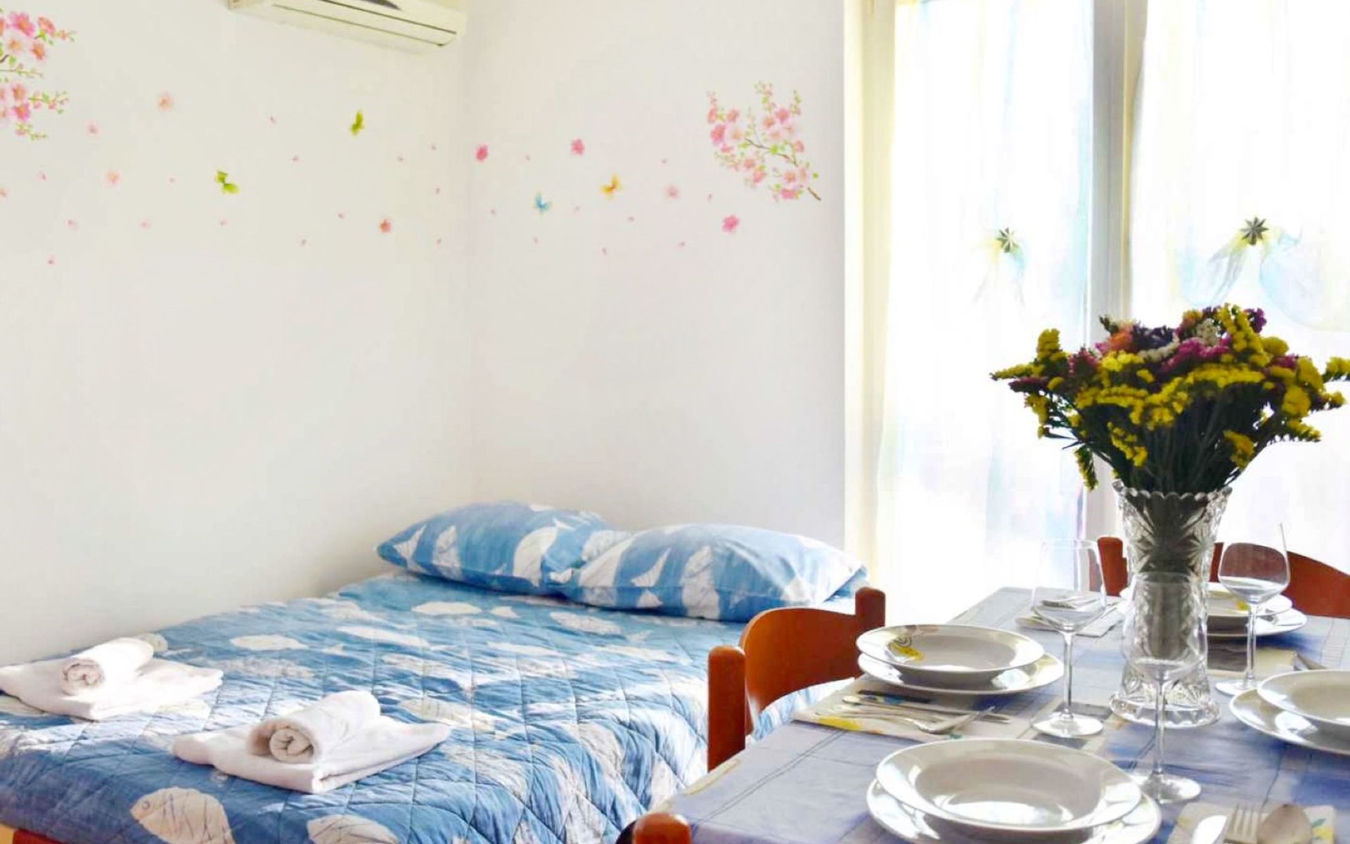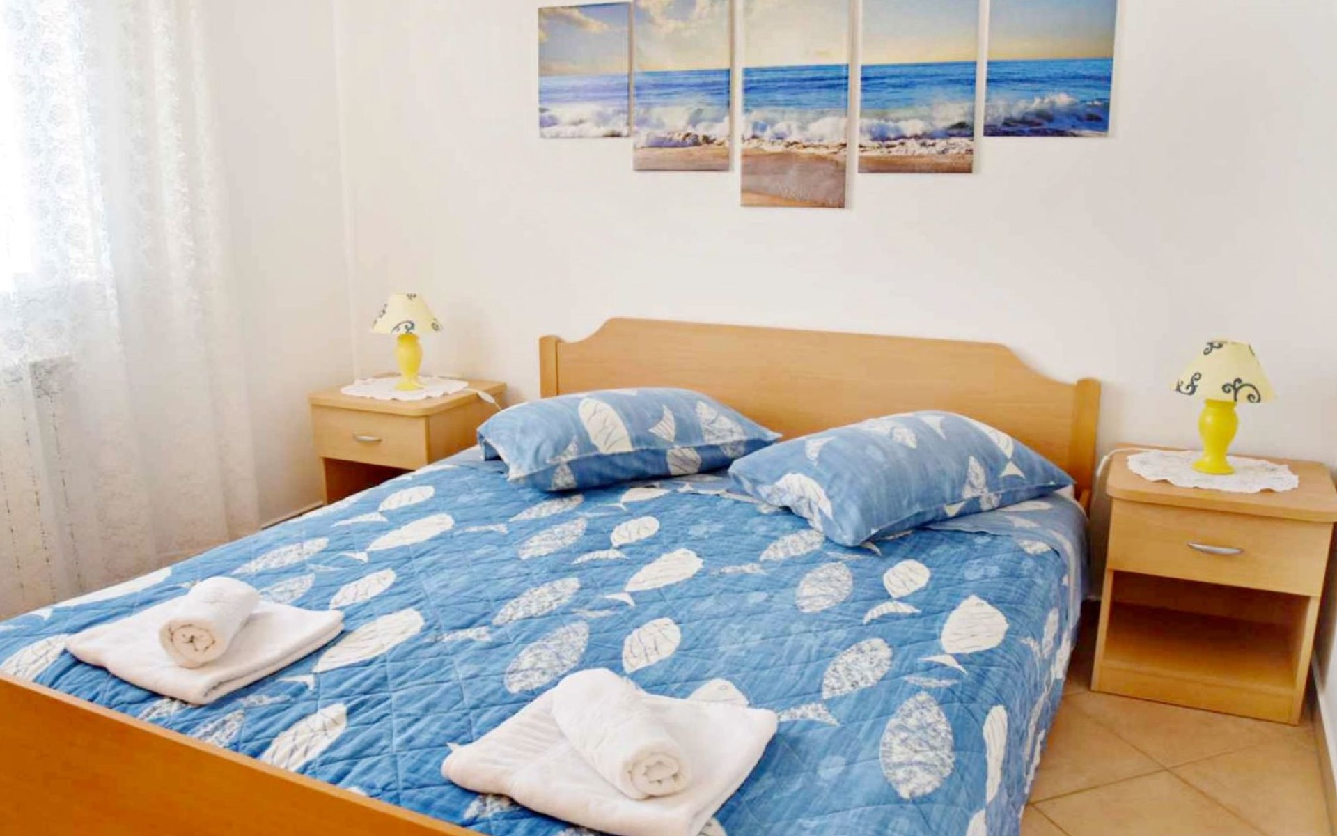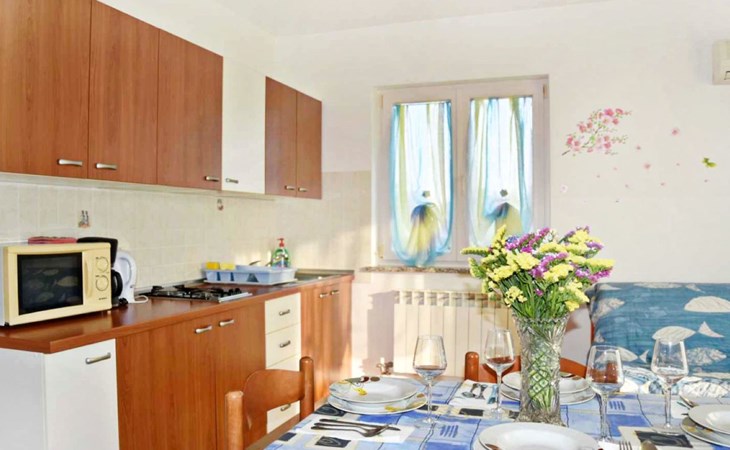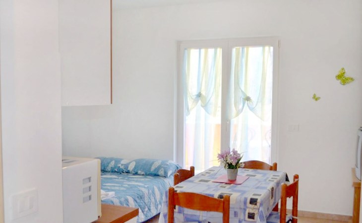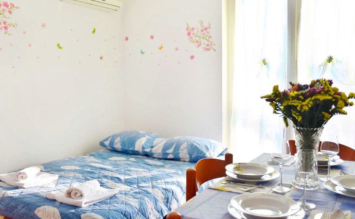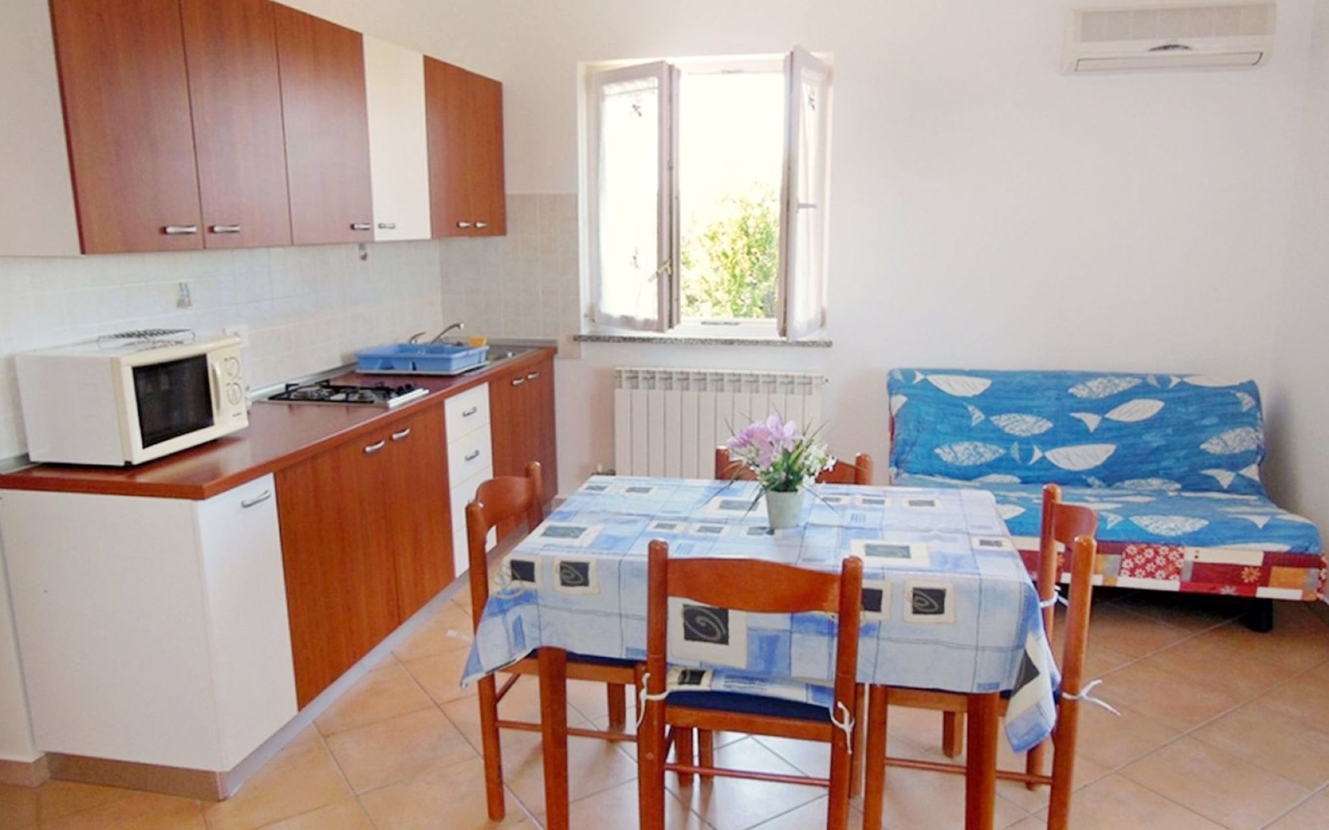 Die Wohnung im ersten Stock verzaubert mit ihrer hellen und klimatisierten Atmosphäre sowie einer liebevollen Inneneinrichtung. Das Schlafzimmer, mit einem gemütlichen Doppelbett und feinster Bettwäsche ausgestattet, ist eine Einladung zum Träumen. Der Wohnbereich punktet mit einer gut ausgestatteten Küche (Wasserkocher, Kaffeemaschine, Mikrowelle, Herd), einem komfortablen Schlafsofa für zusätzliche Gäste, einem Flachbild-Sat-TV und kostenlosen WLAN. Ein Highlight ist der Balkon mit Tisch und Stühlen, der einen Blick auf das Meer in der Ferne gewährt. Das Badezimmer, ausgestattet mit Dusche, WC und einem Fön, verstärkt den Komfort, wobei jedem Gast zwei Badetücher zur Verfügung stehen.