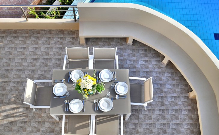 Der geräumige private Poolbereich und die vordere Veranda, ausgestattet mit einem Esstisch im Freien, 6 Sonnenliegen und einem Sonnenschirm, sind ein idealer Ort für romantische Abende, um einen Cocktail zu trinken oder ein Abendessen im Mondlicht zu genießen.