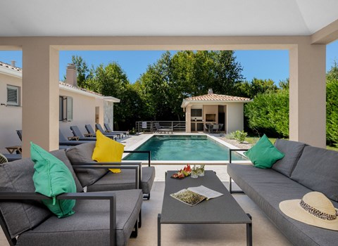 Die Wohnung befindet sich in einer schönen neuen Villa, die ihren Gästen eine schöne Liegewiese und einen Swimmingpool mit Liegestühlen bietet.