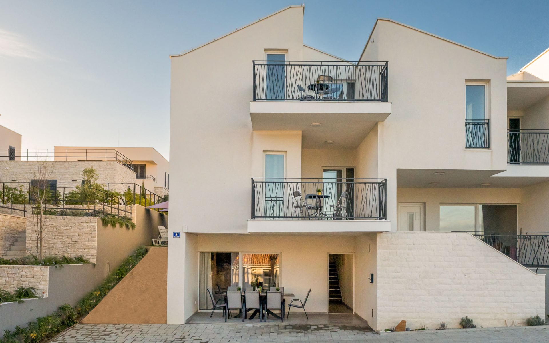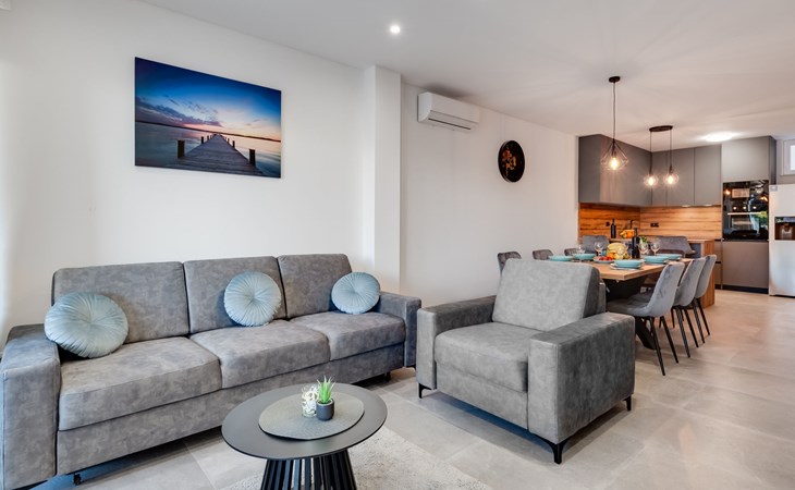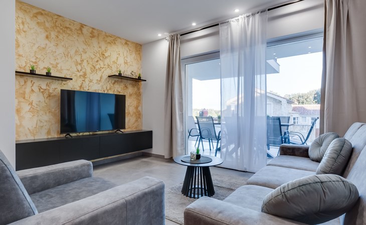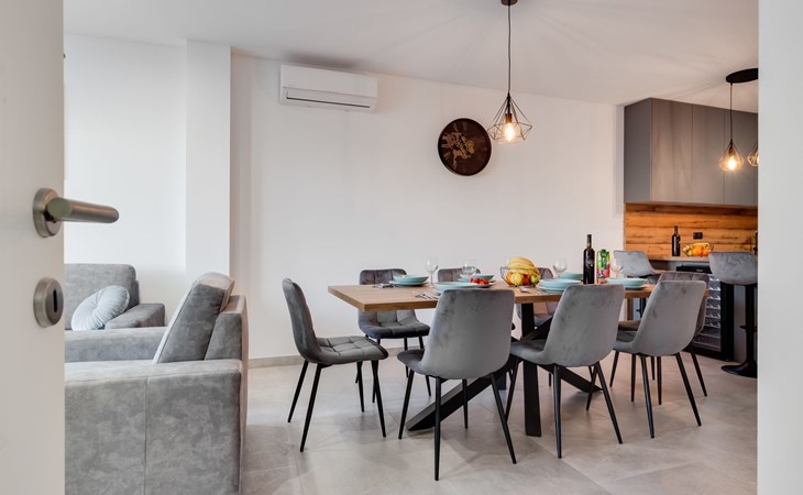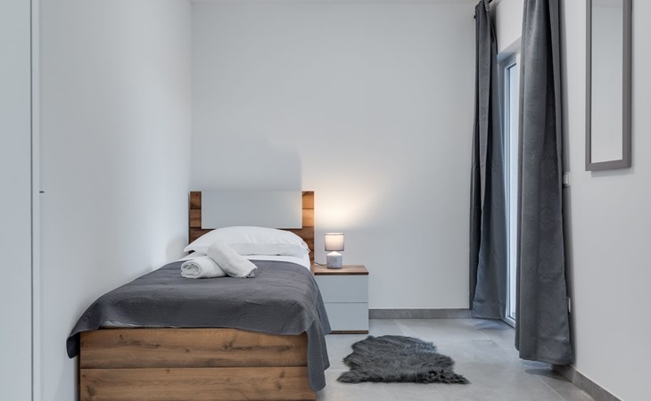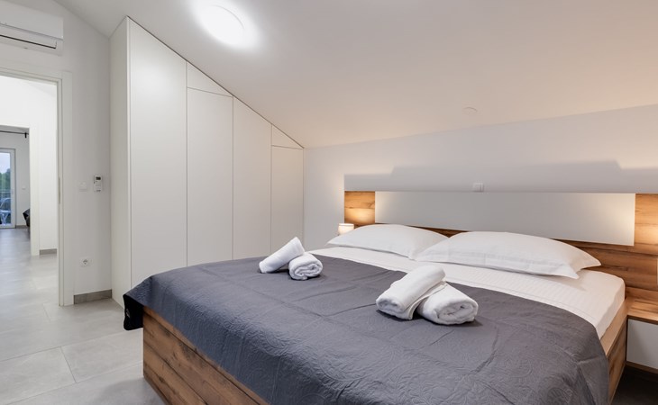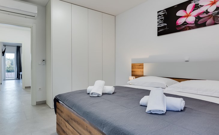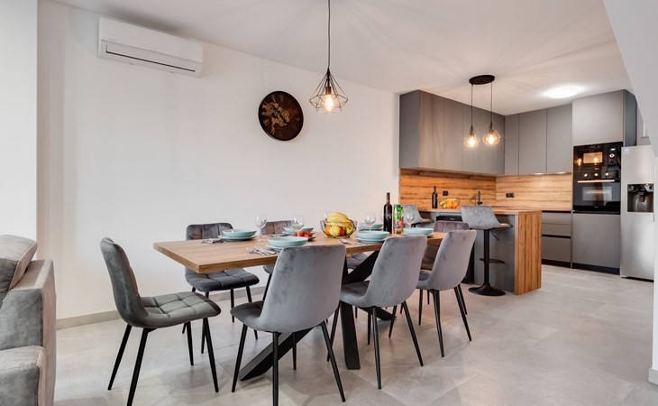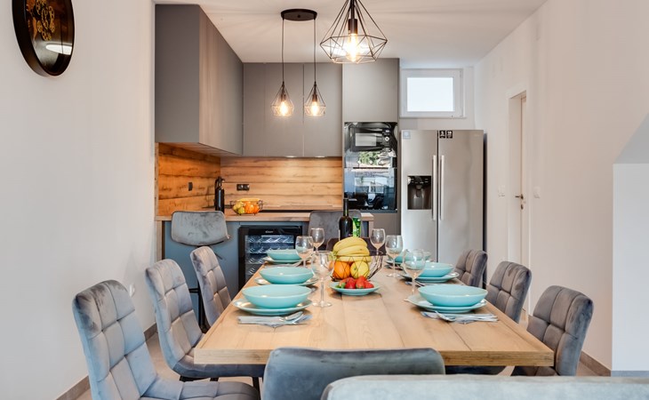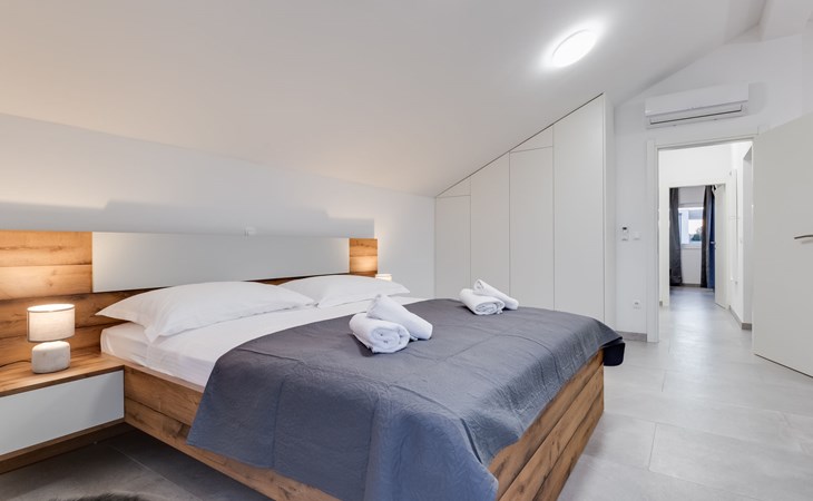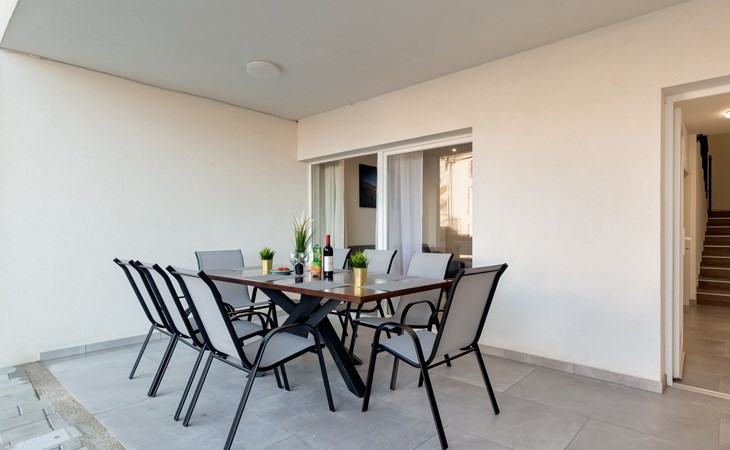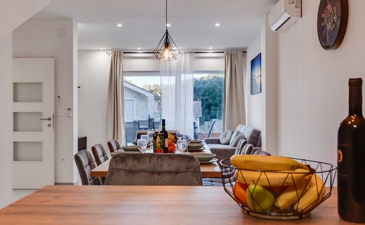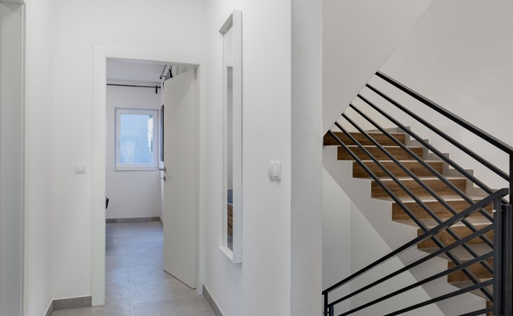 Reihenhaus "Tica", auf 3 Stockwerken, Baujahr 2023. 1.3 km vom Zentrum von Zaton, 4 km vom Zentrum von Nin, 14 km vom Zentrum von Zadar, sonnige Lage am Hang, 150 m vom Meer, 150 m vom Strand. Zur Alleinbenutzung: Grundstück 50 m2. Sprudelbad. Im Hause: Internetzugang, Waschmaschine. Parkplatz (für 2 Autos) beim Haus auf dem Grundstück. Einkaufsgeschäft 1 km, Restaurant 1.2 km, Bushaltestelle 3.8 km, Sandstrand 150 m. Nahe gelegene Sehenswürdigkeiten: Holiday complex Zaton 2 km. Bitte beachten: Flugplatz 25 km vom Haus.