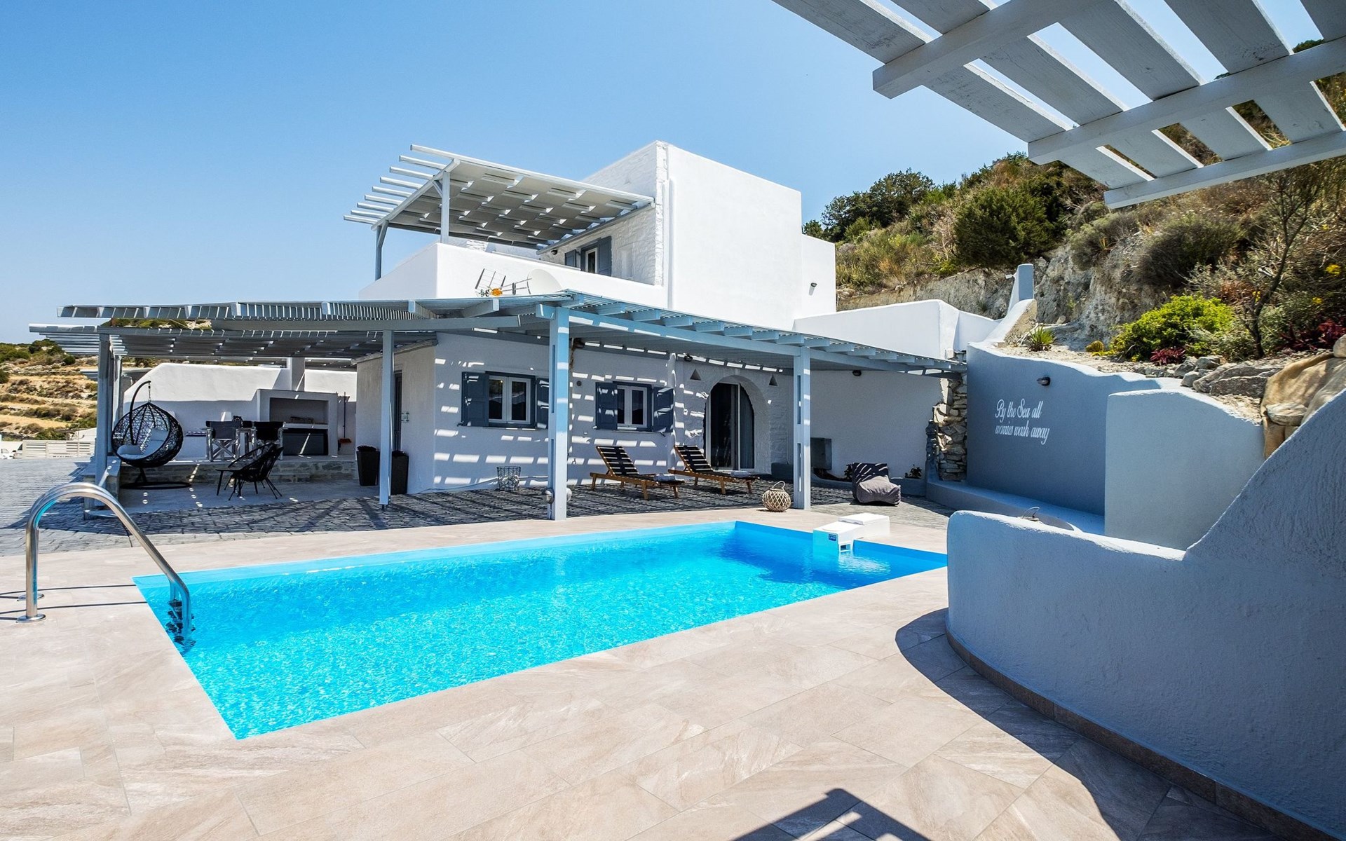 Der Außenbereich der Villa ist ebenso beeindruckend und verfügt über eine große Terrasse, auf der Sie im Freien speisen oder gemütliche Momente im Freien genießen können. Das Highlight ist der private Swimmingpool, der zu einem erfrischenden Bad einlädt oder einfach zum Entspannen. Für die Liebhaber des Kochens im Freien ist der Grillplatz ideal, um unvergessliche Mahlzeiten mit den Liebsten unter dem klaren Sternenhimmel zu veranstalten.