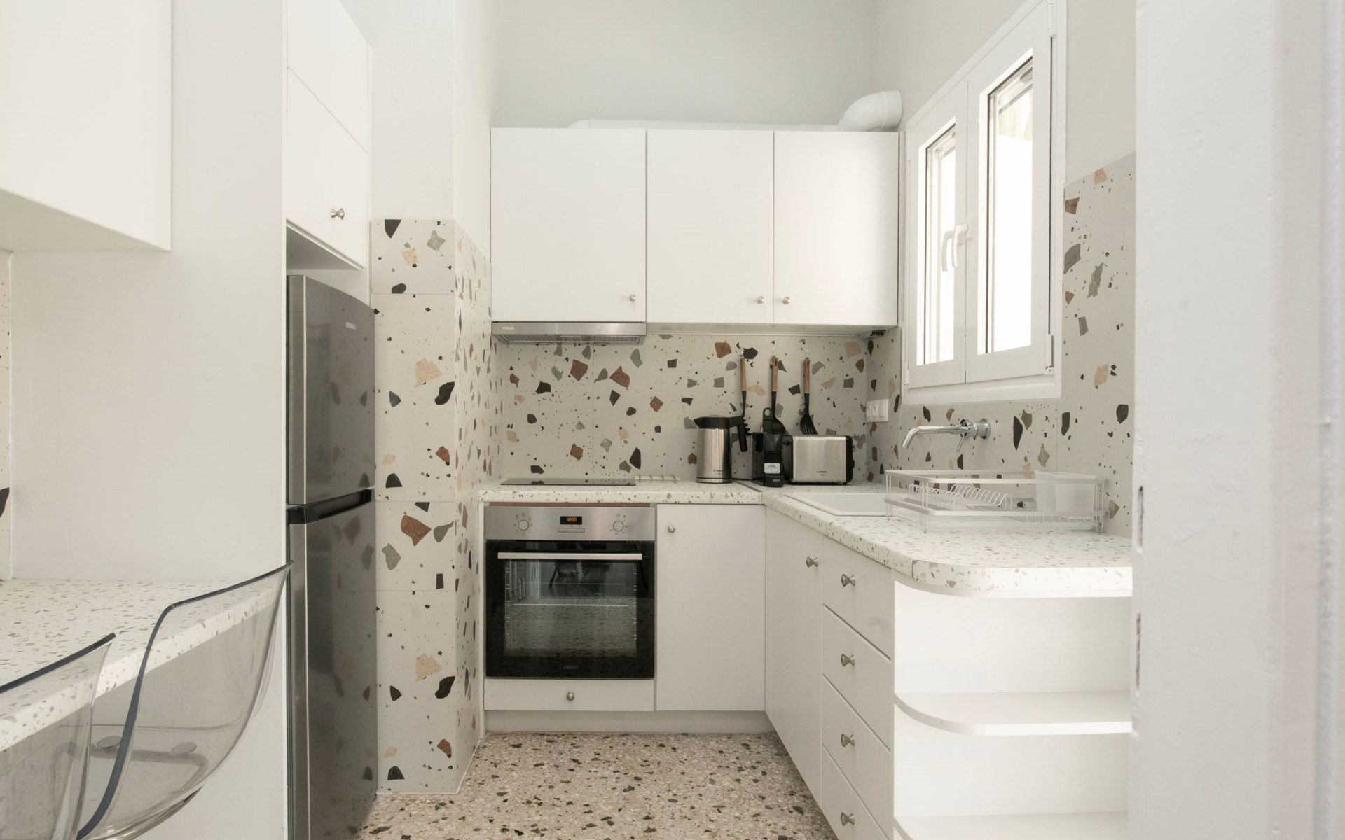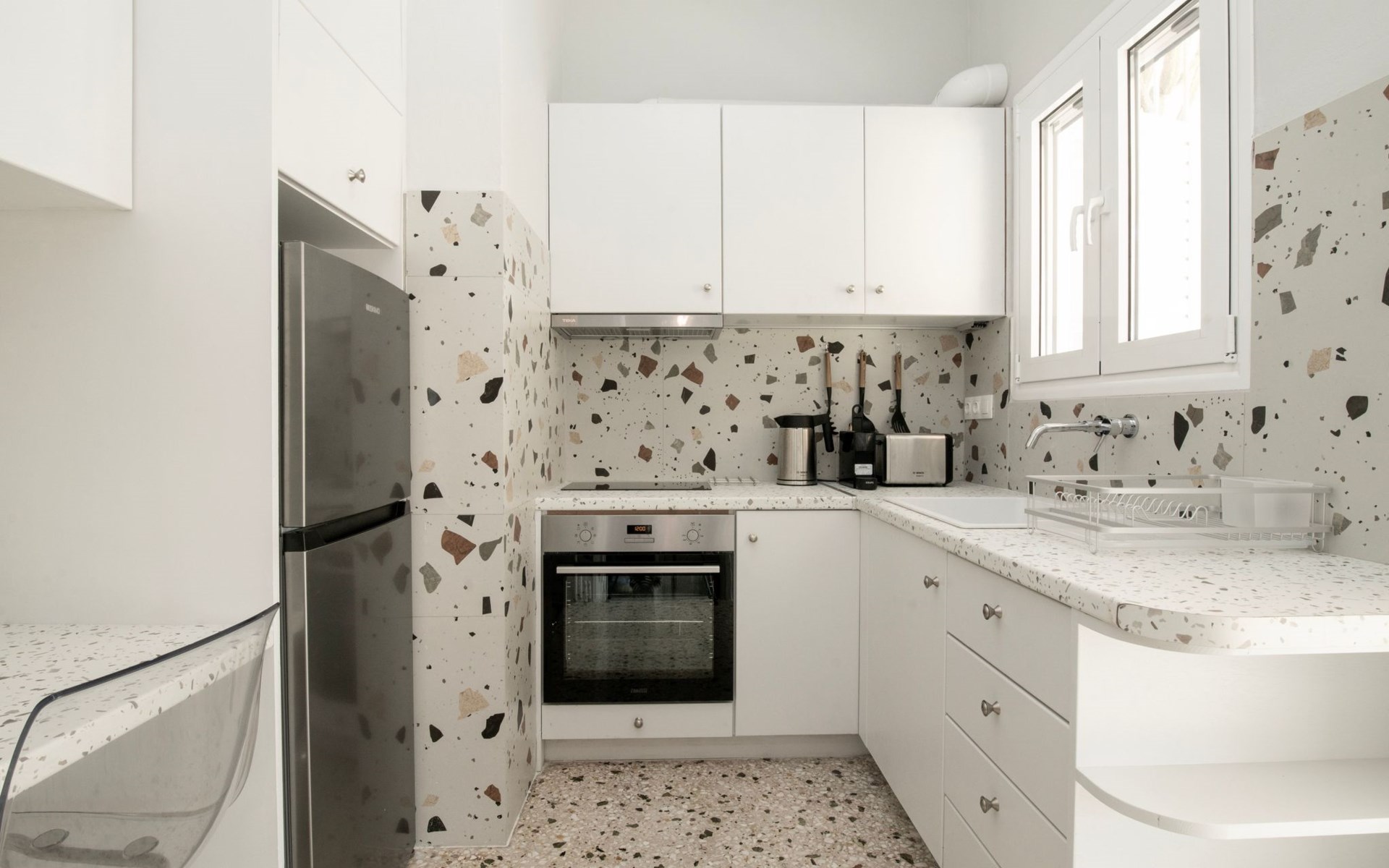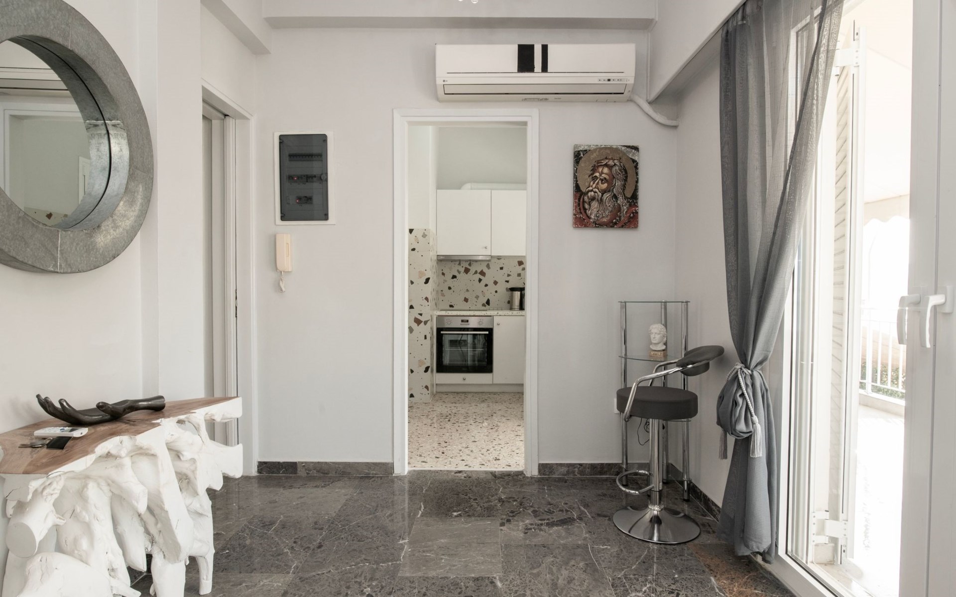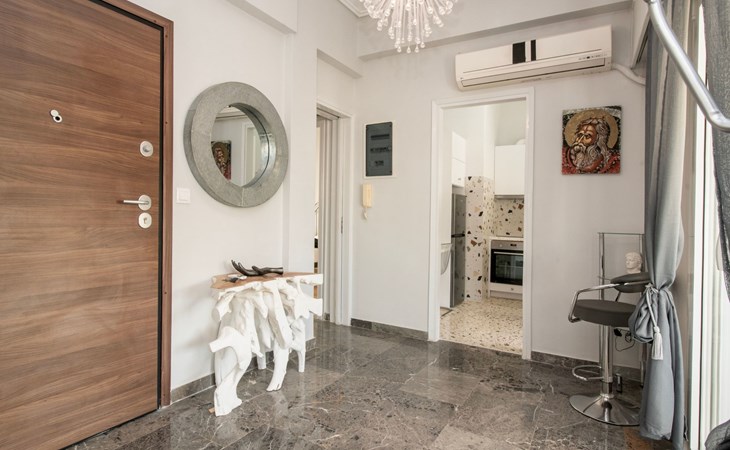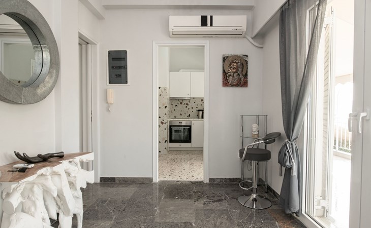 Das Innere des Hauses wurde sorgfältig eingerichtet, um Ihnen ein Höchstmaß an Komfort und Bequemlichkeit zu bieten. Es verfügt über eine voll ausgestattete Küche mit 3-Platten-Herd, Mini-Backofen, Kaffeemaschine, Espressokanne und Filterkaffeemaschine für einen guten Start in den Morgen. Die Wohnbereiche sind sowohl mit Decken- als auch mit Standventilatoren gekühlt, die eine Atempause von der Athener Sonne bieten, sowie mit einem Smart-TV für Ihre Unterhaltung. Unverzichtbare Annehmlichkeiten wie eine Waschmaschine und ein Wäschetrockner sind exklusiv verfügbar, um Ihren Aufenthalt zu verbessern.