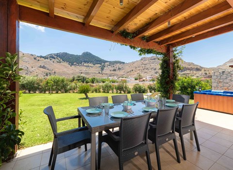 Der private Außenbereich der Villa Evelyn bietet einen üppigen grünen Garten mit bunten Blumen, Bäumen mit saisonalen Früchten und einem aus Stein gebauten Grill. Die Villa Evelyn ist eine ideale Wahl für Sie und Ihre Familie, die einen komfortablen und unvergesslichen Aufenthalt auf der Insel Lefkada verspricht, während Sie sich von der sanften Brise der Berge abkühlen lassen.