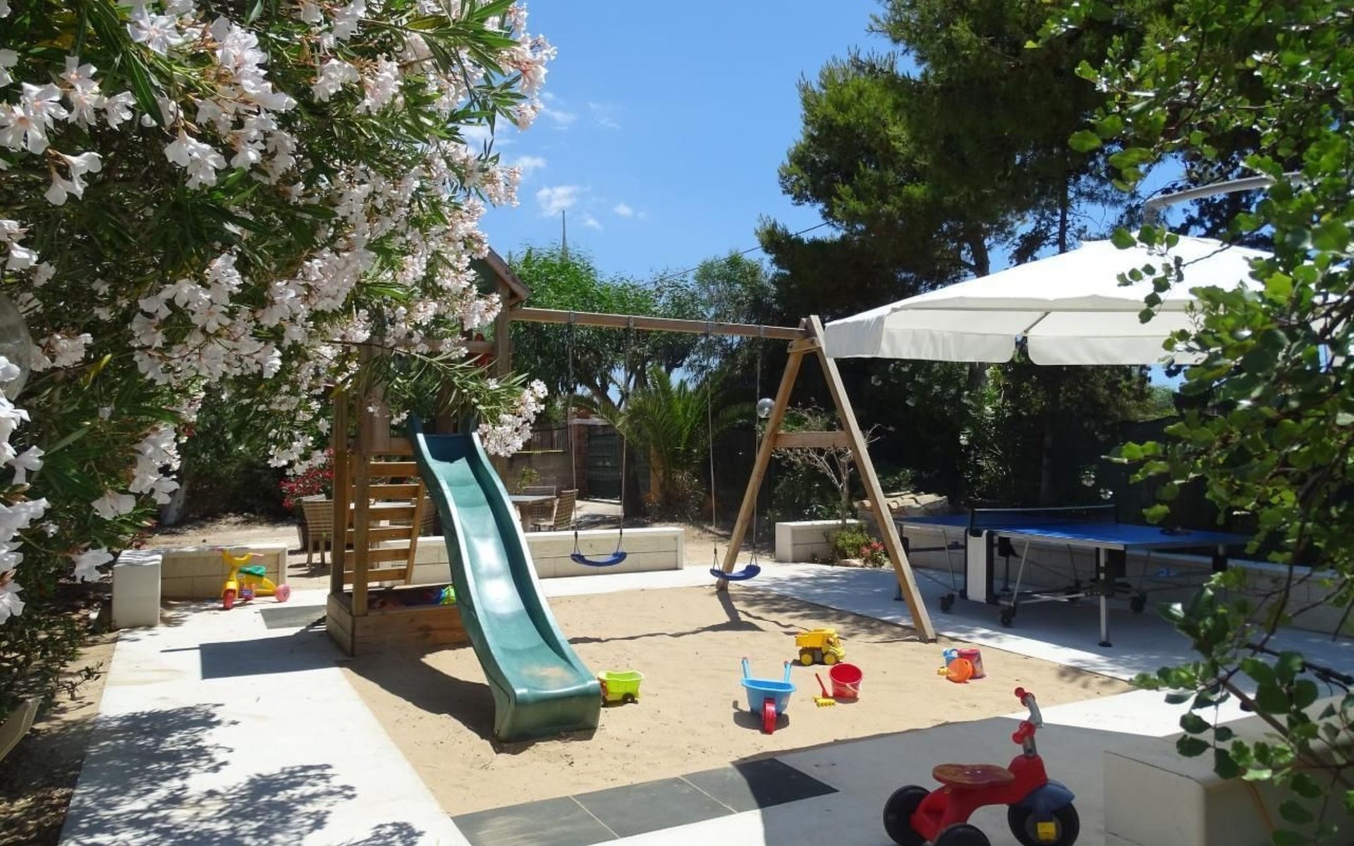 Für Spielspass der Kinder sorgt ein ganz neu angelegter Spielplatz und eine Tischtennisplatte.Der kleine Bungalow Park befindet sich inmitten einer grünen subtropisch angelegten Parkanlage, direkt gegenüber vom Sandstrand.Idealer Ausgangspunkt für Besichtigungen.