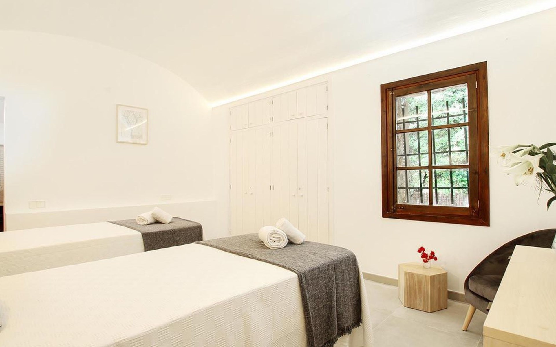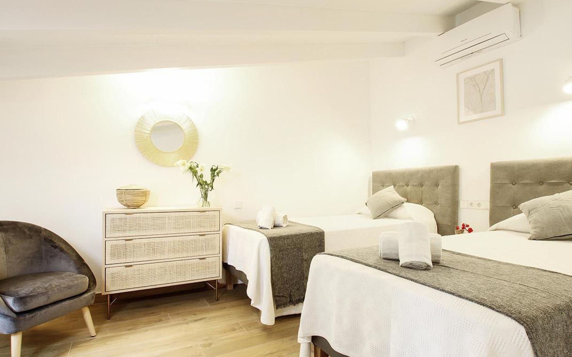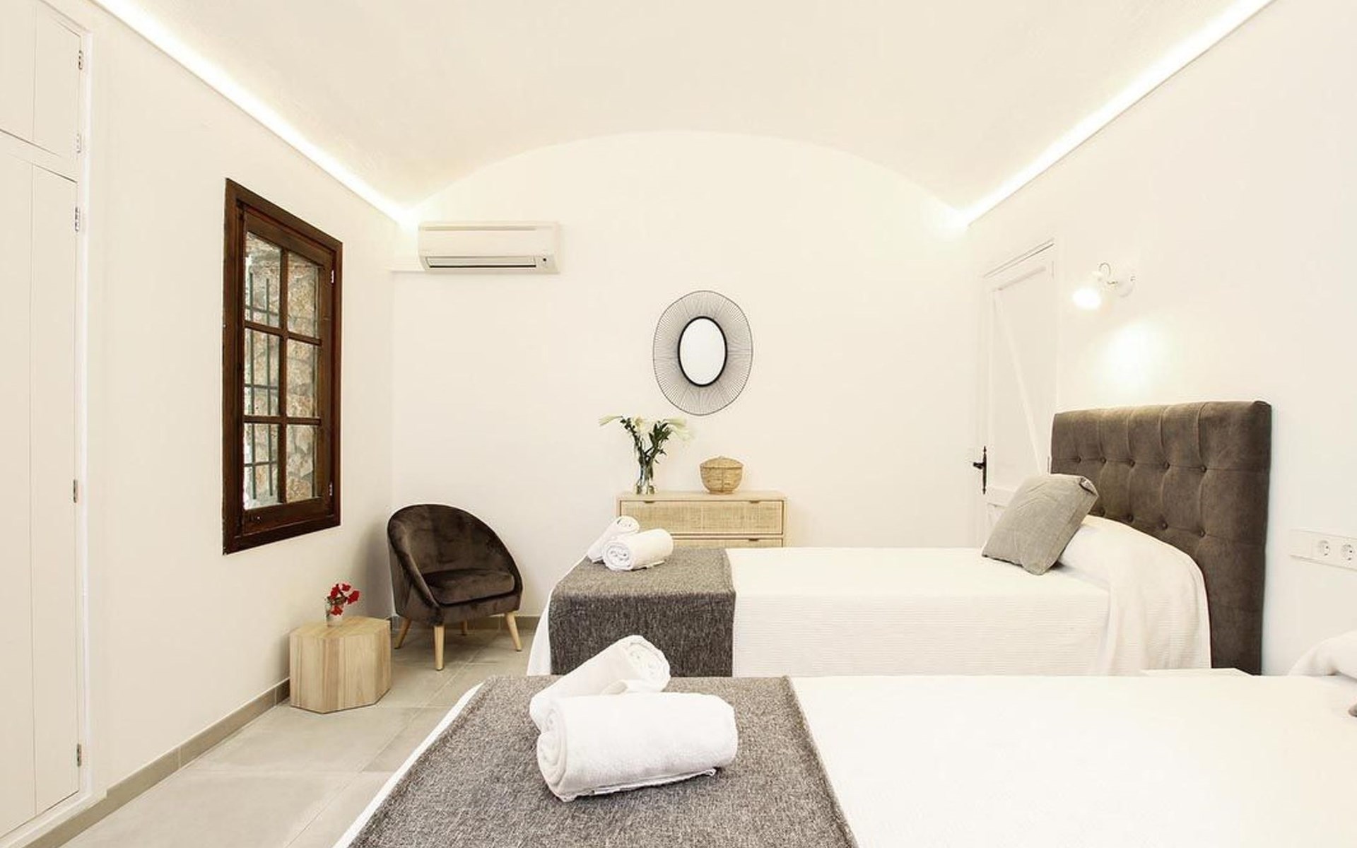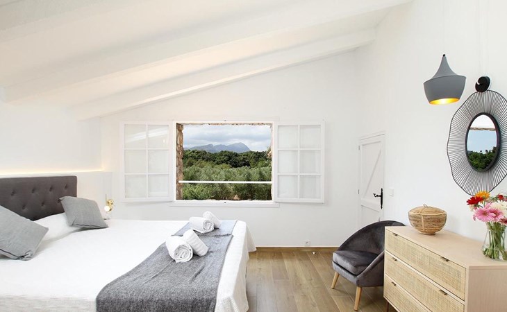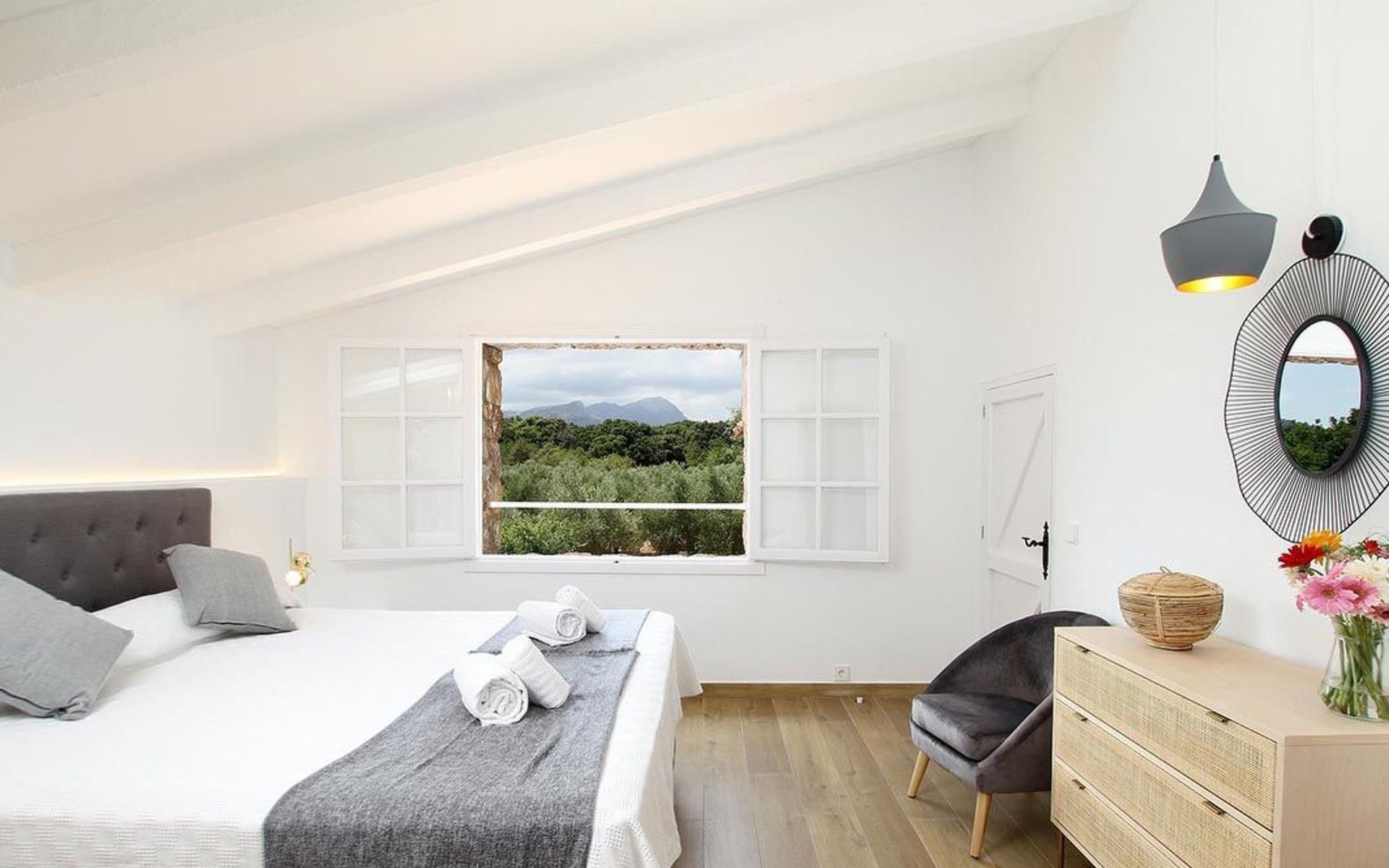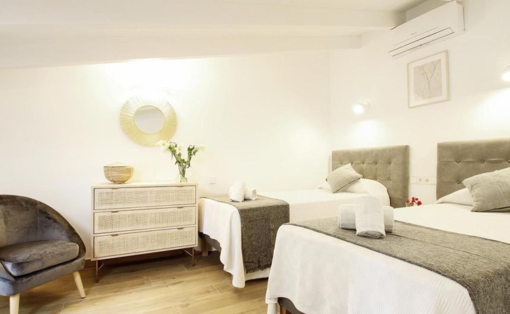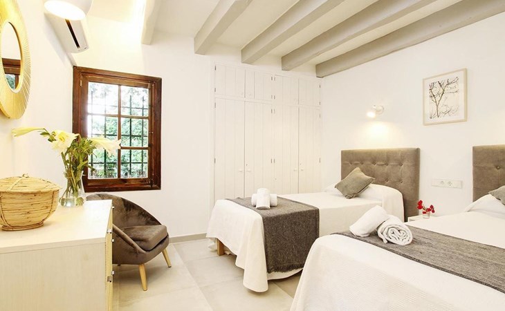Eine Treppe führt in das Obergeschoss, wo sich die restlichen Schlafzimmer befinden: ein Doppelzimmer mit eigenem Bad und Dusche und ein Zweibettzimmer. Das Zweibettzimmer bietet einen schönen Blick auf die Berge Puig de Maria und Puig Tomir. Alle Zimmer verfügen über eine Klimaanlage ohne Zeitbeschränkung.