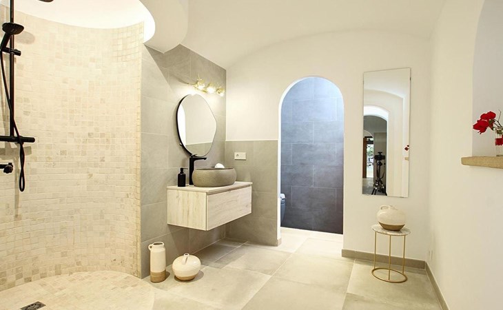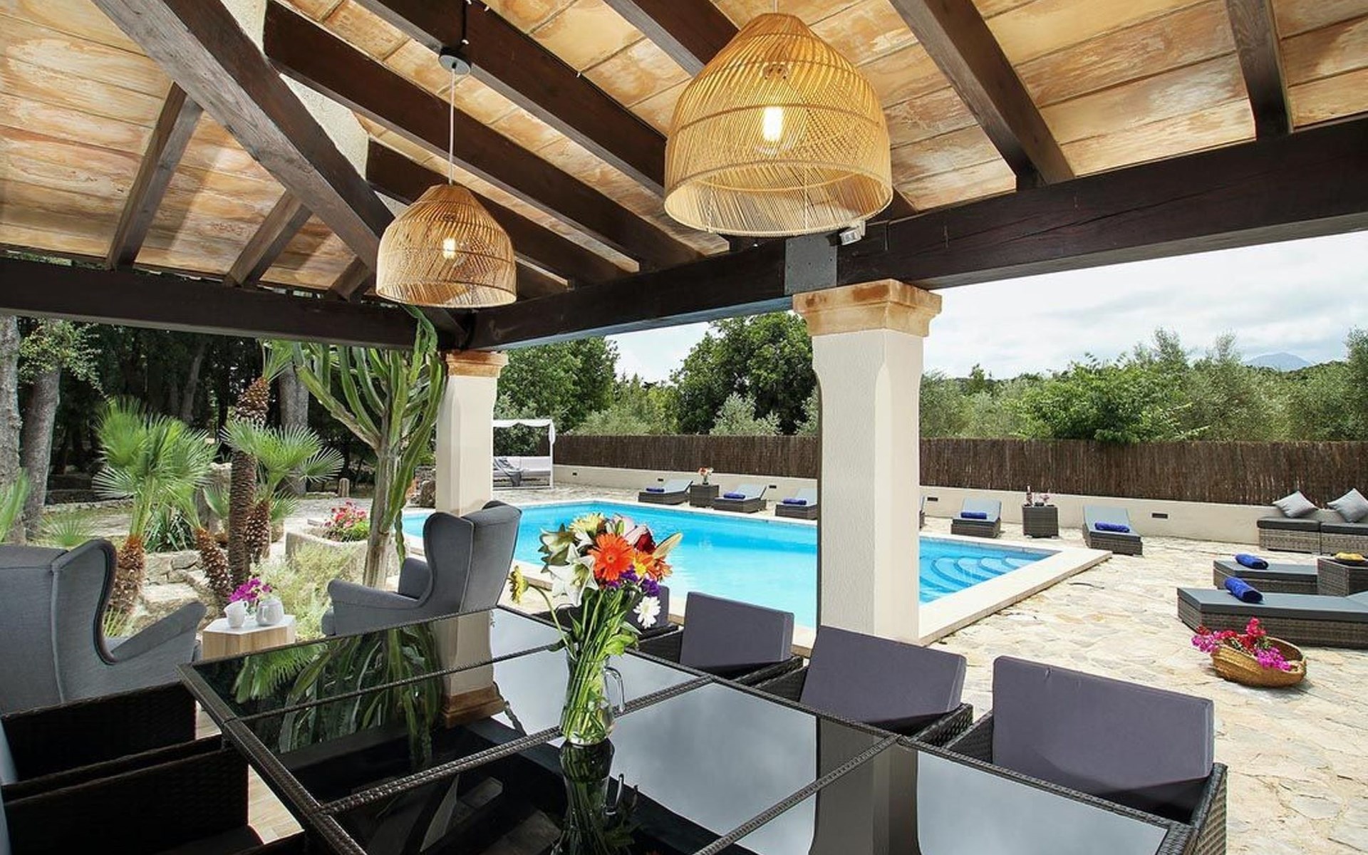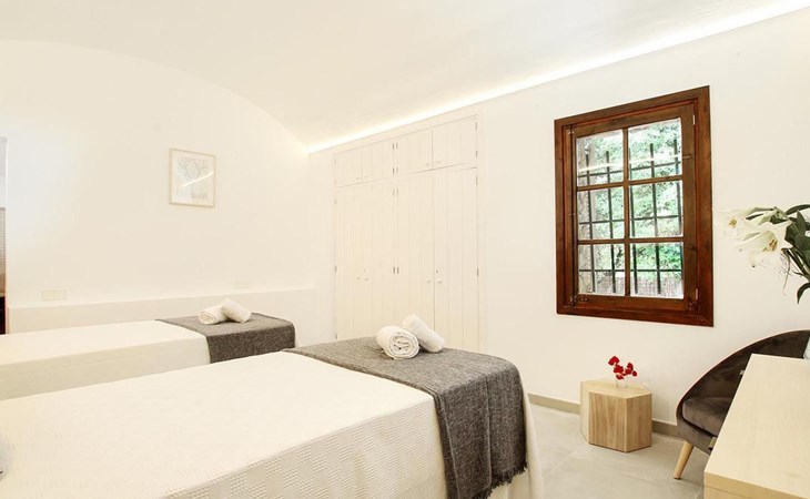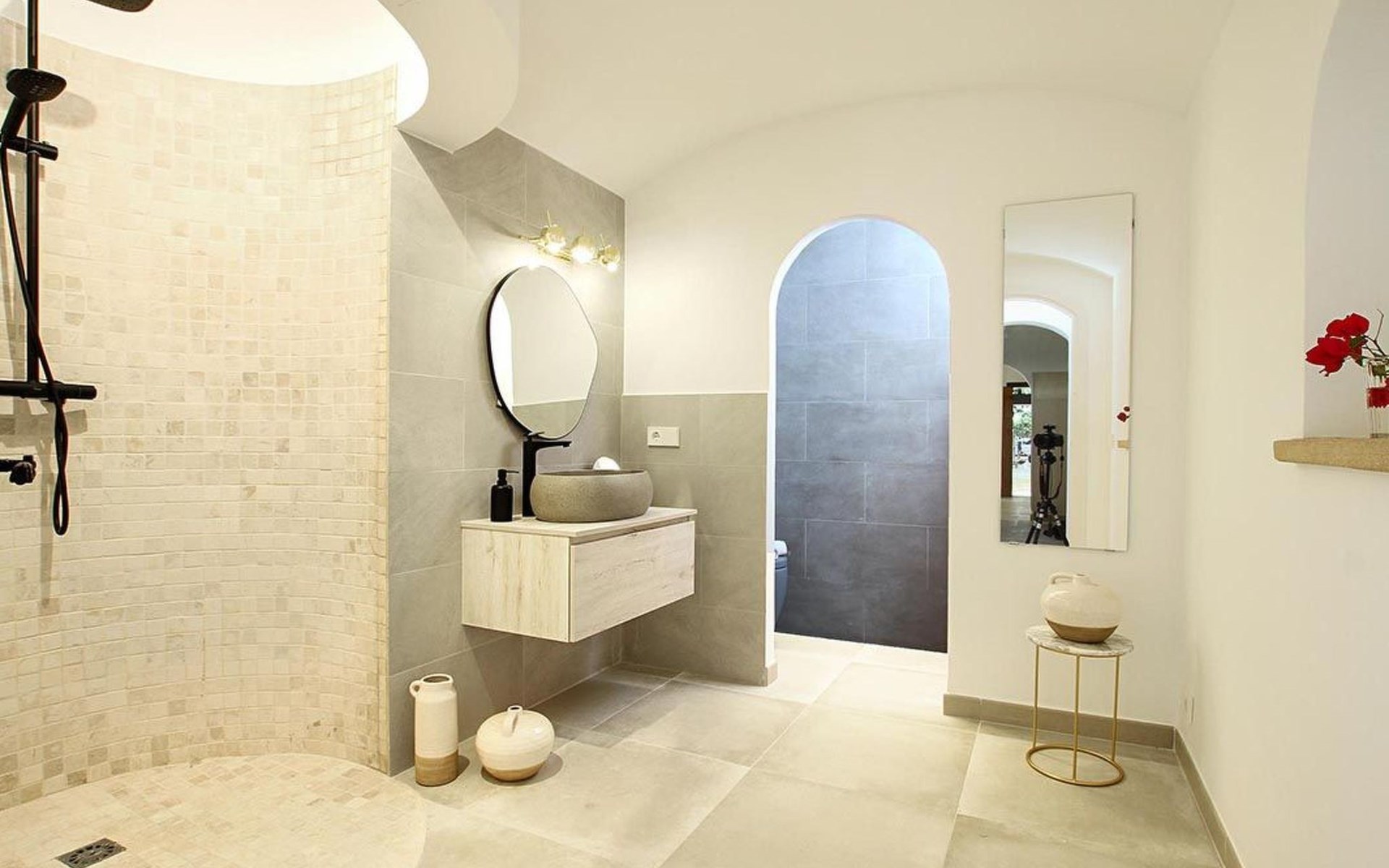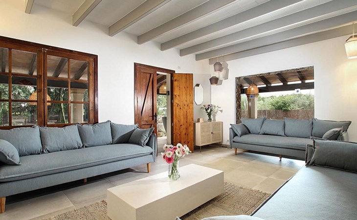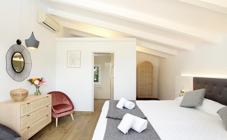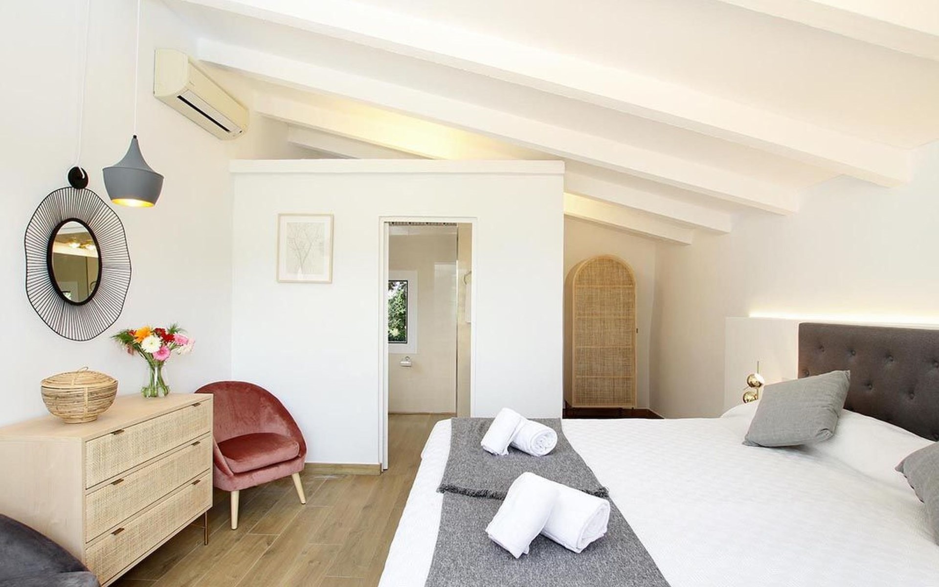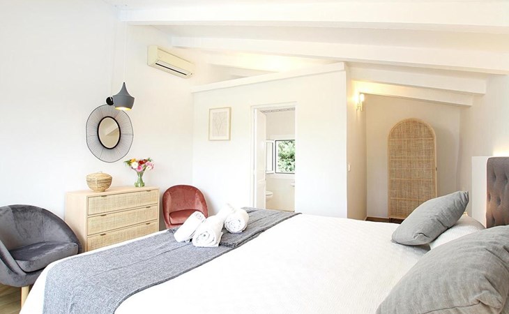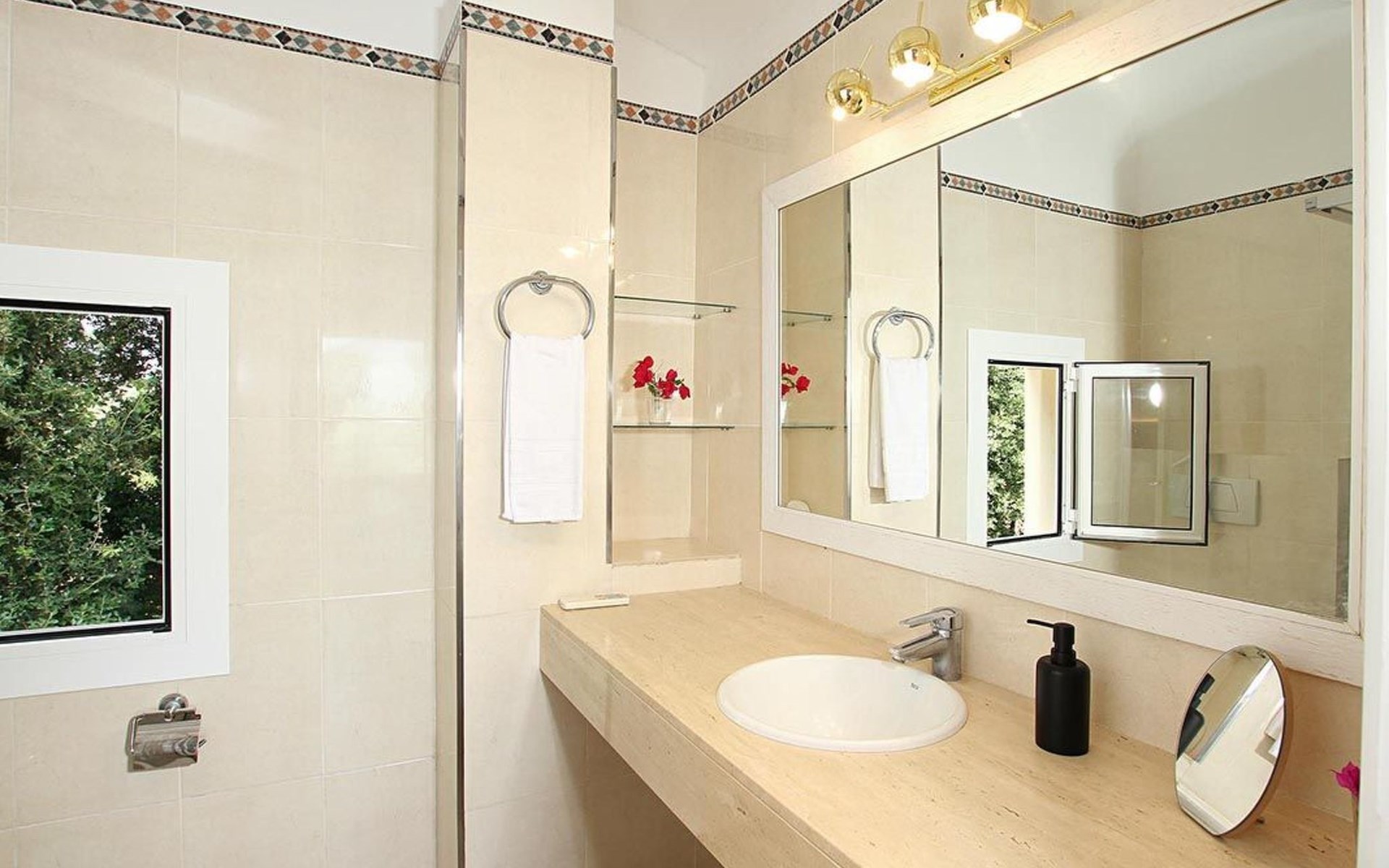 Eine Treppe führt in das Obergeschoss, wo sich die restlichen Schlafzimmer befinden: ein Doppelzimmer mit eigenem Bad und Dusche und ein Zweibettzimmer. Das Zweibettzimmer bietet einen schönen Blick auf die Berge Puig de Maria und Puig Tomir. Alle Zimmer verfügen über eine Klimaanlage ohne Zeitbeschränkung.