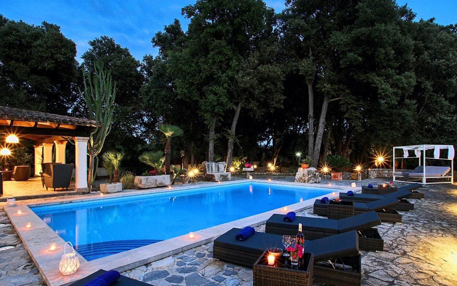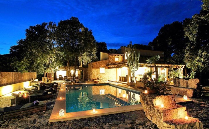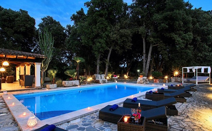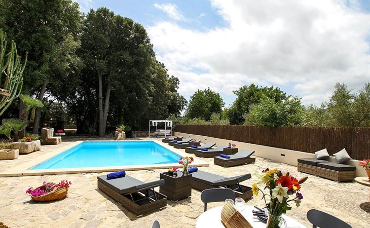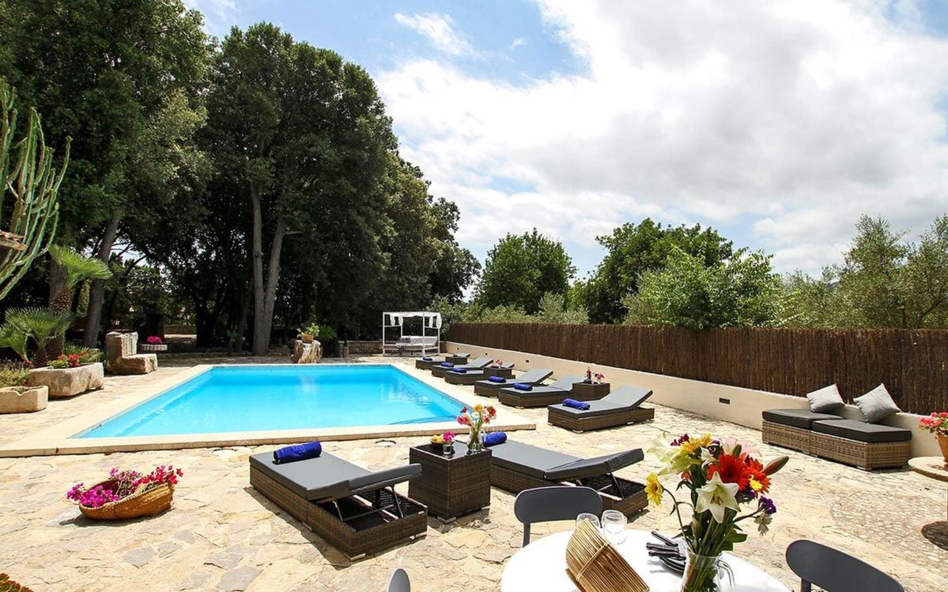 Der rechteckige Swimmingpool von mehr als 50 m2 hat eine römische Treppe, Plätze für Sonnenliegen und einen Bereich für ein balinesisches Bett.