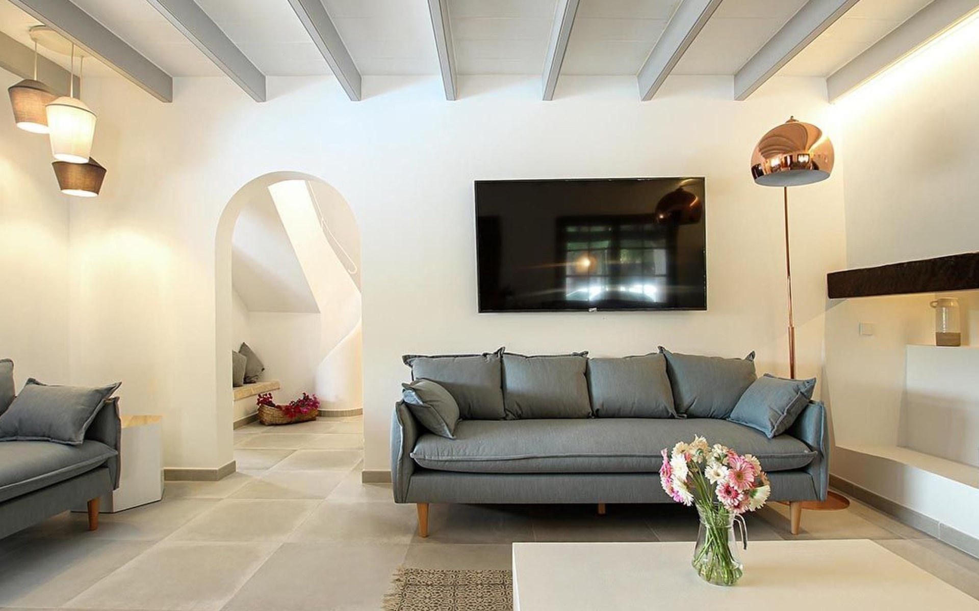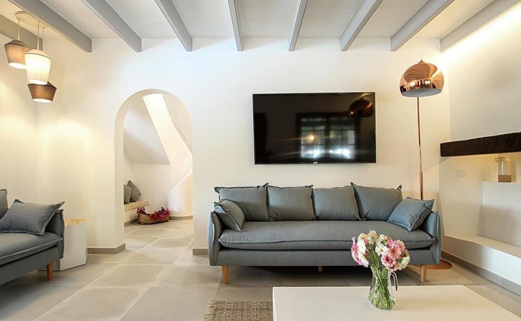 Vom Parkplatz aus führt eine Steintreppe hinauf auf die Terrasse, wo sich der Haupteingang des Hauses befindet. Von hier aus betreten Sie das Wohnzimmer, das mit Sofas ausgestattet ist, auf denen Sie einen Film auf dem beeindruckenden 65-Zoll-Bildschirm genießen können. Der Smart-TV ist mit drahtloser Internetverbindung vorbereitet, so dass die Gäste ihre Amazon, Netflix und andere Plattformen Konten genießen können.