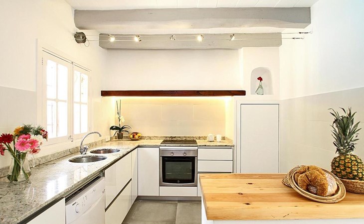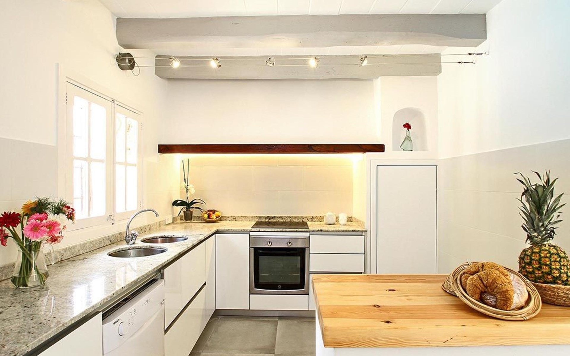Vom Wohnzimmer aus führt ein Bogengang zu einem Flur, der mit der Küche verbunden ist, von der aus man auch Zugang zur überdachten Terrasse hat. Die Küche ist voll ausgestattet und hat einen schönen Tisch mit 8 Stühlen für die Tage, an denen es einladender ist, im Haus zu essen.