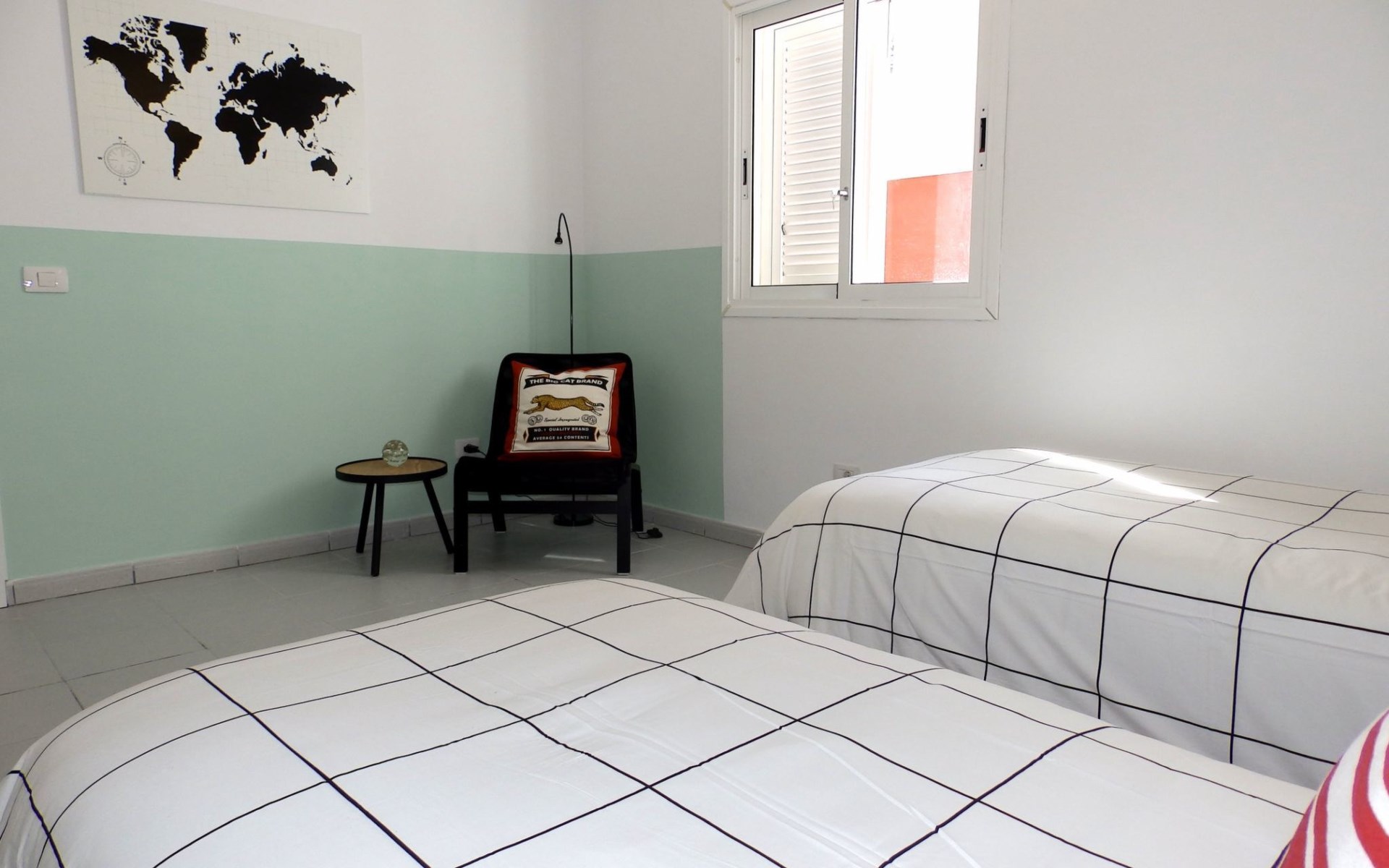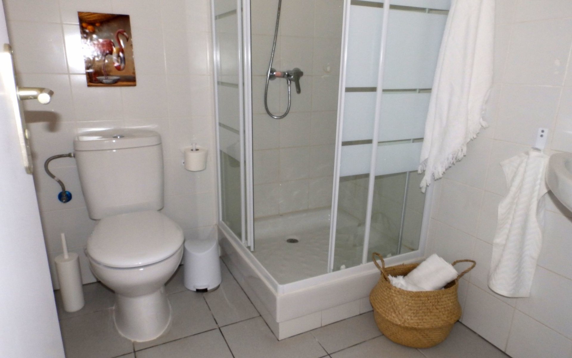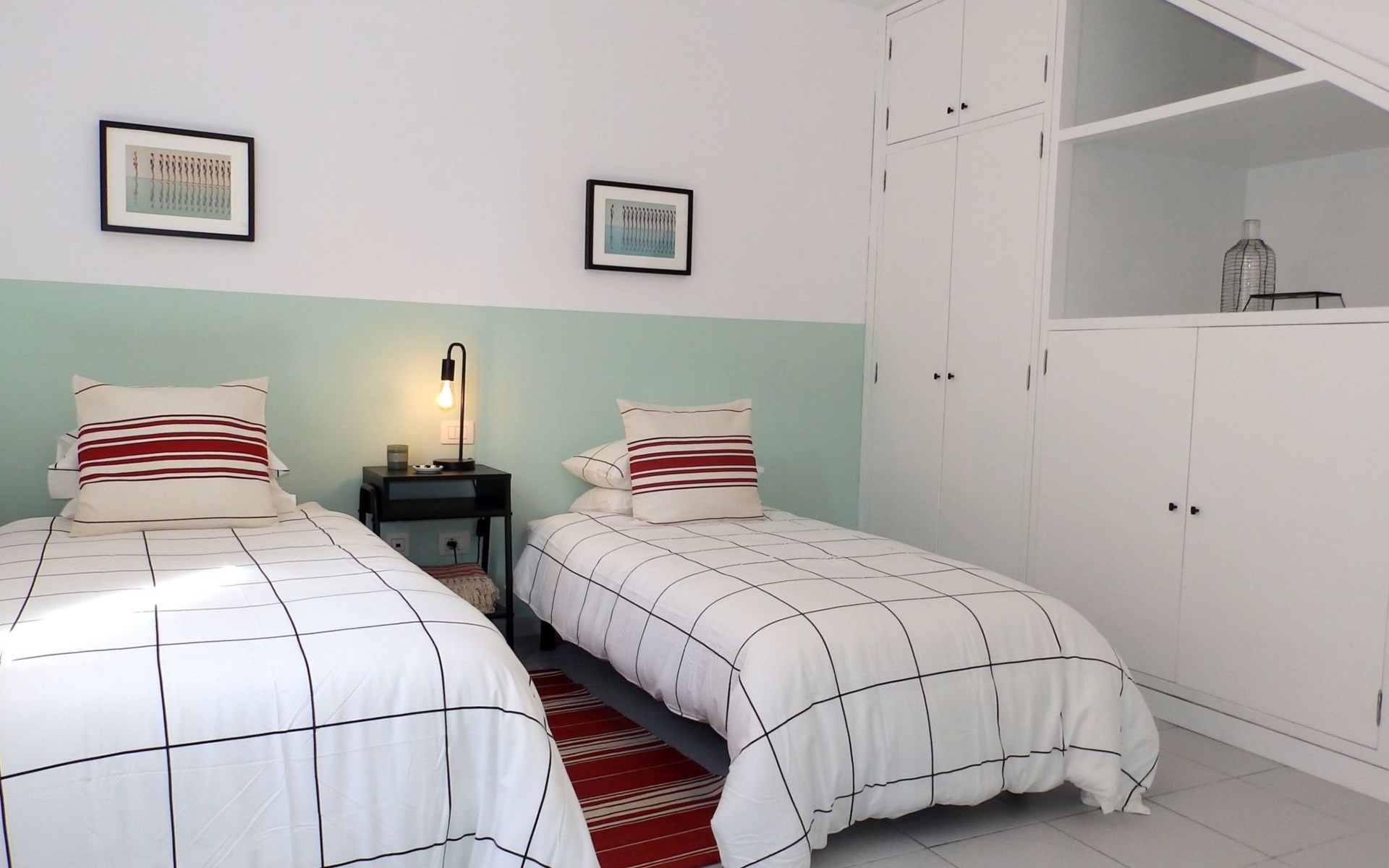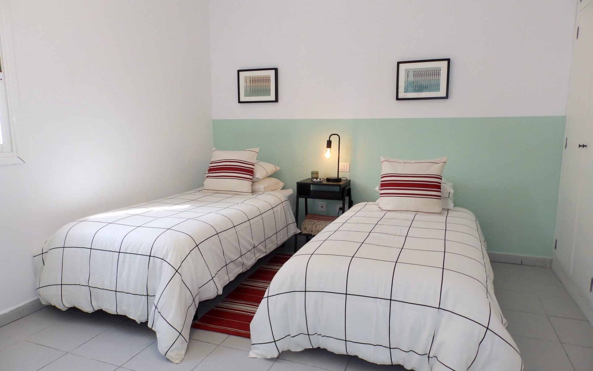 Untere Etage: zwei Schlafzimmer, eines mit einem Doppelbett und das andere mit zwei Einzelbetten, sowie ein komplettes Badezimmer mit Dusche und Waschmaschine. Außerdem gibt es einen praktischen Abstellraum, der sich perfekt für die Aufbewahrung von Sportgeräten wie Windsurf- oder Kitesurfbrettern eignet.