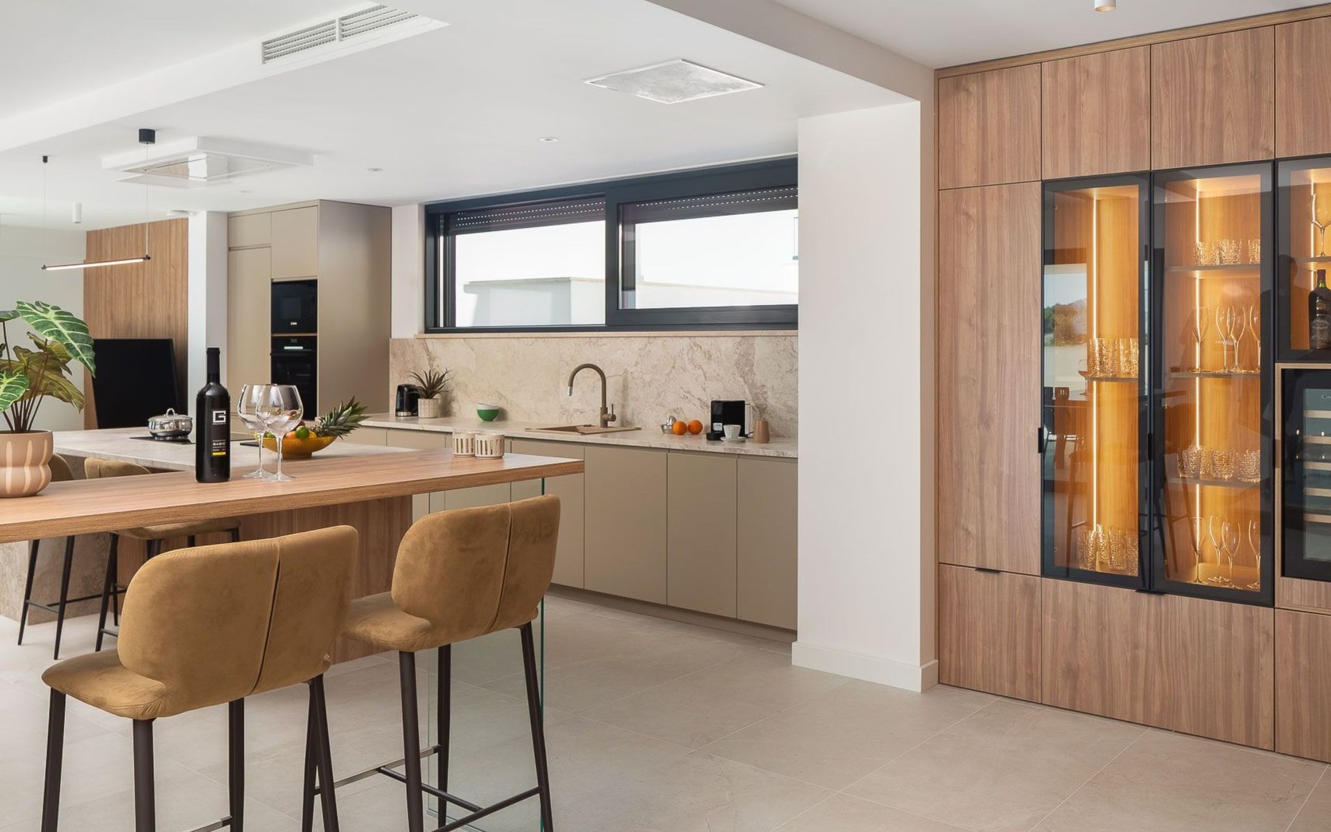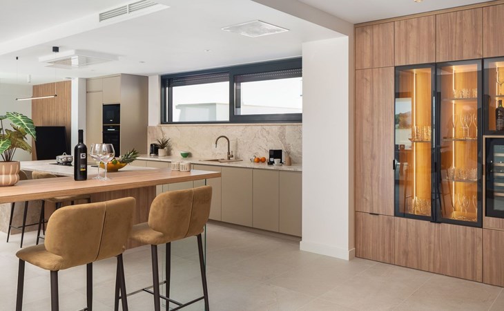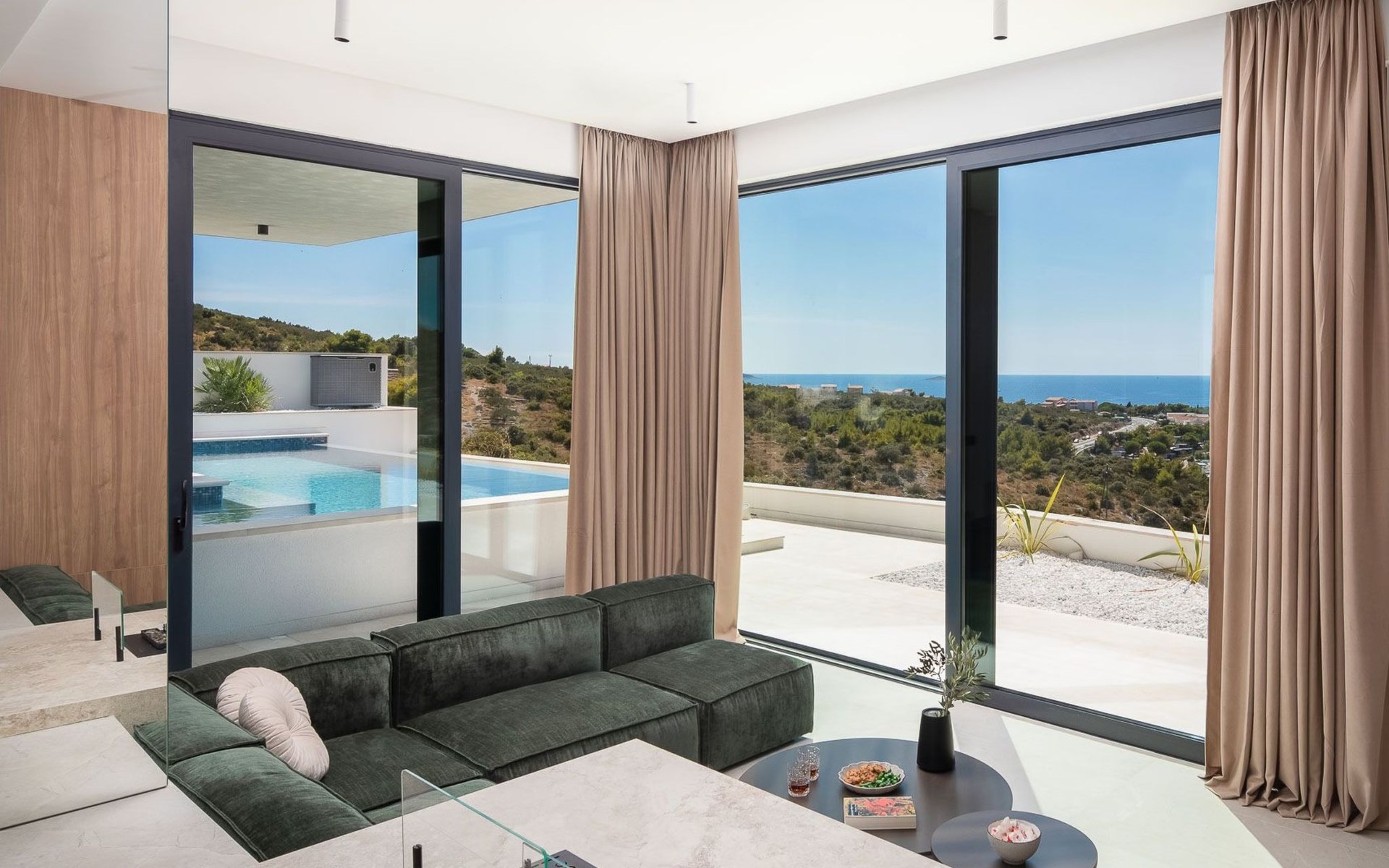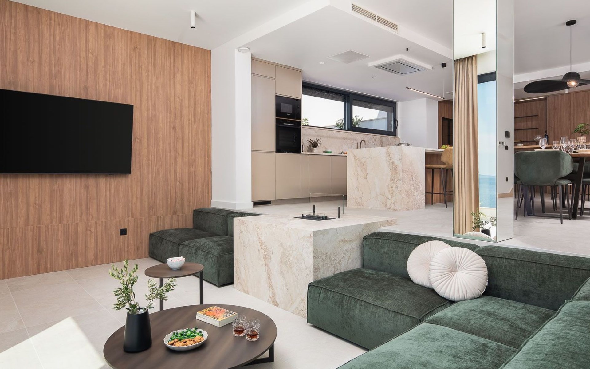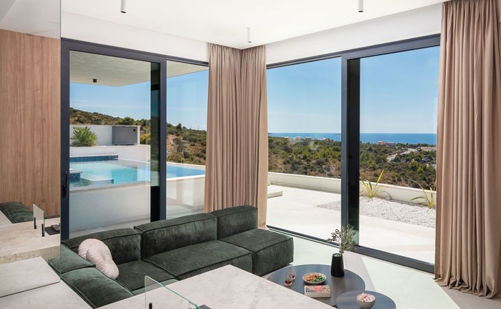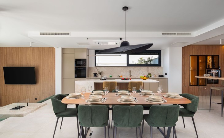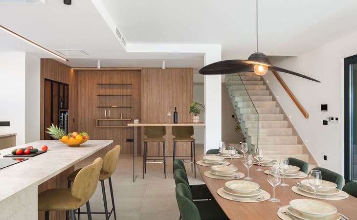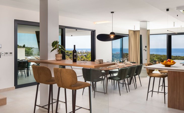 Das Innere der Villa bietet eine umfassende Ausstattung, die Ihren Aufenthalt zu einem luxuriösen Erlebnis macht. Alle Zimmer sind mit Fußbodenheizung und Klimaanlage ausgestattet, so dass Sie sich unabhängig von der Jahreszeit wohlfühlen. Eine voll ausgestattete Küche mit Geschirrspüler, Kaffeemaschine und Kaffeekapseln/Pods ermöglicht die problemlose Zubereitung von Mahlzeiten. Zu den weiteren Annehmlichkeiten gehören eine Waschmaschine und ein Wäschetrockner zur alleinigen Nutzung im Haus, so dass Sie alle praktischen Annehmlichkeiten wie zu Hause zur Hand haben.