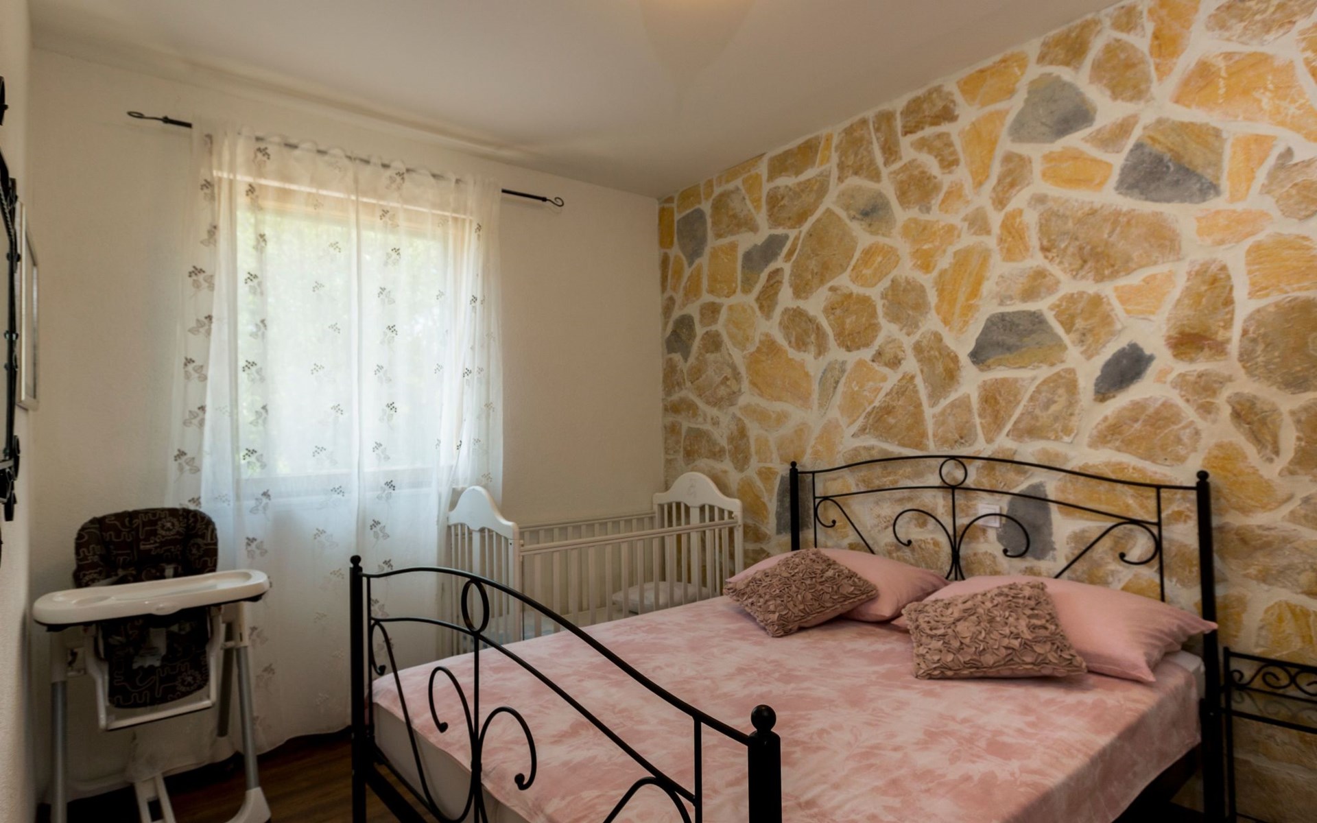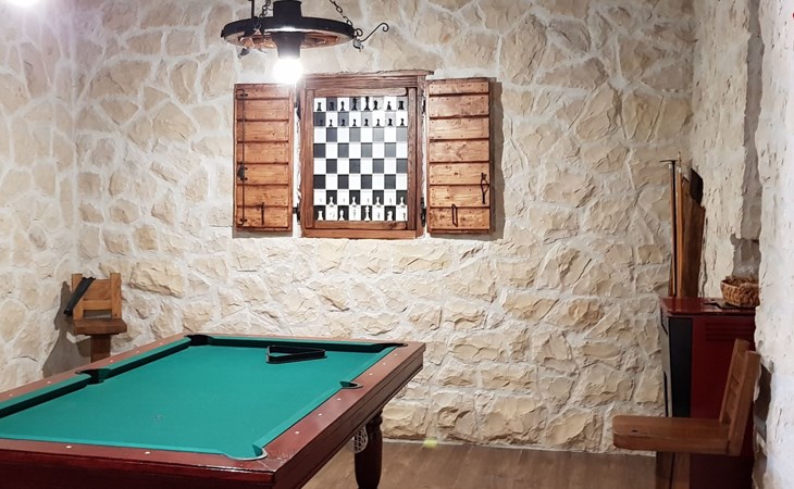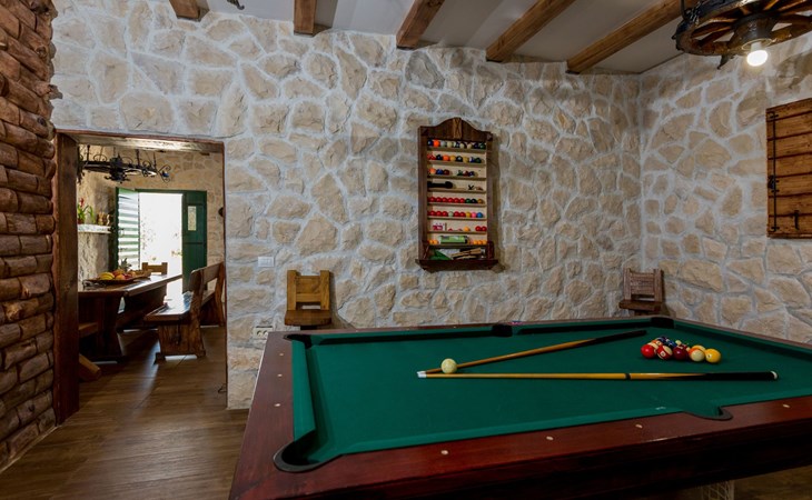 Die Luxusvilla Heaven Nr. 2 verfügt über 3 Etagen. Im Erdgeschoss befindet sich ein 75 m2 großes Wohnzimmer (dalmatinische Stein-/Holzkonstruktion „Konoba“) mit luxuriöser Innenausstattung, großem Billardtisch, luxuriösen Sitzmöbeln, großem Flachbildfernseher und Audiosystem sowie Esstisch. Es bietet den Gästen einen großartigen Ort für Spaß und Party den ganzen Tag und die ganze Nacht. Auf dieser Etage gibt es auch ein Badezimmer. Die Villa wurde 2018 komplett renoviert. Am 1. Im Erdgeschoss befinden sich: große neue, voll ausgestattete Küche, 2 Schlafzimmer, Badezimmer und Wohnzimmer. Es verfügt über einen Kamin für den Winter und eine Klimaanlage für den Sommer. Der große Balkon (30 m2) auf dieser Etage bietet eine Lounge-Sitzgarnitur im Freien und einen großen Küchentisch, sodass die Gäste im Freien zu Mittag essen oder einfach nur Platz zum Genießen mit Blick auf den Pool und die Umgebung rund um das Haus haben können.
