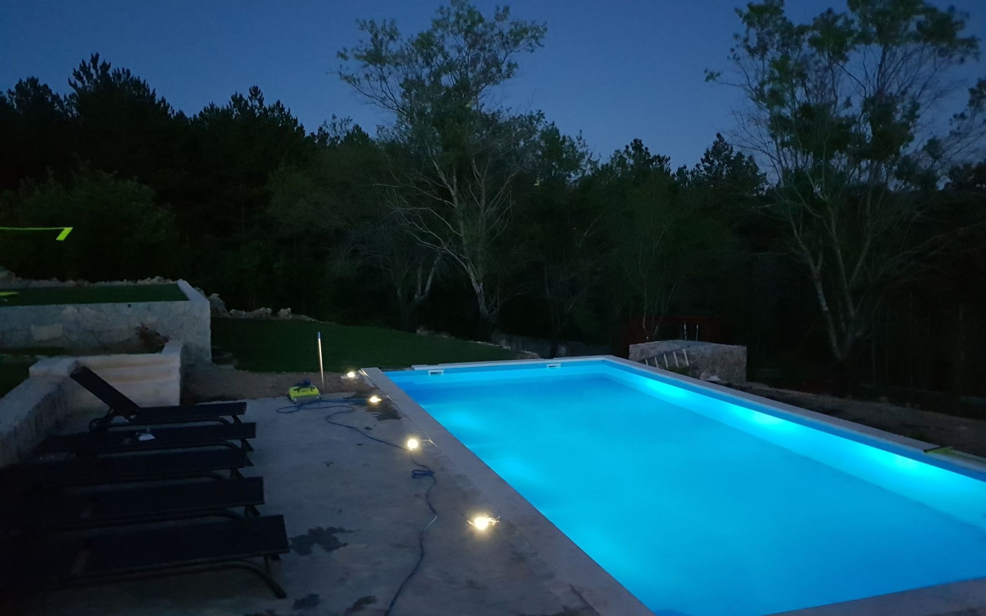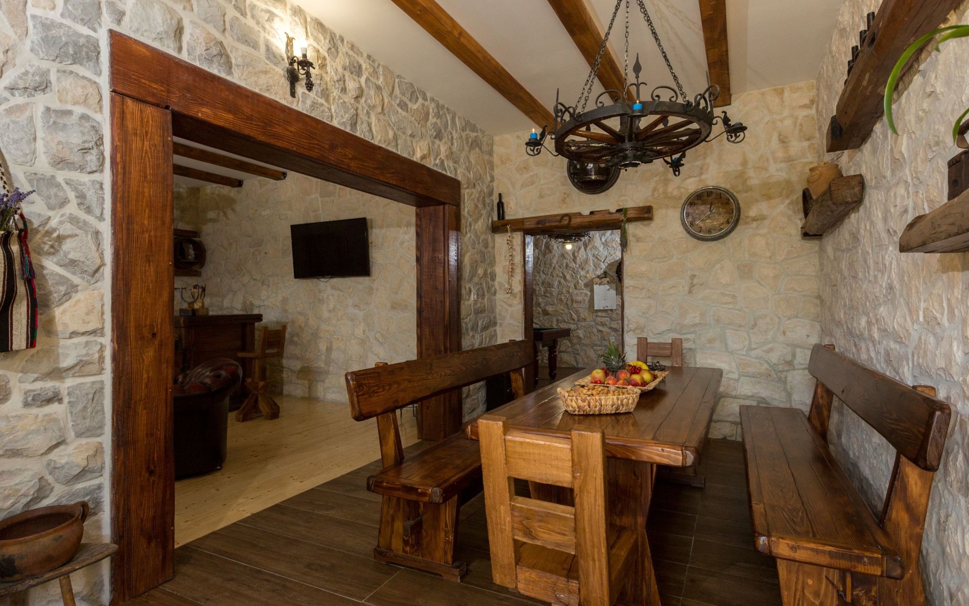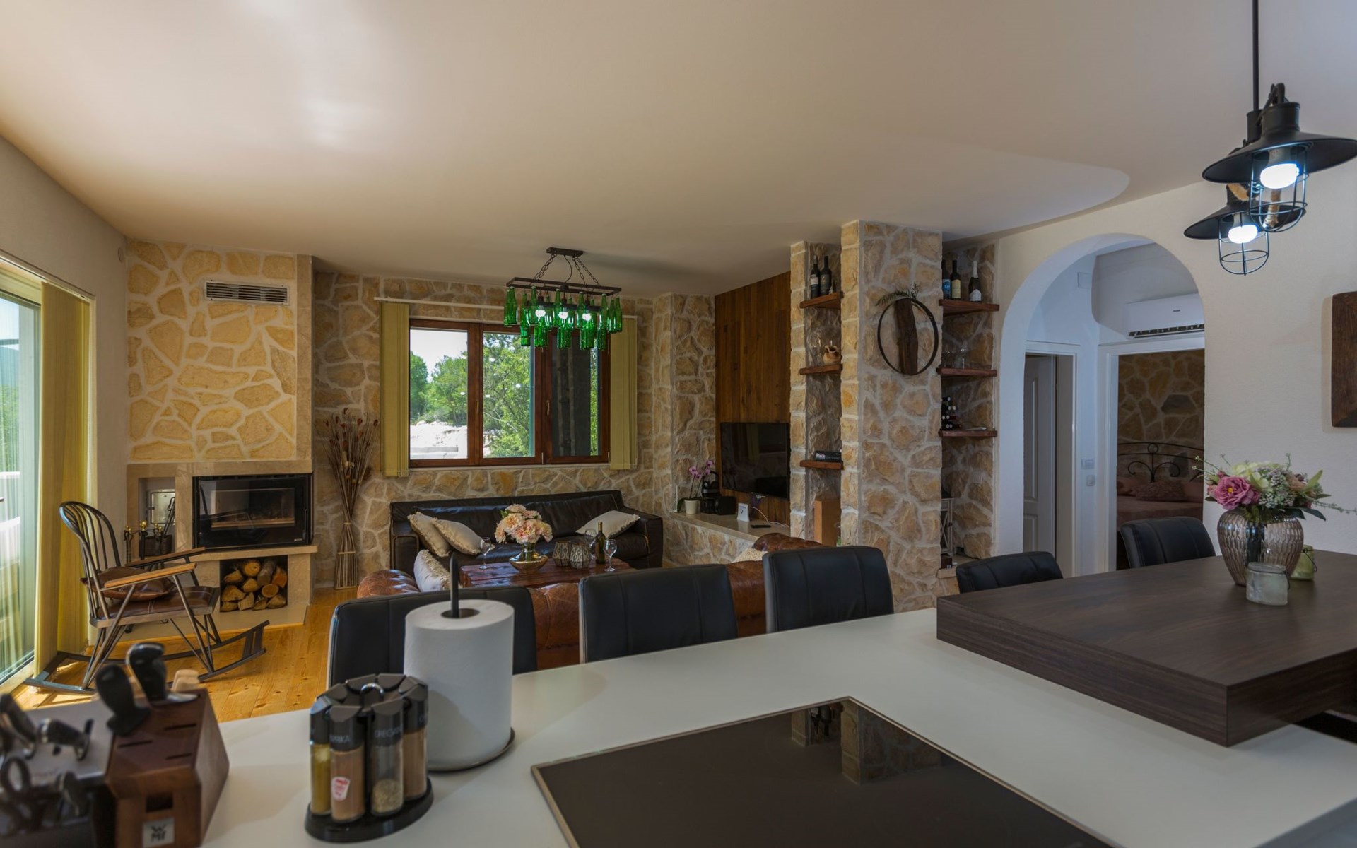 Die Villa wurde 2018 im traditionellen Stil renoviert. Es verfügt über 240 m2, auf 3 Etagen mit voll ausgestatteter Küche, 5 Schlafzimmern, 3 Badezimmern, 2 Wohnzimmern (75 m2 + 20 m2) und Balkon. Im Erdgeschoss befindet sich ein 80 m2 großer Wohn-/Partyraum (Konoba) mit Innenausstattung aus Stein-/Holzmaterialien. Ein großer Billardtisch, luxuriöse Sitzmöbel, ein großer Flachbildfernseher und ein Audiosystem mit Karaoke + Esstischgarnitur bieten den Gästen einen großartigen Ort für Spaß und Party den ganzen Tag und die ganze Nacht. Auf dieser Etage befindet sich eine Toilette. Im 1. Stock gibt es: große neue, voll ausgestattete Küche, 2 Schlafzimmer, Badezimmer und Wohnzimmer. Es verfügt über einen Kamin für den Winter und eine Klimaanlage für den Sommer. Der große Balkon (30 m²) bietet eine Lounge-Sitzgarnitur im Freien und einen großen Küchentisch, sodass Gäste im Freien zu Mittag essen oder einfach nur den Blick auf den Pool und die Umgebung rund um das Haus genießen können. Im 2. Stock gibt es 3 große Schlafzimmer und ein großes Badezimmer mit Whirlpool.