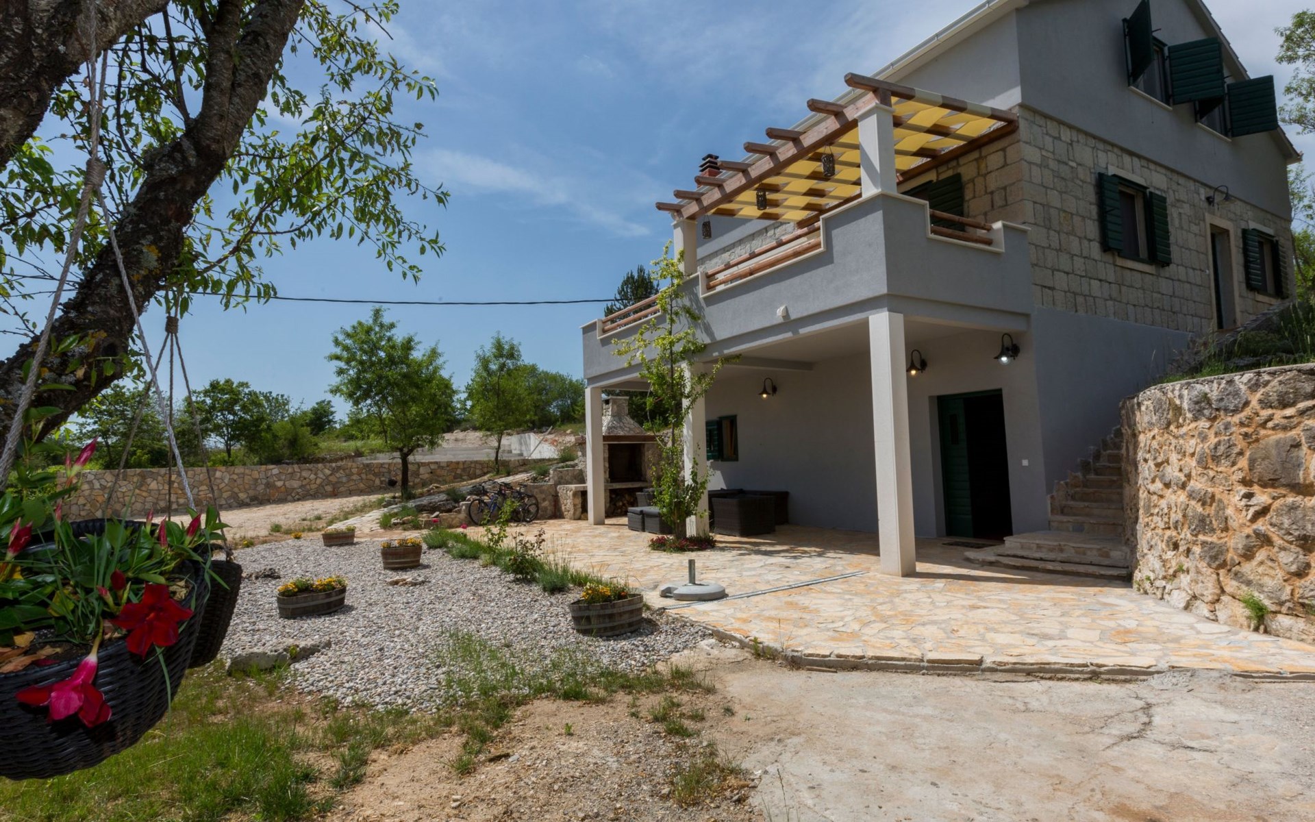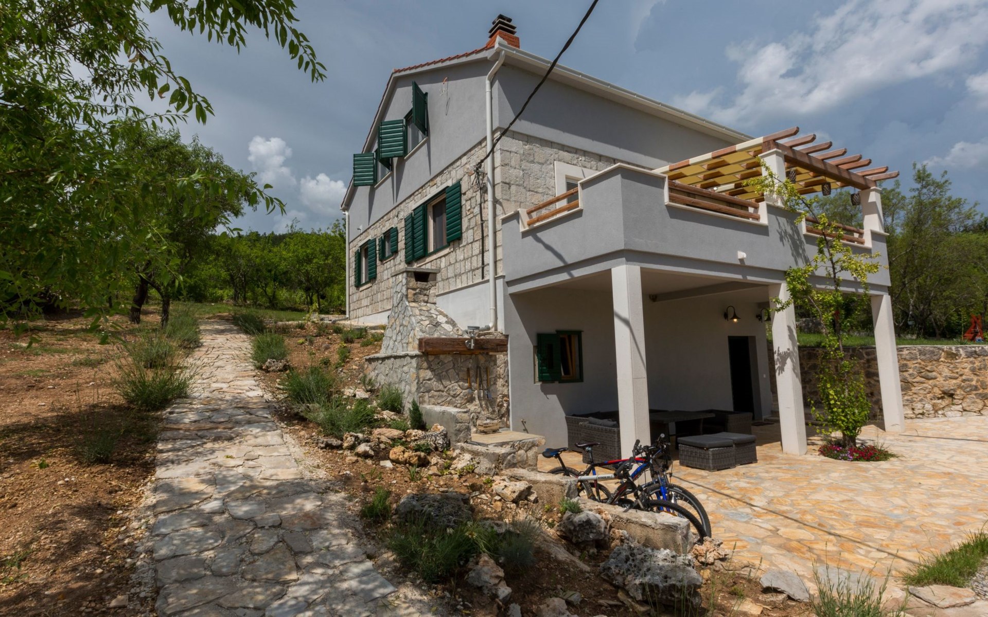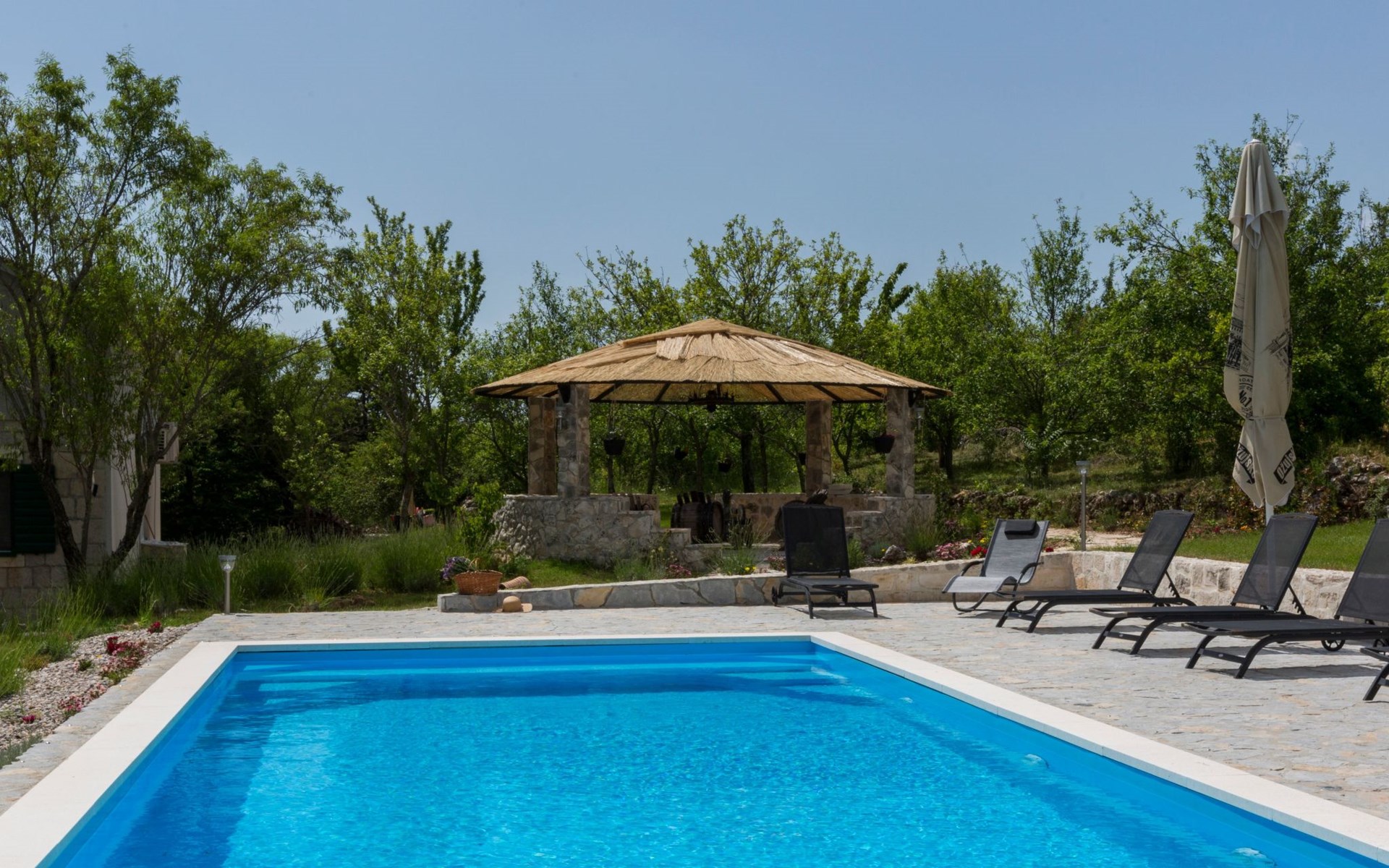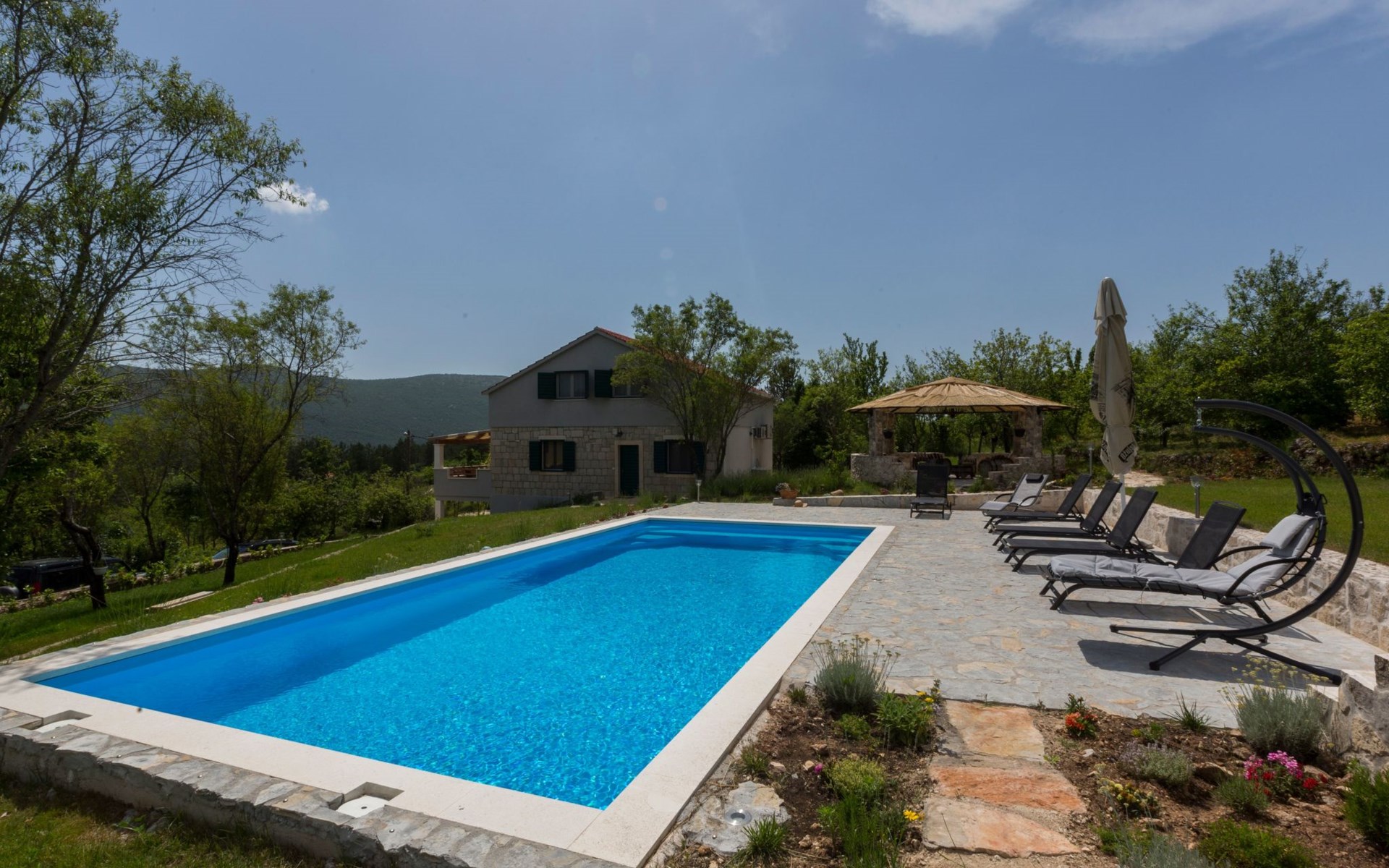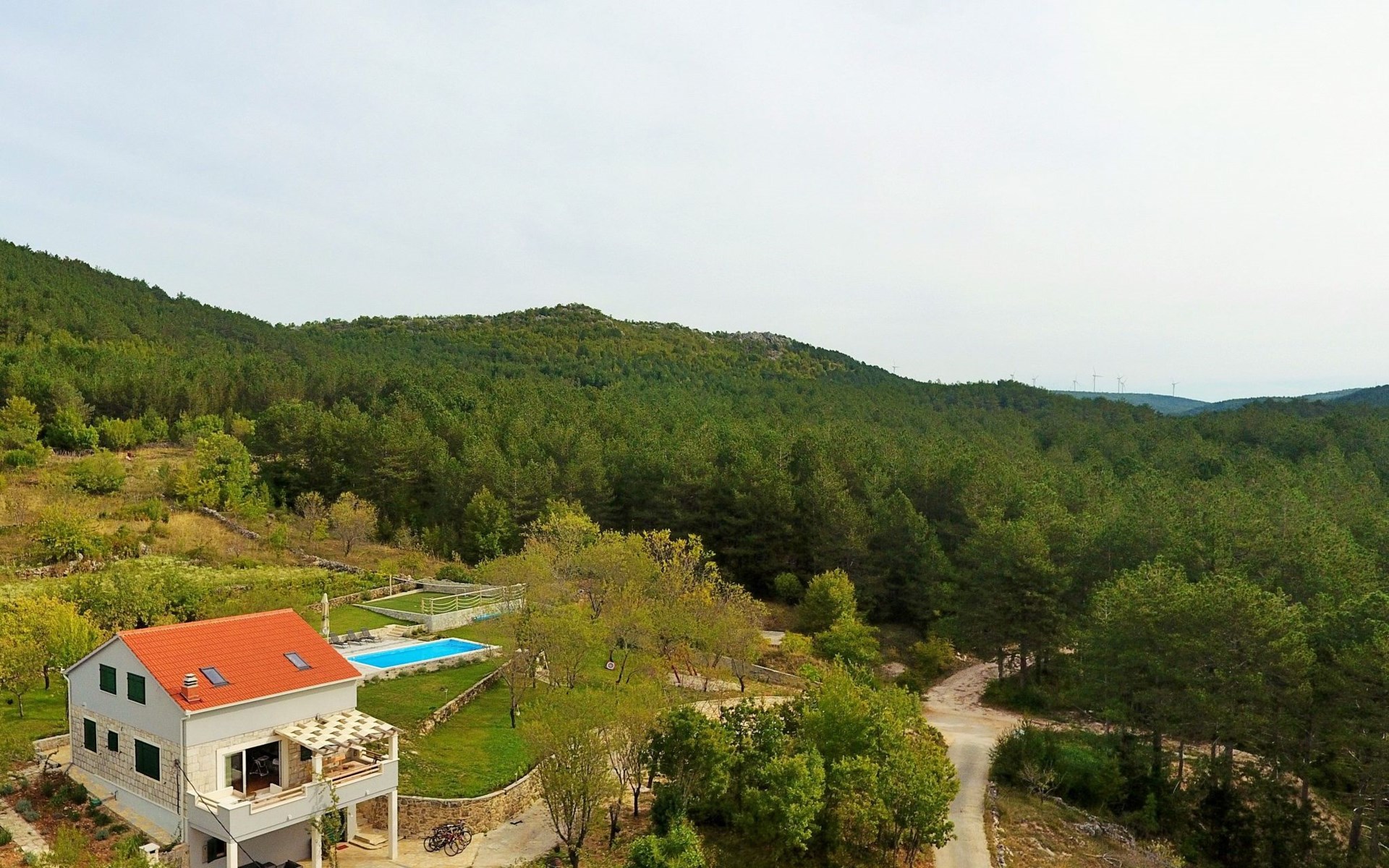 Etwas außerhalb des Dorfes, in der Nähe eines großen Pinienwaldes, bietet die Villa viel Privatsphäre und Vergnügen. Die Villa liegt direkt neben der Mountainbike-Wald-Offroad-Strecke, die mehr als 22 km lang ist. Das Haus ist nur 25 Autominuten von Split, den Meeres- oder Flussstränden entfernt. Die Villa bietet alles, was Gäste für einen schönen, ruhigen und sehr privaten Urlaub im dalmatinischen Hinterland benötigen. Alle Städte in Mitteldalmatien sind in 30 bis 60 Minuten mit dem Auto zu erreichen, so dass Sie sie während des Tagesansturms alle sehen können und dennoch Ihren eigenen privaten Luxusort zum Entspannen mit Familie und Freunden am großen Pool haben.