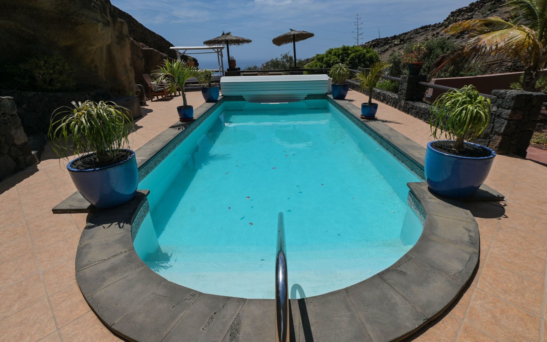 Der Außenbereich des Anwesens ist sorgfältig gestaltet, um Ruhe und Intimität mit der Natur zu bieten. Ein solarbeheizter Swimmingpool, ein üppiger Garten, eine einladende Terrasse und eine Auswahl an Gartenstühlen und Liegestühlen bilden den perfekten Rahmen für Gäste, die atemberaubende Sonnenuntergänge, einladende Sonnenaufgänge und einen ruhigen Blick auf das Meer genießen möchten. Dieser Raum fördert eine harmonische Mischung aus Entspannung und Romantik inmitten der atemberaubenden Umgebung des Anwesens.