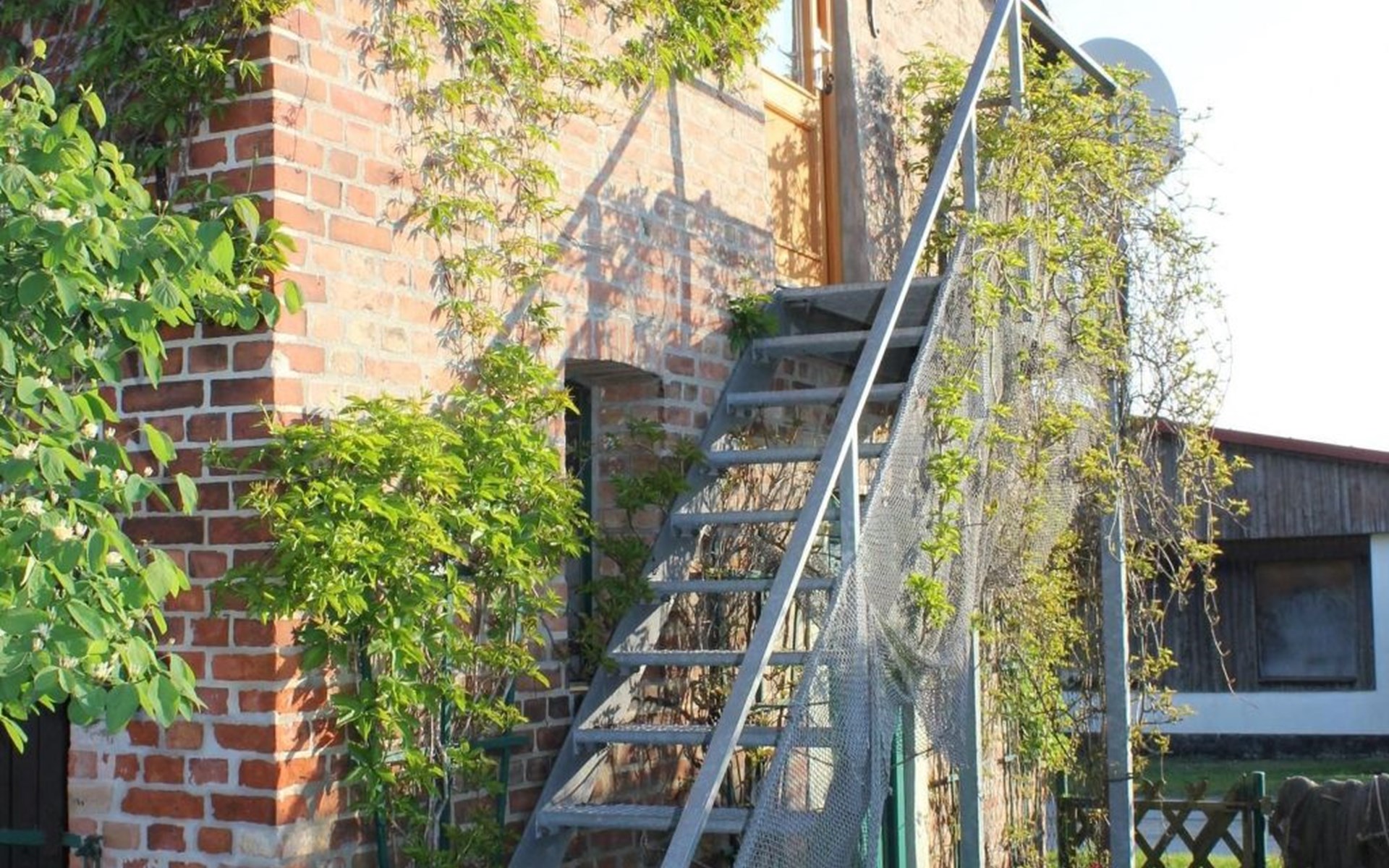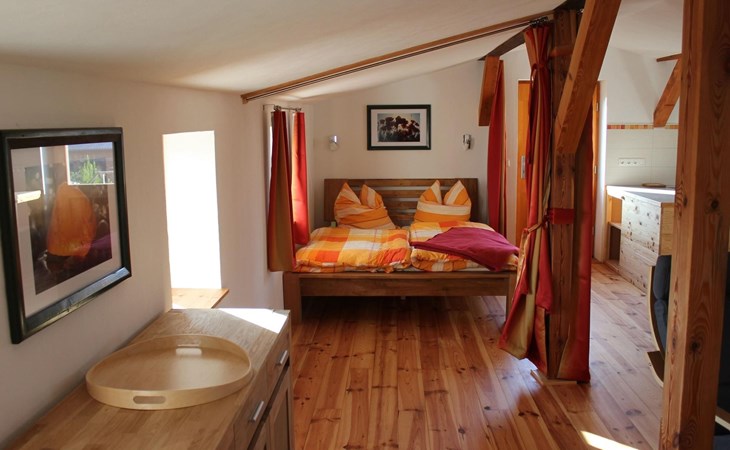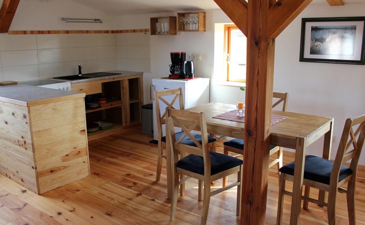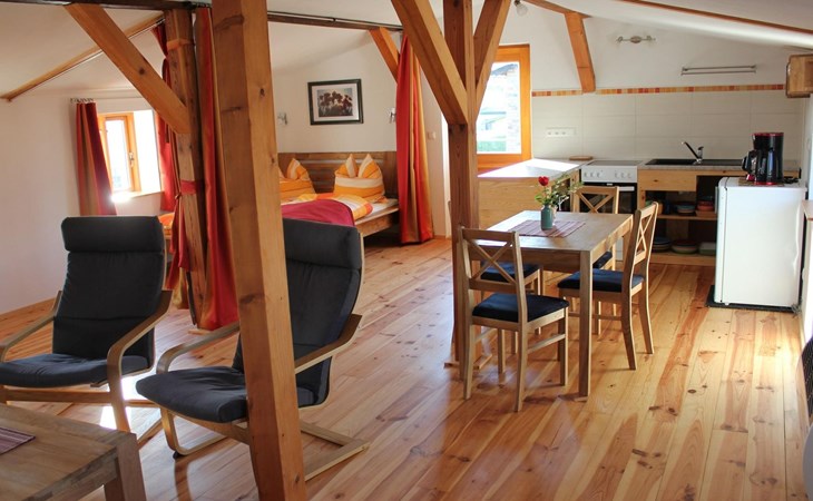 Sie befindet sich in der oberen Etage im sanierten Nebengebäude unseres Hofes und bietet Platz für zwei Erwachsene und zwei Kinder.